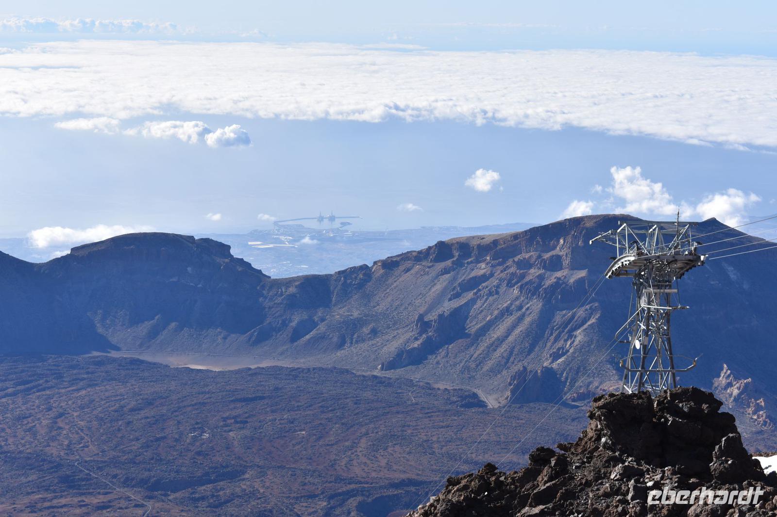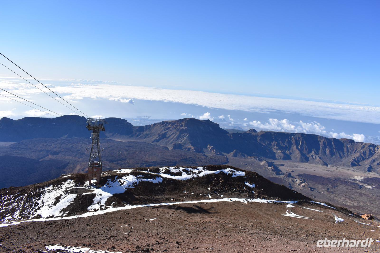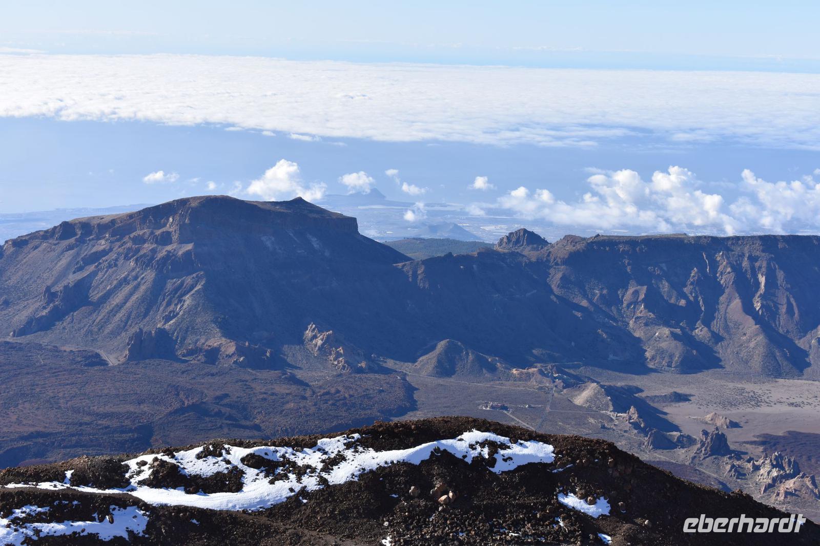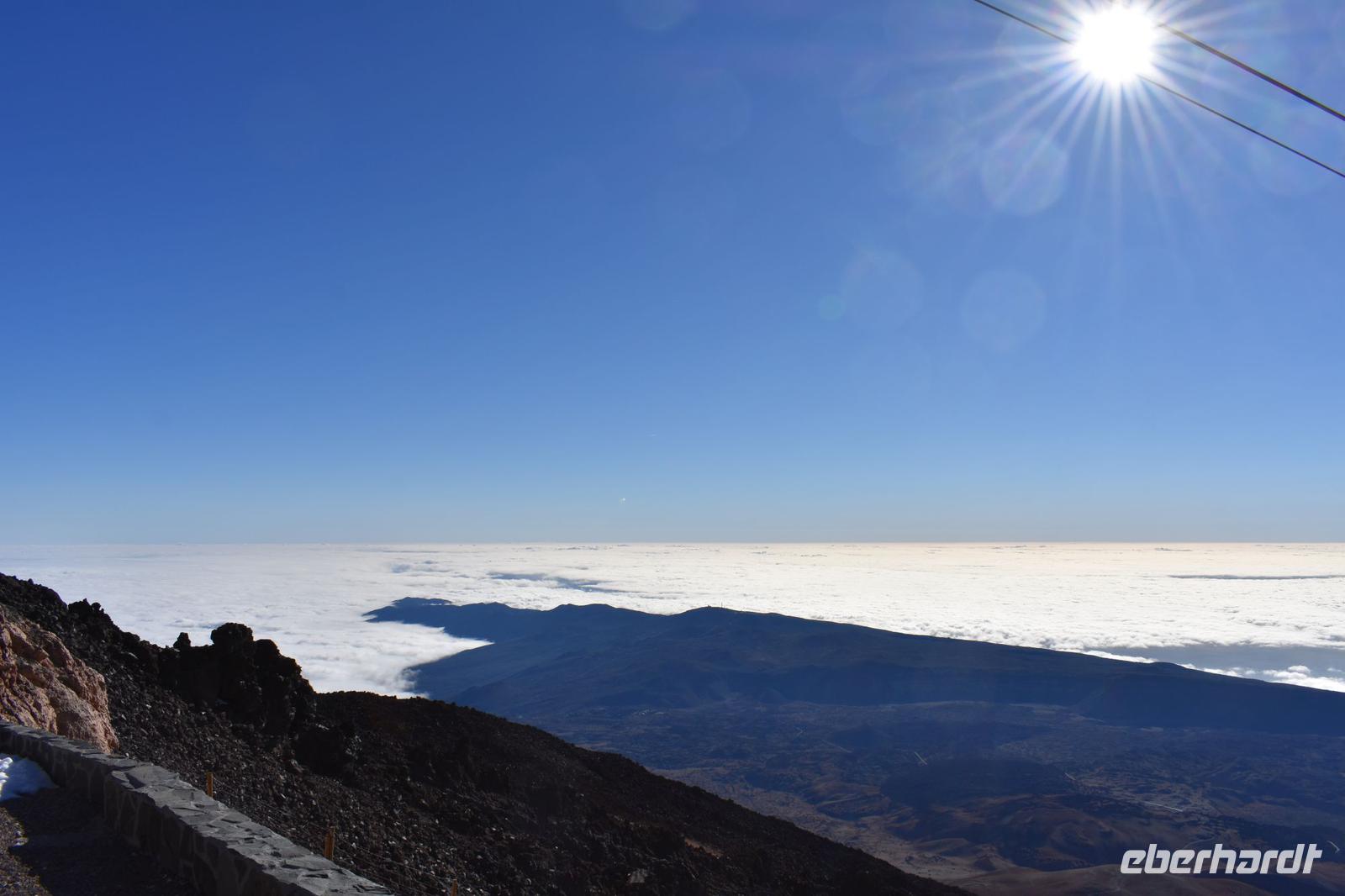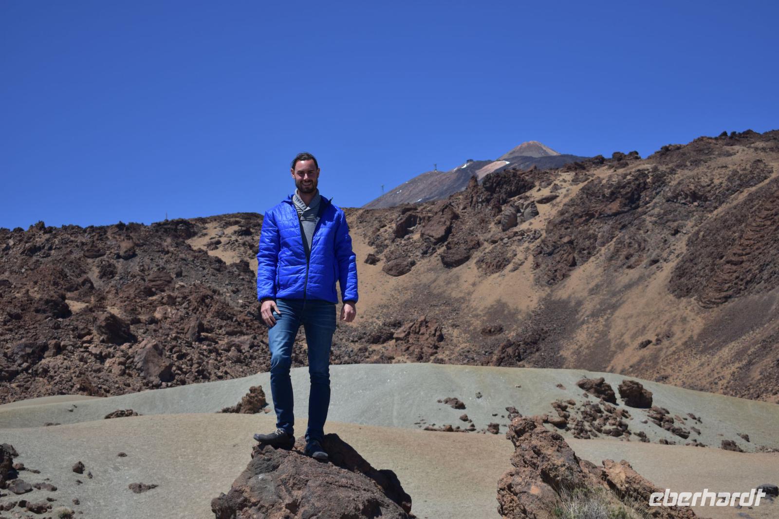 Es ging nach ganz oben! Am Morgen fuhren wir mit dem Bus über das Örtchen Chio zum Nord-Ost Eingang in den Nationalpark El Teide. Auf unserem Weg begleitete uns eine unbegreifliche Lava-Landschaft die von steinbrechenden Kanarischen Kiefern bewachsen ist. In einigen Aussichtspunkten machten wir halt um diese erstaunliche Natur mit der Kamera einzufangen. An den Roques de García war erstaunlicherweise keine Menschenseele. Unsere Gruppe war ganz allein an den beliebten Felsen, die phantasievolle Gestalten verstecken. Von hier hatten wir einen schönen und klaren Blick auf den Gipfel des Teide. Nun wollten wir dem höchsten Berg Spaniens aber noch ein Stück näherkommen. Mit der Seilbahn ging es hinauf - von der Talstation, die sich auf 2.356 Meter befindet, bis auf 3.555 Meter über dem Meeresspiegel, 163 Höhenmeter unterhalb des Teide-Gipfels. Leider konnten wir uns nicht sehr weit dort oben bewegen, da alle Wege wegen Eis und Rutschgefahr gesperrt waren. Aber trotzdem hatte sich die Auffahrt gelohnt. Es war eisig-kalt dort oben und des zog ein kräftiger Wind. Es war nicht alles unter uns bewölkt, sodass wir sogar bis an die Küste sehen konnten. Etwas weiter hinten in den Wolken steckte ein großer dunkler Fleck. Wir sahen sogar Gran Canaria aus der weißen Wolkendecke herausgucken.