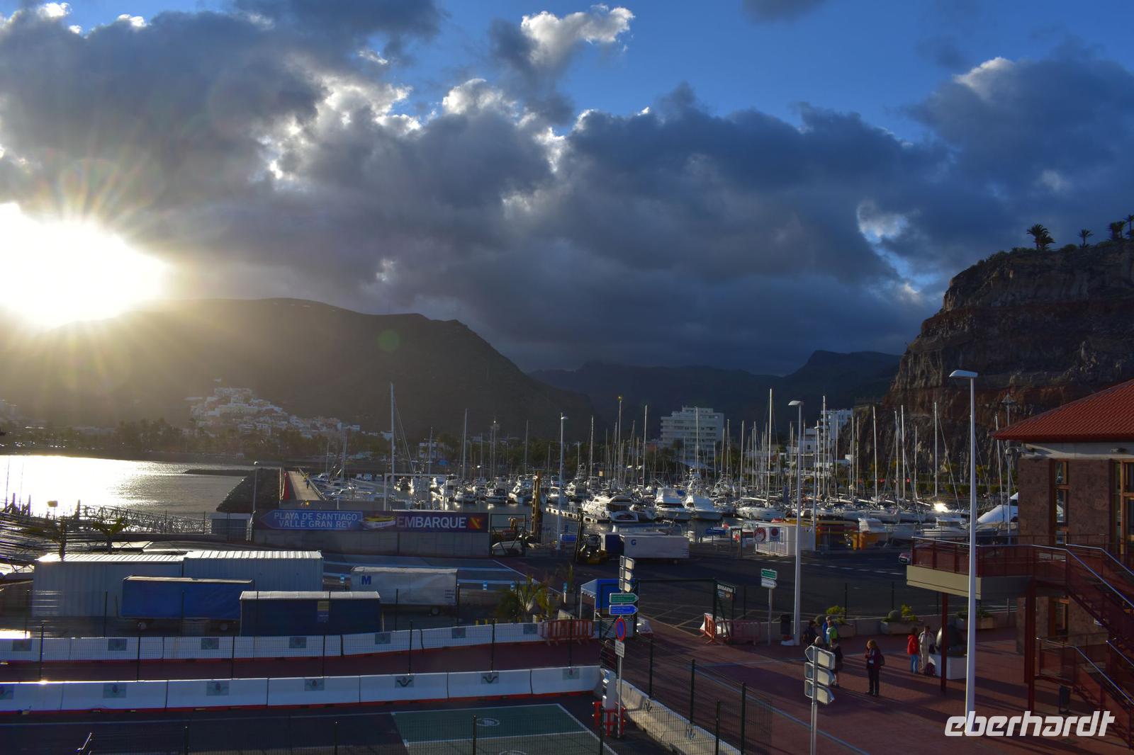 Nach dem Abendessen spazierten wir in den Fährhafen der Insel. Von der Kaimauer hielten wir Ausschau auf unser Schiff. Mit etwas Verspätung legte es im Hafen an und wir konnten sogleich an Bord gehen. In der Dämmerung verließen wir den Hafen von San Sebastián und erreichten spät am Abend unser Hotel auf La Palma im Ort Cancajos.