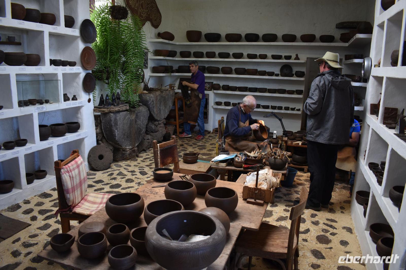 Unser nächstes Ziel lag in der Mitte der Insel La Palma. In der Nachbarschaft von Monte Pueblo, wo sich die Keramik-Werkstätten von Don Ramon befinden, sahen wir die traditionelle Fertigung von Tongefäßen und Keramik im allgemeinen, wie es einst schon die Ureinwohner taten. Die Herstellung erfolgt dabei ohne die Verwendung einer Töpferscheibe, denn das war den Ureinwohner nicht bekannt. Alles wird von Hand geknetet, geschliffen, geschabt und geschnitzt sowie poliert. Eine äußerst aufwändige Arbeit, die das Erbe der Ureinwohner schützen soll.