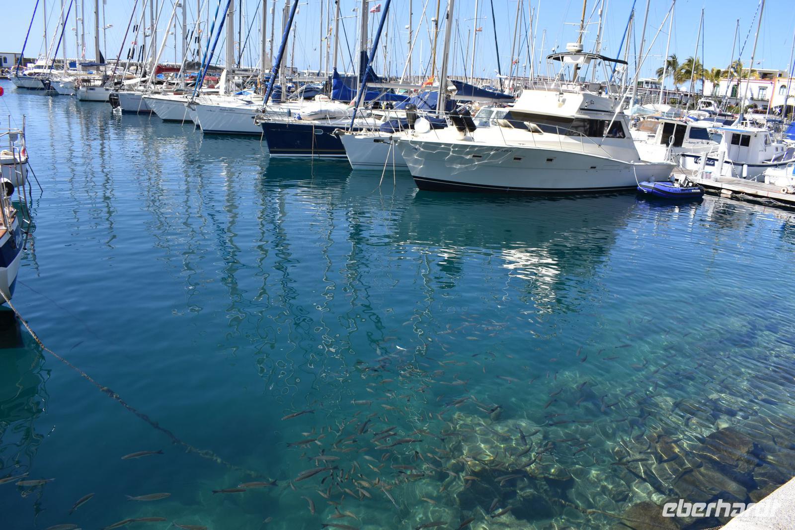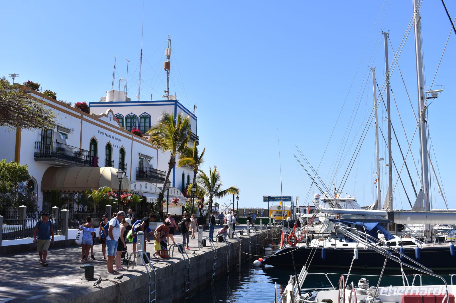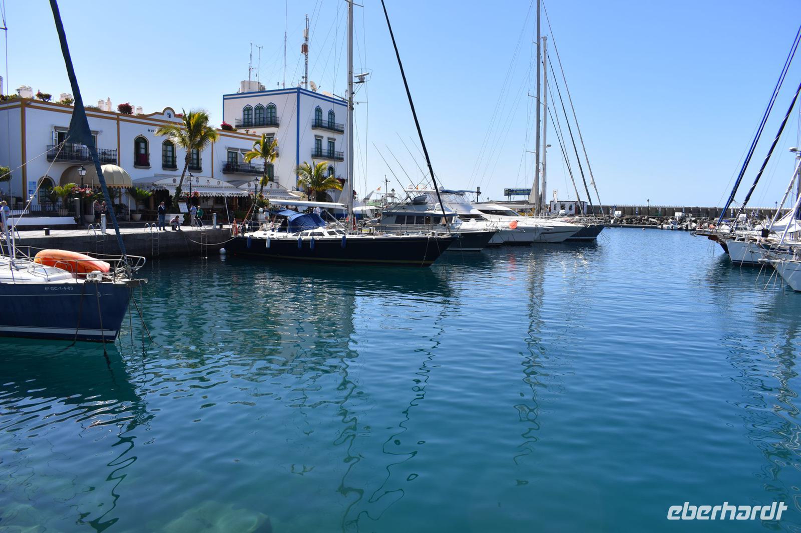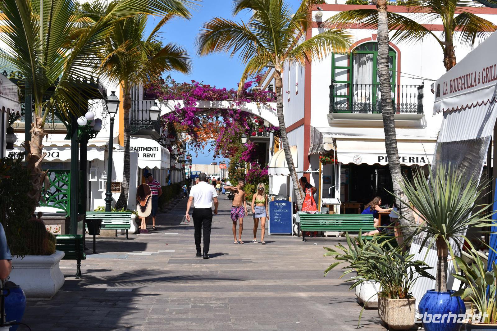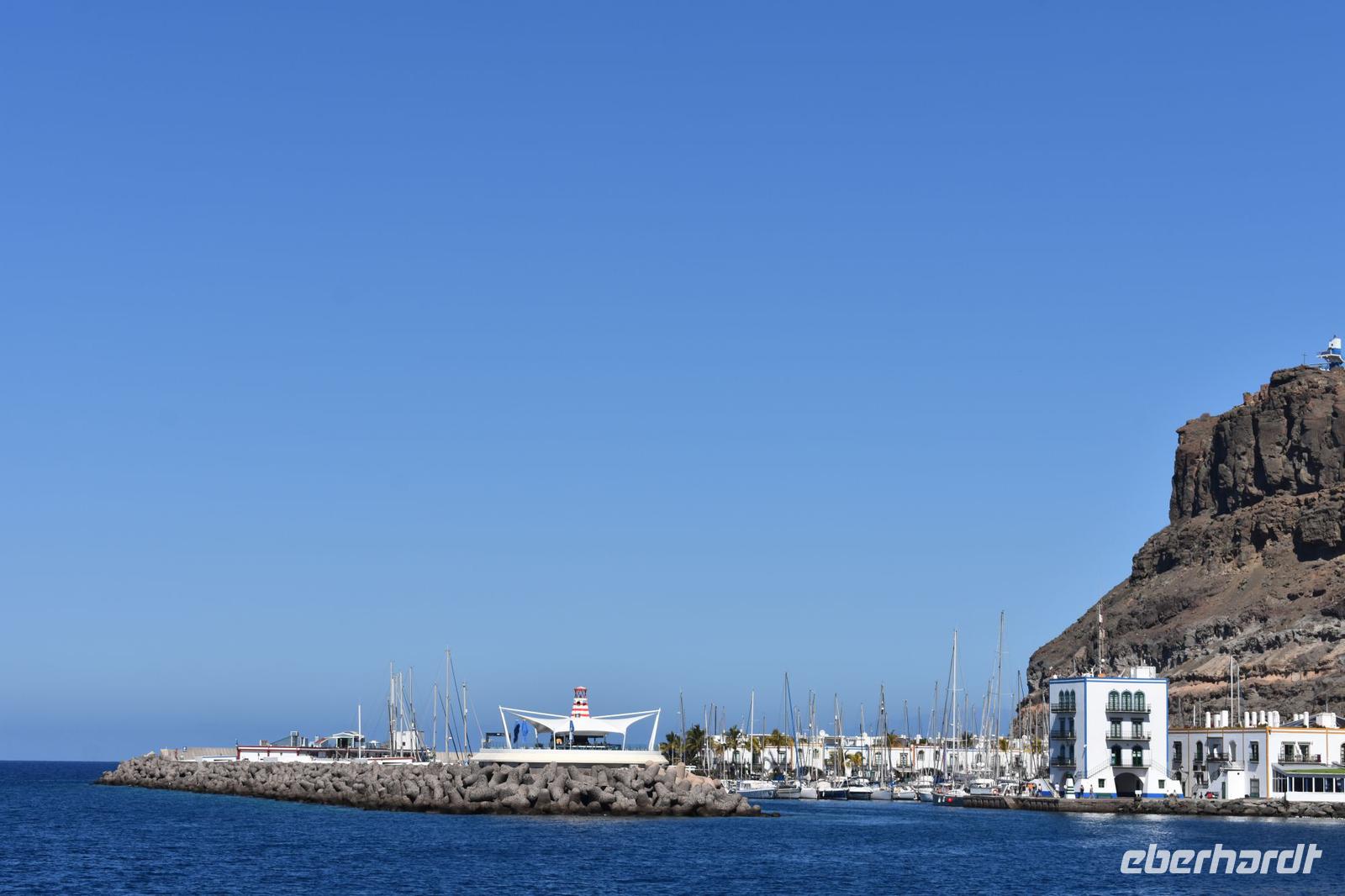 Es ging weiter nach Puerto Mogán, dem Venedig von Gran Canaria, diesmal aber mit dem Boot statt unseres Busses. Wir schipperten die steile und trockenen Küste entlang und konnten die verschieden Steinschichten und Höhlen bewundern. In Puerto Mogán genossen wir den besonderen Charm aus Yachthafen, Fischerdorf und der Blumenbehangenen Gassen. Die hauptsächlich weißen Häuser am Hafen waren mit farblichen Akzenten bemalt. Große Blumen ranken an den Hauswänden entlang. Der Hafen wirkte sehr idyllisch und lud zum Besuch eines Restaurants, Cafés oder der Lädchen zum Bummeln ein. Mit dem Bus ging es zurück in Richtung Maspalomas und dabei durchfuhren wir Meloneras mit den unzähligen, ehemaligen Tomaten- und Gemüseplantagen. In Maspalomas drehten wir eine Runde um den 56 Meter hohen Leuchtturm aus dem 19. Jahrhundert, der mit zum Wahrzeichen der Gegend zählt. Wir warfen auch ein Blick in das kürzlich renovierte Museum und genossen die Aussicht von der Dachterrasse. Am späten Nachmittag lockte der Strand der Playa de Inlés.