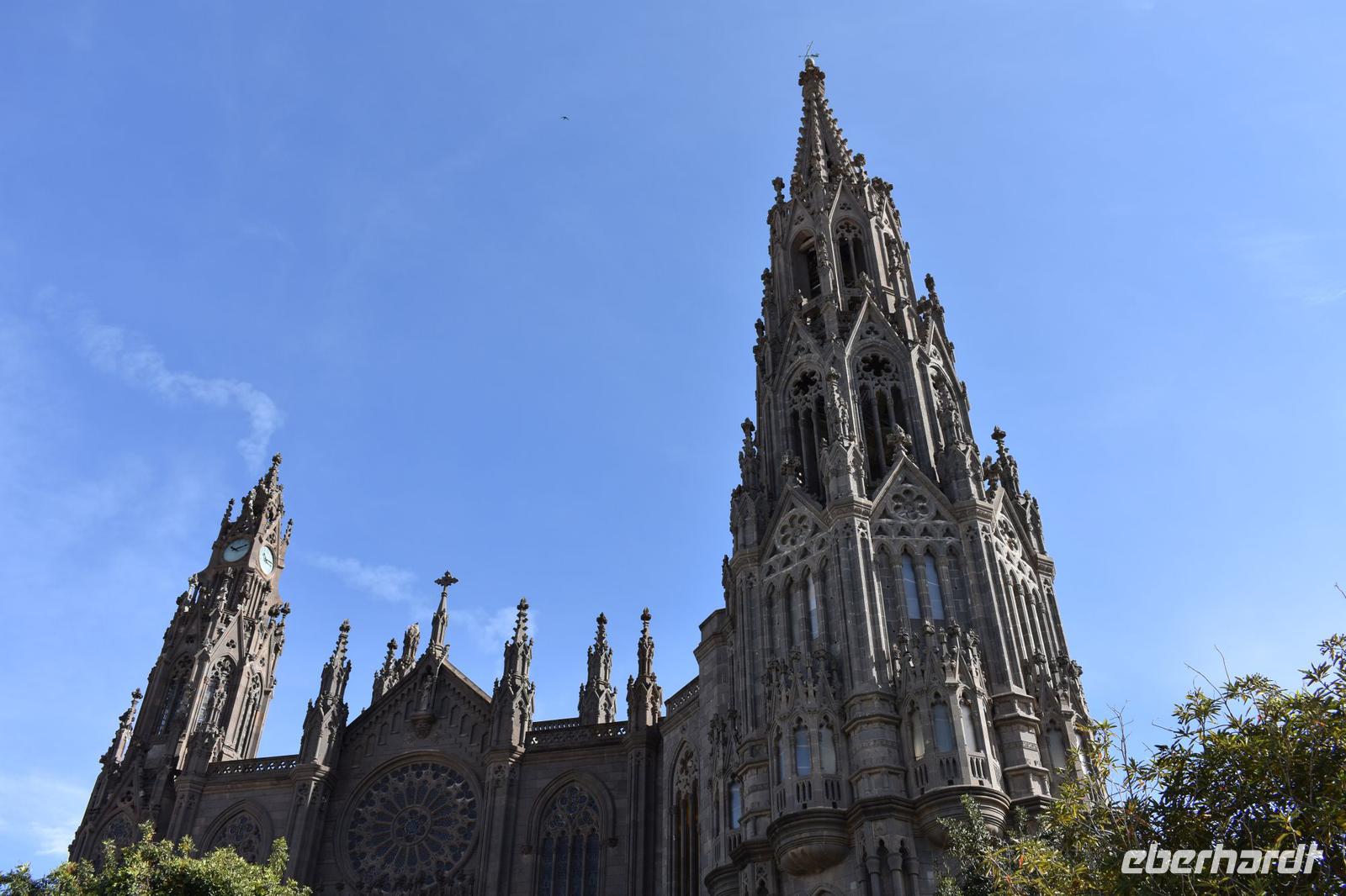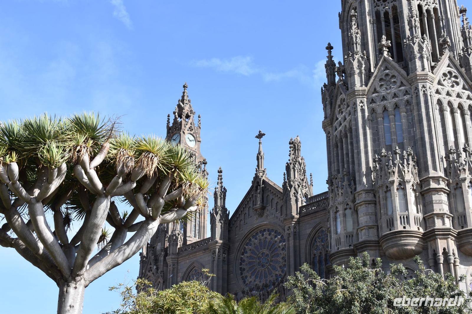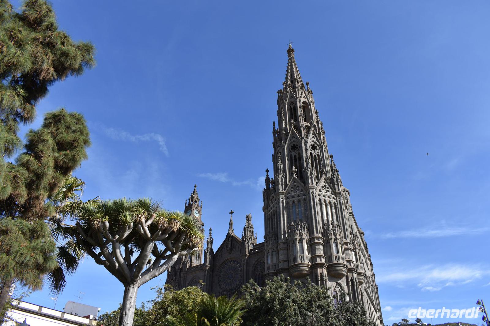 Heute stand die Inselrundfahrt von Gran Canaria auf dem Programm. Nach gut einer Stunde Fahrt kamen wir im nördlichen Teil der Insel, an der Kirche von Arucas, an. Das Gebäude im neugotischen Stil wurde einst vom katalanischen Architekten Manuel Vega March, der ein Schüler Gaudis war, entworfen. Das Bauwerk, welches aus dunklem Basalt gefertigt wurde, ist von 1909 bis 1917 erbaut wurden, aber tatsächlich erst Ende der 1970er Jahre vollendet wurden.