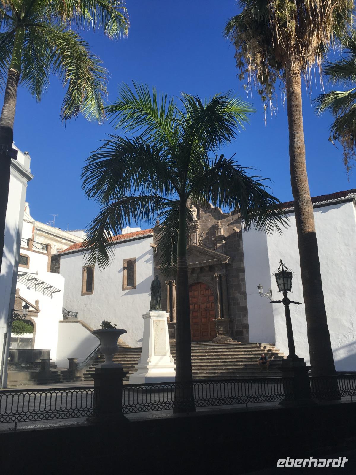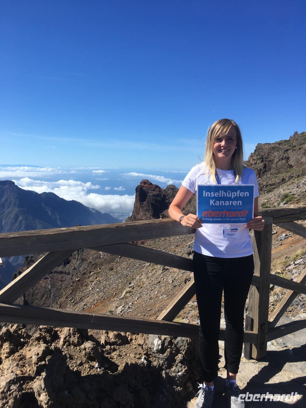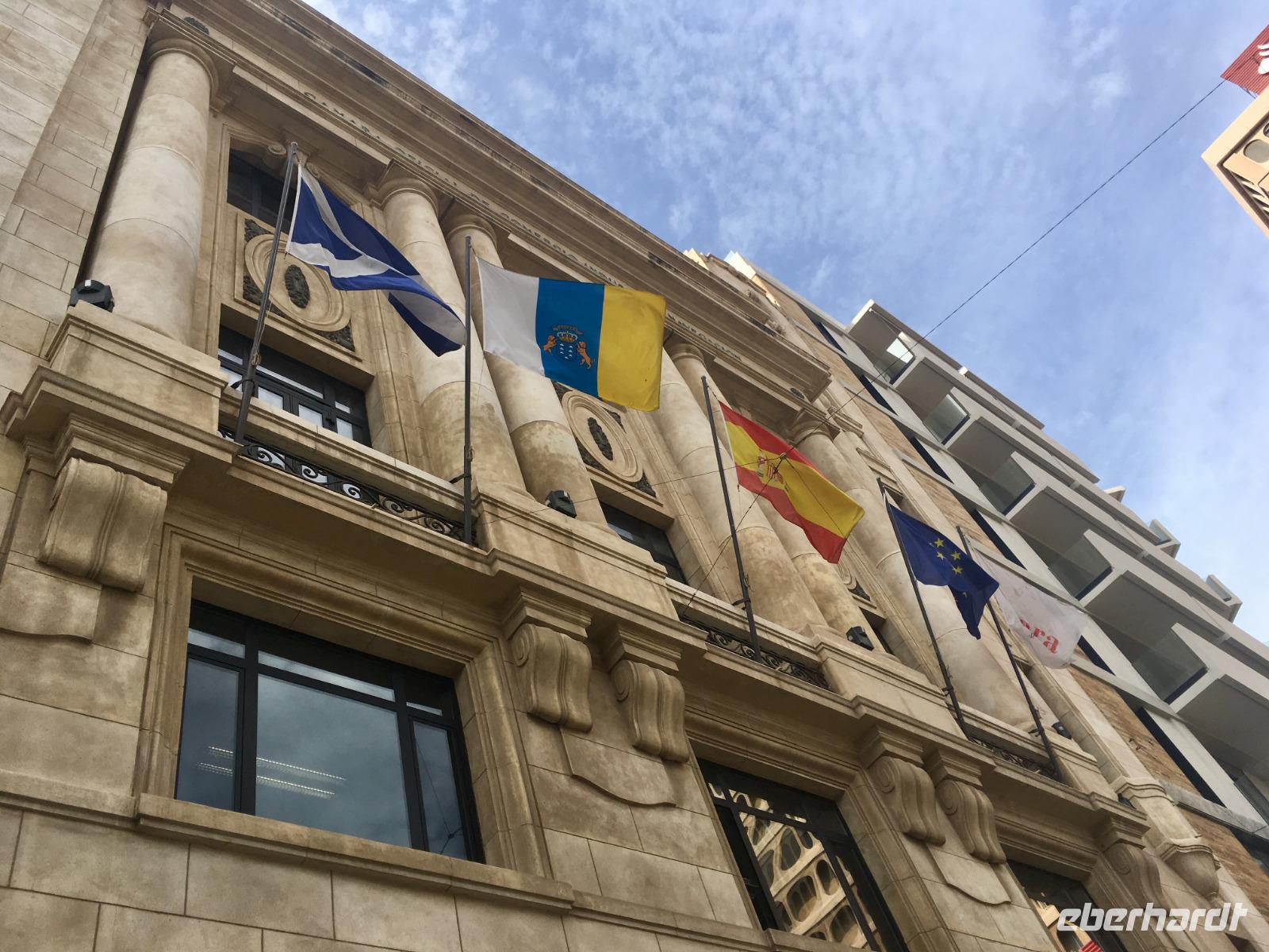 Den Tag lassen wir bei einem Frühstück im Hotel beginnen und bekommen wieder einen traumhaften Sonnenaufgang über dem Meer geboten. Strahlender Sonnenschein soll den heutigen Tag begleiten. Nachdem die Koffer verstaut sind, werden wir von unserem Reiseleiter Rudi abgeholt, der uns heute auf den höchsten Punkt von La Palma führt. Doch bevor es in die Höhe geht, nimmt Rudi uns mit zu einer Stadtführung durch die Hauptstadt. Nach wenigen Minuten erreichen wir bereits das Zentrum und auf dem Weg dorthin verdeutlicht uns Rudi die Bedeutsamkeit von Santa Cruz. Schließlich hatte die Stadt 300 Jahre den wichtigsten Hafen in der Kolonialmacht Spanien und auch die Lage als erste und letzte Insel im Atlantik lässt sie bedeutsam werden. Wir lassen die Führung beginnen und gelangen rasch zum Plaza España, wo sich gegenüber das Rathaus befindet, das wir sogleich besichtigen. Wir spazieren weiter zur Markthalle, die eine Fülle an frischen Früchten bereithält und sogar frisch gepressten Zuckerrohrsaft anbietet, von dem wir gleich einen Schluck kosten. Mit einem weiteren Eindruck verlassen wir nun die Hauptstadt, passieren die Außenbezirke und gewinnen beträchtlich rasch an Höhenmetern. Ginstergewächse schmücken die Landschaft. Schon bald lassen wir die letzten Häuser hinter uns und erhalten einen herrlichen Blick auf den Teide von Teneriffa. Unseren ersten Halt machen wir am Mirador de los Andenes und überblicken die Landschaft, die sich unter den Wolken abzeichnet, welche von Felsen durchragt werden. Wir gewinnen weiter an Höhemetern und gelangen zum Roque de los Muchachos und Cadera de Taburiente auf 2450 Metern. Von hier aus genießen wir eine atemberaubende Sicht über die Landschaft und schießen tolle Fotos. In Anbetracht der fortgeschrittenen Zeit legen wir eine Mittagspause in Punta Gorda ein. Die Mehrheit lässt sich im Restaurant Pino de la Virgen nieder und lässt sich die reichhaltige, typisch kanarische Suppe Rancho mit Kichererbsen schmecken. Andere unserer Eberhardt-Gruppe suchen sich ein schattiges Plätzchen bei einem gemütlichen Picknick. Im Anschluss legen wir einen letzten Halt bei dem Aussichtspunkt Mirador de Time ein, von dem aus wir bei einem Eis und Café eine fantastische Aussicht haben. Wir kehren zurück zum Hotel und nutzen die verbleibende Zeit für einen letzten Spaziergang am Meer. Noch einmal lassen wir uns das Abendessen vom Buffet schmecken und werden sodann schon von unserem Busfahrer Sergio innerhalb weniger Minuten zum Flughafen gefahren. In weniger als einer Stunde bringt uns die Maschine von Binter nach Gran Canaria. Nach einem langen Tag freuen wir uns, als wir unser Hotel Caserio am Playa de Inglés erreichen. Für heute soll es also heißen: ¡Buenas noches & hasta mañana! (Gute Nacht und bis morgen!).