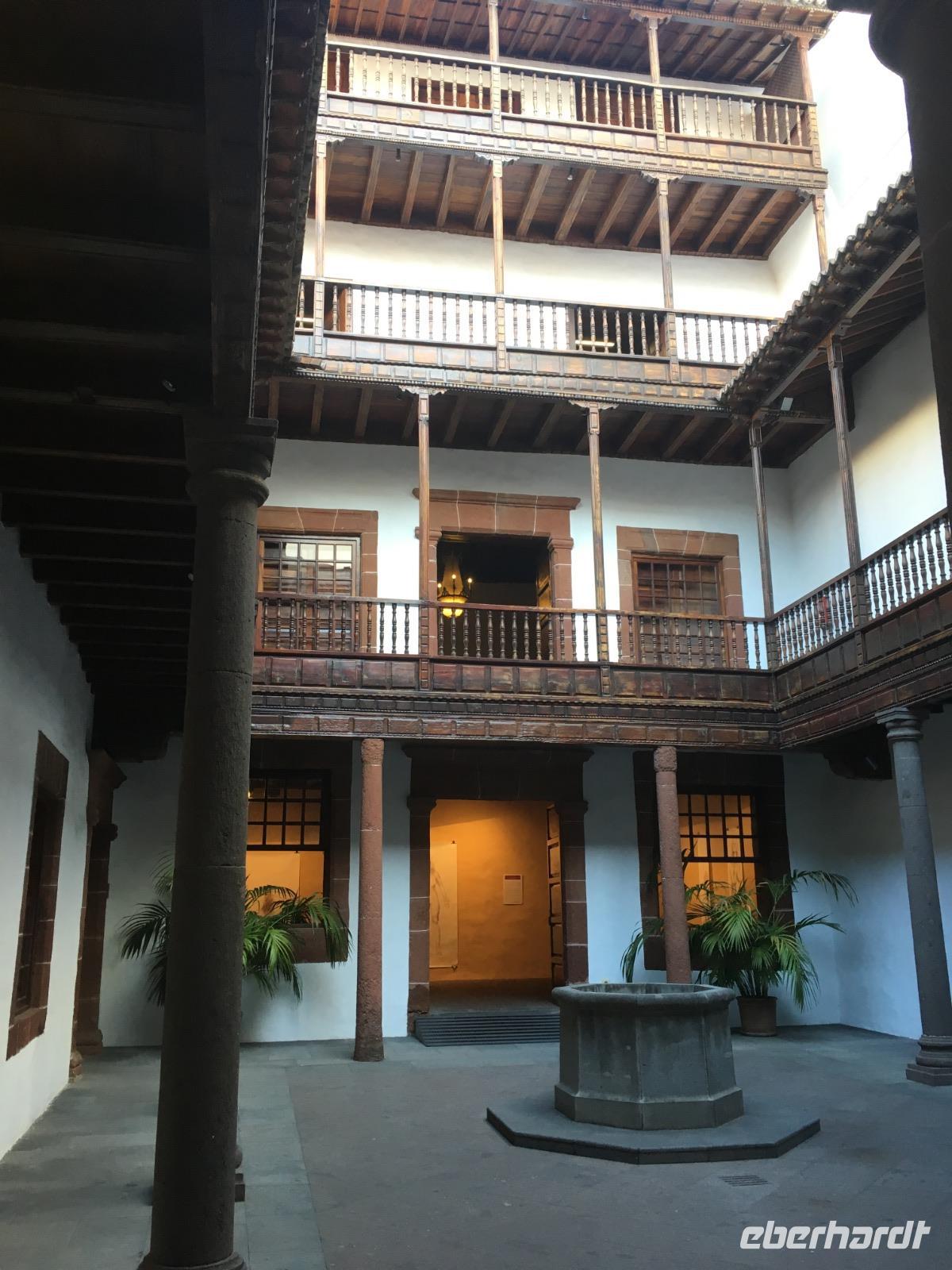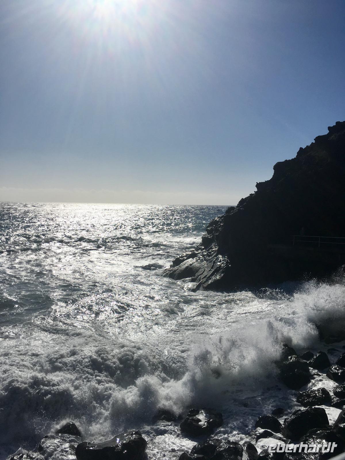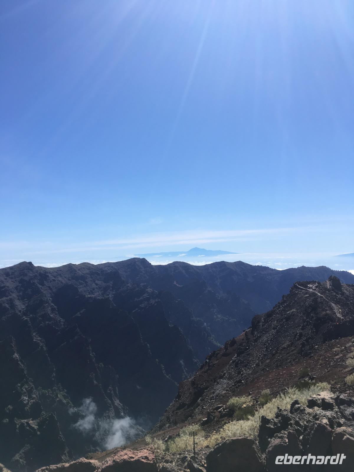 Den Tag lassen wir bei einem Frühstück im Hotel beginnen und bekommen wieder einen traumhaften Sonnenaufgang über dem Meer geboten. Strahlender Sonnenschein soll den heutigen Tag begleiten. Nachdem die Koffer verstaut sind, werden wir von unserem Reiseleiter Rudi abgeholt, der uns heute auf den höchsten Punkt von La Palma führt. Doch bevor es in die Höhe geht, nimmt Rudi uns mit zu einer Stadtführung durch die Hauptstadt. Nach wenigen Minuten erreichen wir bereits das Zentrum und auf dem Weg dorthin verdeutlicht uns Rudi die Bedeutsamkeit von Santa Cruz. Schließlich hatte die Stadt 300 Jahre den wichtigsten Hafen in der Kolonialmacht Spanien und auch die Lage als erste und letzte Insel im Atlantik lässt sie bedeutsam werden. Wir lassen die Führung beginnen und gelangen rasch zum Plaza España, wo sich gegenüber das Rathaus befindet, das wir sogleich besichtigen. Wir spazieren weiter zur Markthalle, die eine Fülle an frischen Früchten bereithält und sogar frisch gepressten Zuckerrohrsaft anbietet, von dem wir gleich einen Schluck kosten. Mit einem weiteren Eindruck verlassen wir nun die Hauptstadt, passieren die Außenbezirke und gewinnen beträchtlich rasch an Höhenmetern. Ginstergewächse schmücken die Landschaft. Schon bald lassen wir die letzten Häuser hinter uns und erhalten einen herrlichen Blick auf den Teide von Teneriffa. Unseren ersten Halt machen wir am Mirador de los Andenes und überblicken die Landschaft, die sich unter den Wolken abzeichnet, welche von Felsen durchragt werden. Wir gewinnen weiter an Höhemetern und gelangen zum Roque de los Muchachos und Cadera de Taburiente auf 2450 Metern. Von hier aus genießen wir eine atemberaubende Sicht über die Landschaft und schießen tolle Fotos. In Anbetracht der fortgeschrittenen Zeit legen wir eine Mittagspause in Punta Gorda ein. Die Mehrheit lässt sich im Restaurant Pino de la Virgen nieder und lässt sich die reichhaltige, typisch kanarische Suppe Rancho mit Kichererbsen schmecken. Andere unserer Eberhardt-Gruppe suchen sich ein schattiges Plätzchen bei einem gemütlichen Picknick. Im Anschluss legen wir einen letzten Halt bei dem Aussichtspunkt Mirador de Time ein, von dem aus wir bei einem Eis und Café eine fantastische Aussicht haben. Wir kehren zurück zum Hotel und nutzen die verbleibende Zeit für einen letzten Spaziergang am Meer. Noch einmal lassen wir uns das Abendessen vom Buffet schmecken und werden sodann schon von unserem Busfahrer Sergio innerhalb weniger Minuten zum Flughafen gefahren. In weniger als einer Stunde bringt uns die Maschine von Binter nach Gran Canaria. Nach einem langen Tag freuen wir uns, als wir unser Hotel Caserio am Playa de Inglés erreichen. Für heute soll es also heißen: ¡Buenas noches & hasta mañana! (Gute Nacht und bis morgen!).