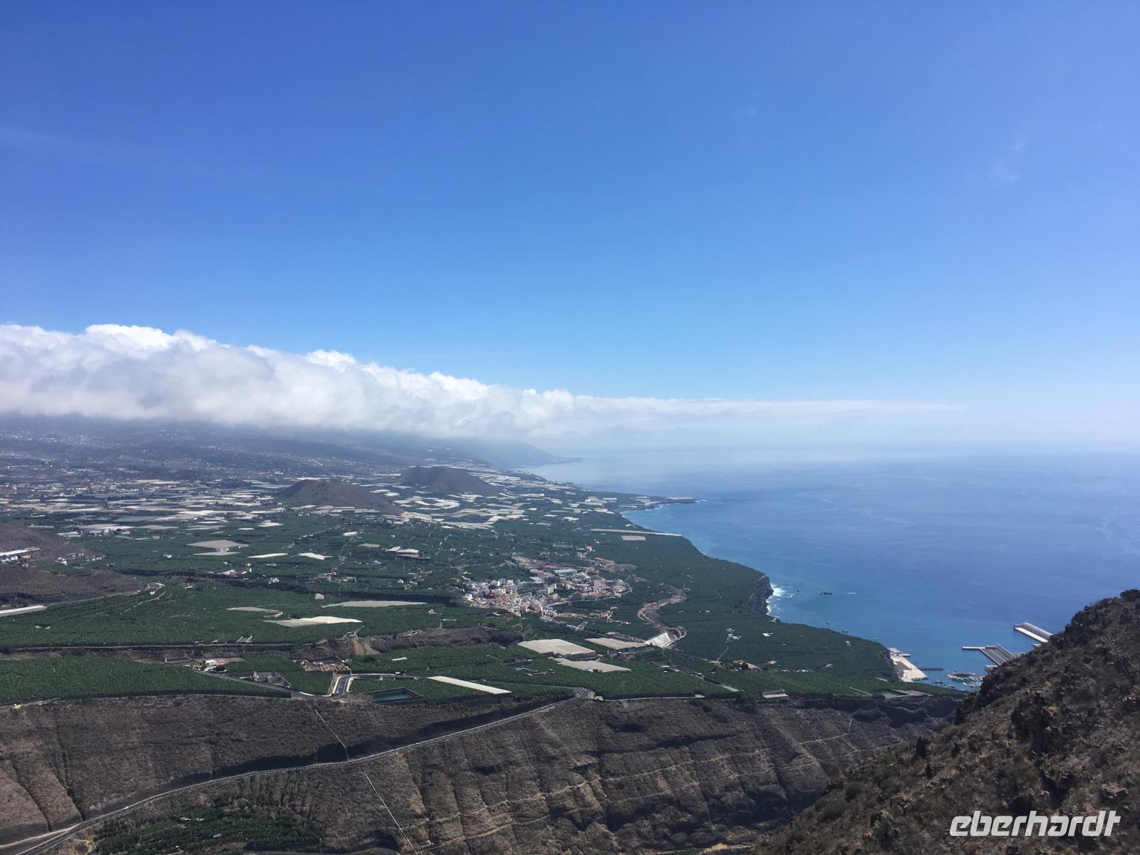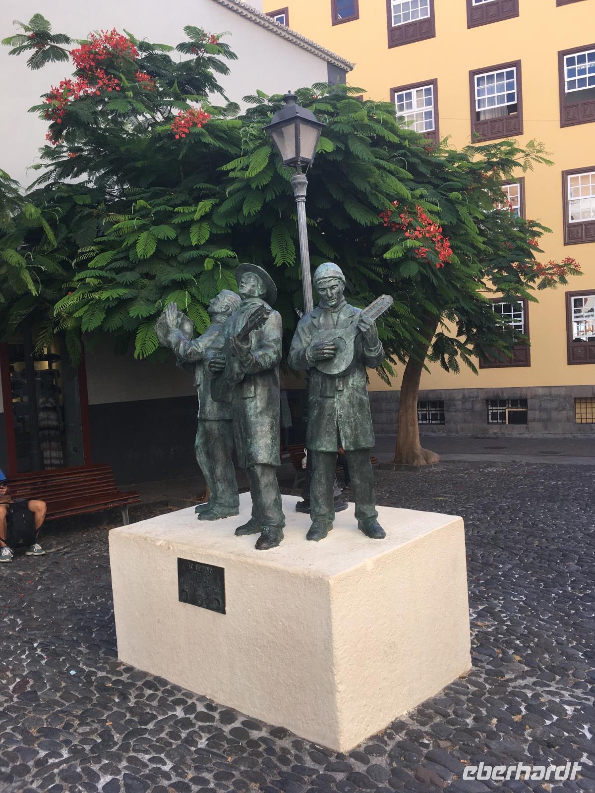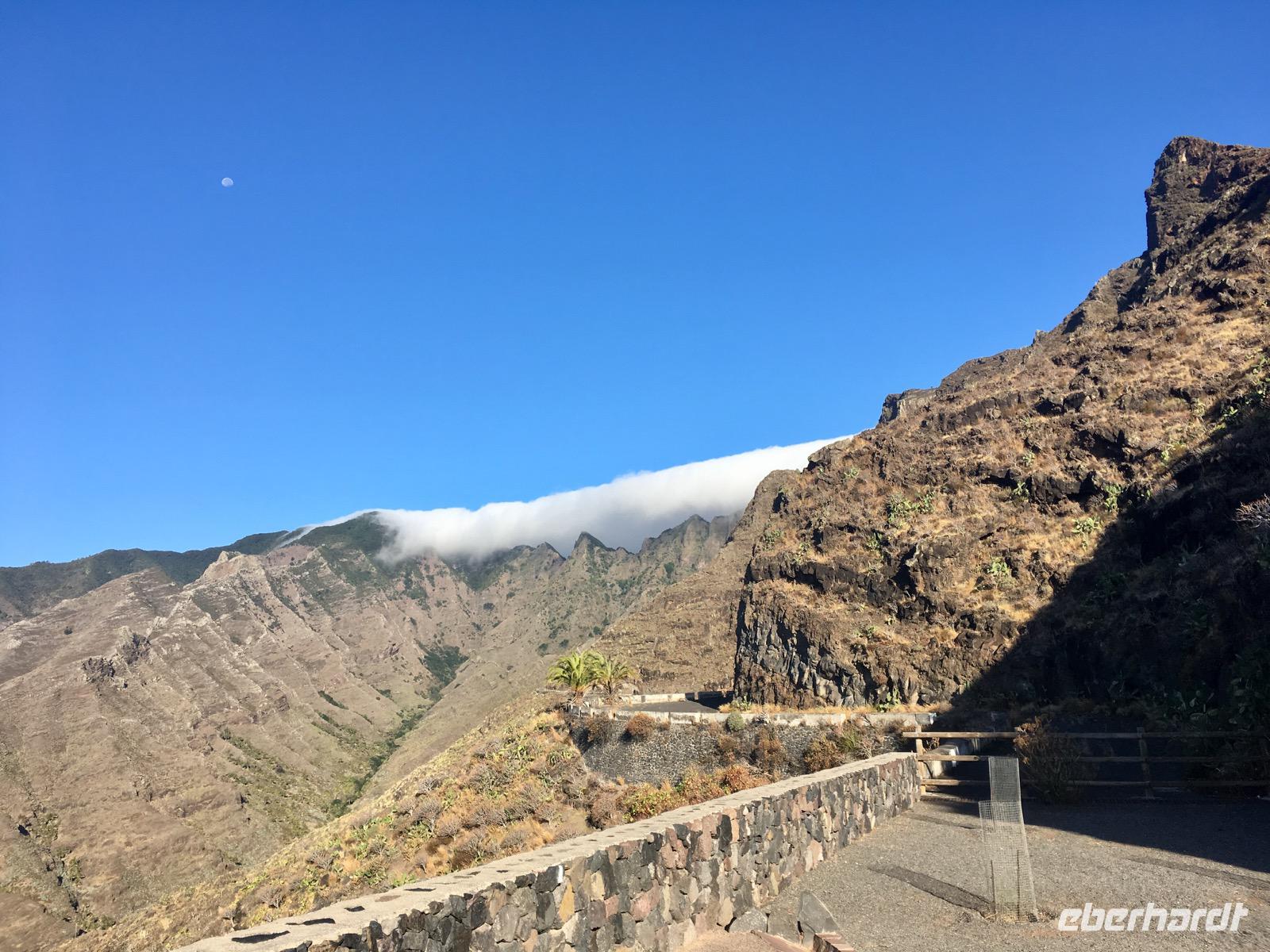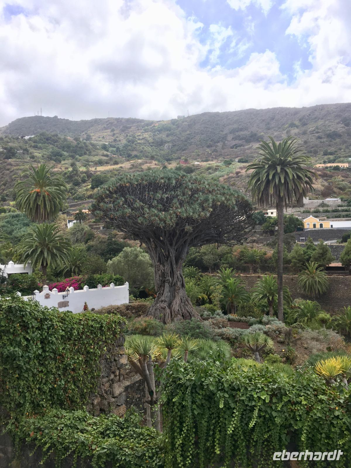 Den heutigen Tag lässt unsere Eberhardt-Gruppe gemütlich bei einem Frühstück im Hotel beginnen. Danach werden wir auch schon von unserer Reiseleiterin Gisela abgeholt, die uns heute die Ortschaften Garachico und Masca zeigen möchte. Wir starten mit dem Bus Richtung Nordwesten und begeben uns zunehmend höher. Dabei können wir bereits einen Blick auf den Roque de Garachico (Felsen der kleinen Insel) erhaschen, der vorgelagerte Felsen, der auch das Wahrzeichen von Garachico darstellt. Unter uns erstrecken sich weitläufige Bananenplantagen sowie das sich daran anschließende Meer. Auf dieser Strecke passieren wir das Denkmal, das einen alten Mann mit Koffer darstellt. Es richtet sich an alle Kanaren, die in schwierigen Zeiten über den Hafen ihre Reise in die Welt, besonders nach Südamerika, antraten und auf ein besseren Leben hofften. In der Brust des Mannes ist ein Loch als Zeichen seines Herzens, das er stets auf Teneriffa zurückgelassen hat.