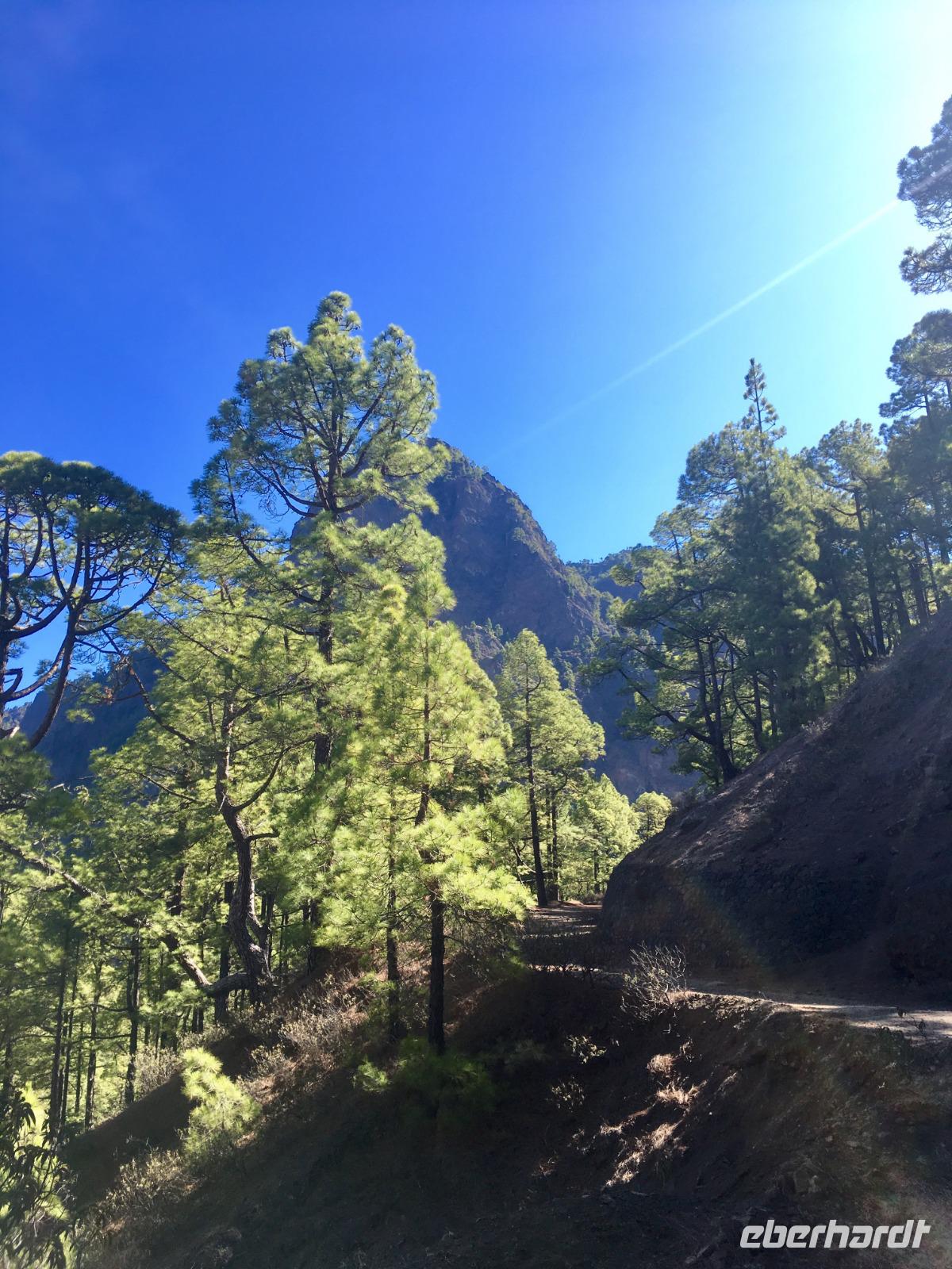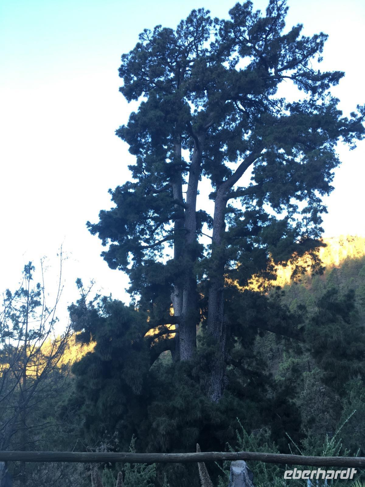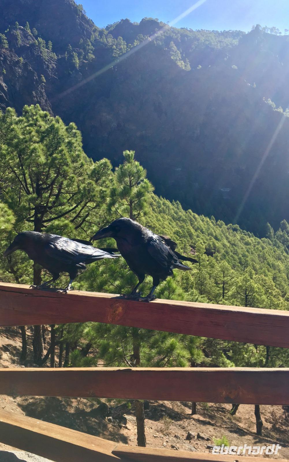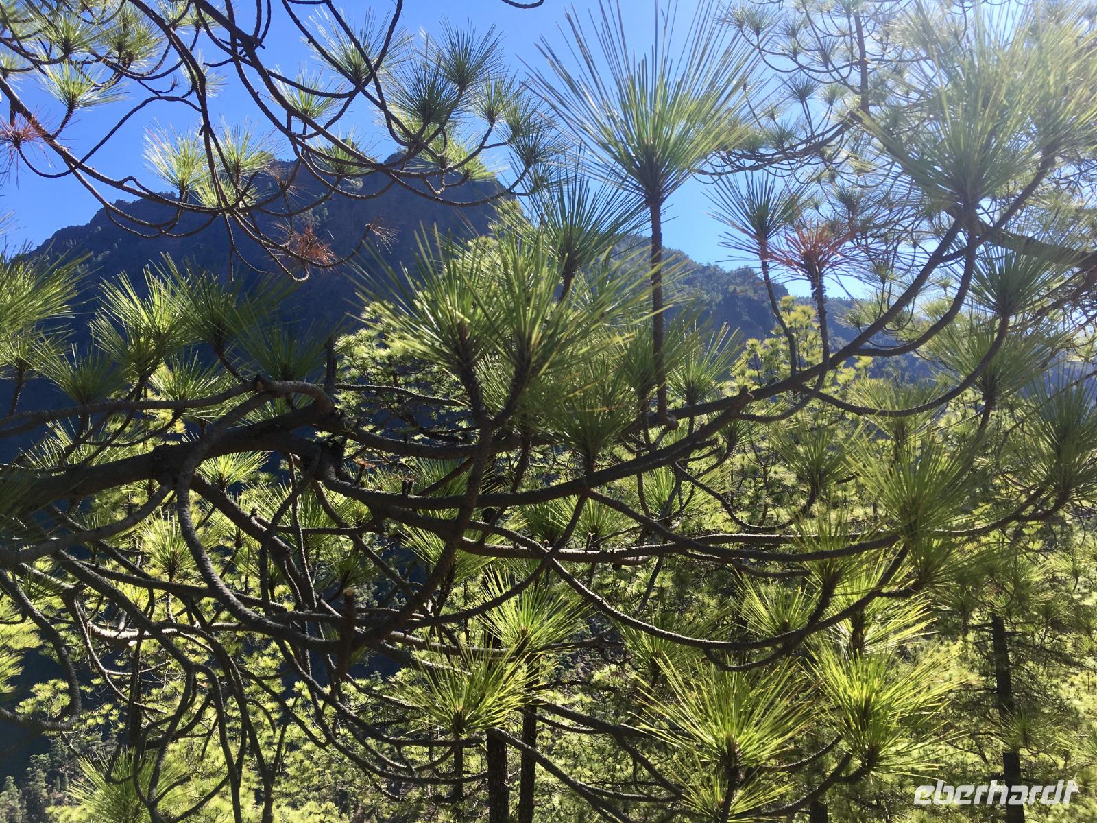 Wir führen unsere Fahrt weiter fort und gelangen zu der Kirche Nuestra Señora de Las Nieves (unsere Dame des Schnees). Sie ist die Schutzpatronin der Insel, weshalb die Kirche auch als Wallfahrtsort gilt und von den Menschen verehrt wird. Anschließend gelangen wir zum Aussichtspunkt Mirador de La Concepción, von dem aus man das Meer und die Hauptstadt Santa Cruz überblickt. Nun verlassen wir auch schon die Stadt und werden in den nächsten zwei Stunden die Natur in vollen Zügen genießen. Wir machen uns auf in den Nationalpark, noch zeichnet sich die Landschaft durch Baumheide und Esskastanien aus, doch schon bald finden wir ausschließlich prächtige Kiefern vor, deren Nadeln in einem kräftigen Grün erstrahlen. Auch zwei Raben begrüßen uns bei unserer Ankunft. Rudi nimmt uns mit auf eine kleine Wanderung durch den Nationalpark. Die Sonne strahlt, es herrschen warme Temperaturen und wir atmen den intensiven Duft der Kiefern ein.