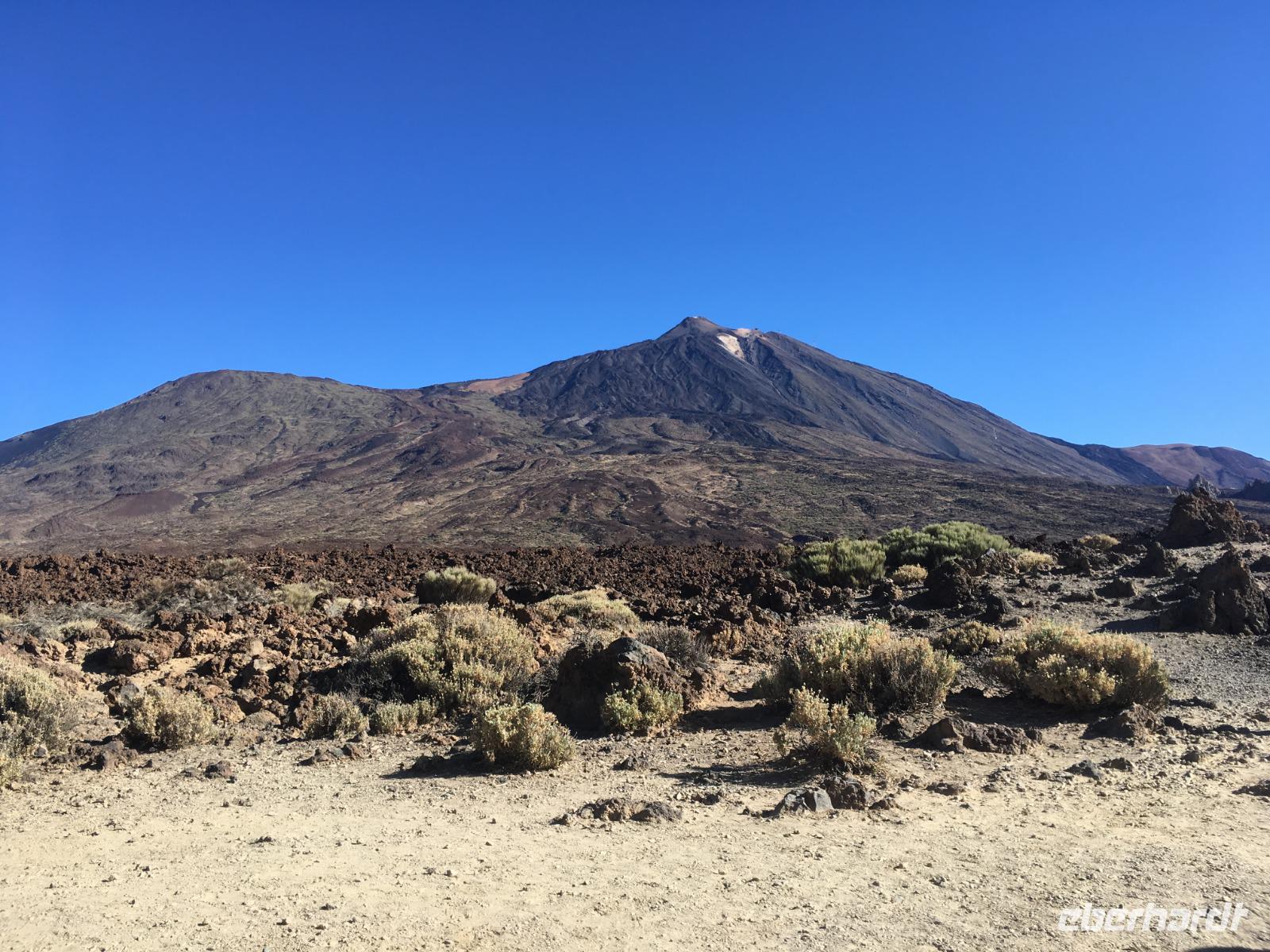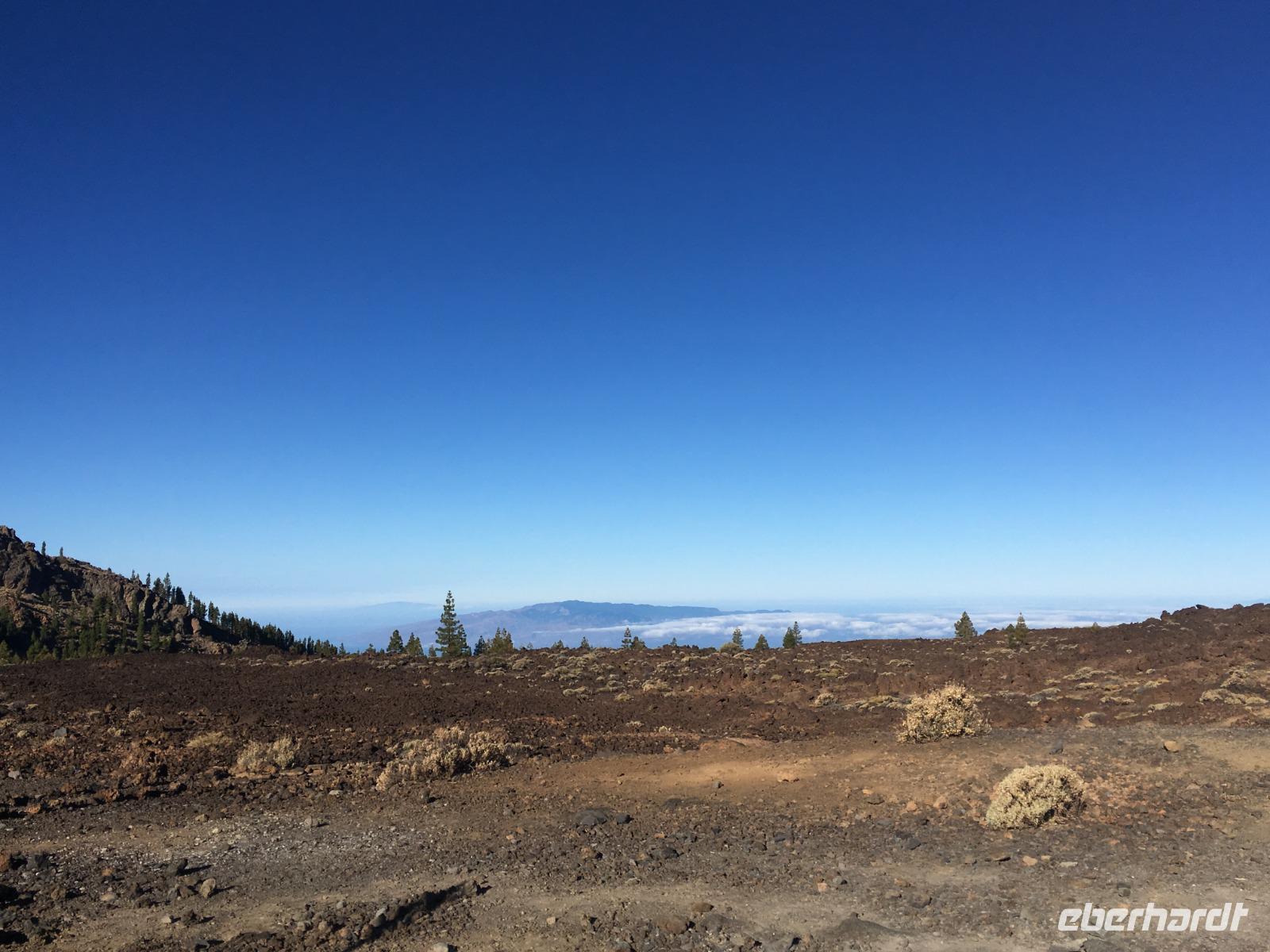 Die Wecker unserer Eberhardt-Gruppe sind früh gestellt, schließlich wollen wir heute auf den Teide, Spaniens höchster Berg und zugleich Vulkan. Bereits die vorigen Tage konnten wir von weitem einen Blick auf den Teide erhaschen und sind nun besonders neugierig, die Vulkanlandschaft zu erkunden. Doch bevor es losgehen soll, stärken wir uns wie gewohnt bei einem Frühstück. Sodann werden wir von Gisela und unserem Busfahrer Julio abgeholt, die uns heute bei unserem Vorhaben begleiten. Als wir unseren Ort Playa de Las Américas verlassen und den Nachbarort Playa de Los Cristianos passieren, ist es noch ganz dunkel draußen. Doch schon kurze Zeit später, als wir durch Vilaflor fahren, geht die Sonne langsam auf. Die Landschaft um Vilaflor zeichnet sich durch zahlreiche Kieferbäume aus, welche die Landschaft zieren. An einer besonders großen kanarischen Kiefer legen wir einen kurzen Halt ein. Der Stamm der Kiefer ist sogar so dick, dass es acht unserer Eberhardt-Gäste bedarf, um den Stamm vollständig zu umfassen. Als uns dies gelungen ist, überrascht uns Gisela mit der „kanarischen Hochzeit", Feigen, in denen Mandeln stecken. Unser Urteil ist eindeutig: Die Kombination schmeckt hervorragend.