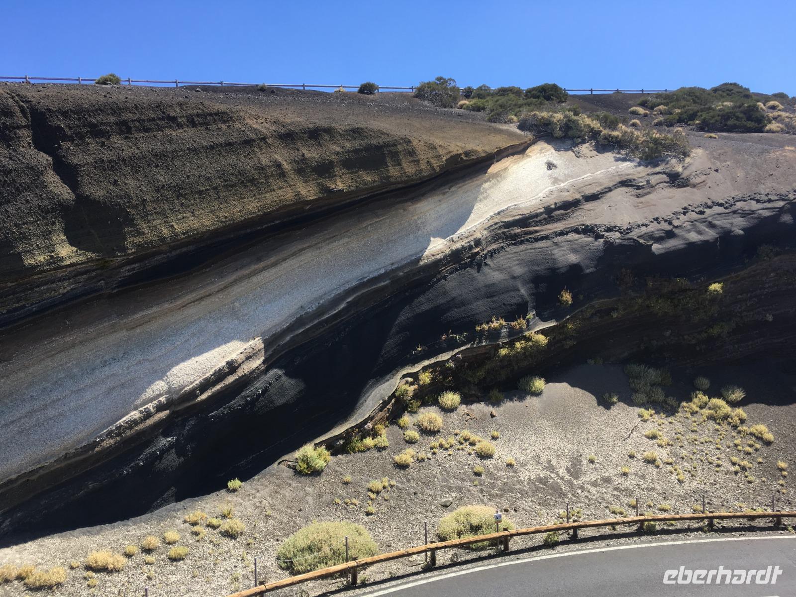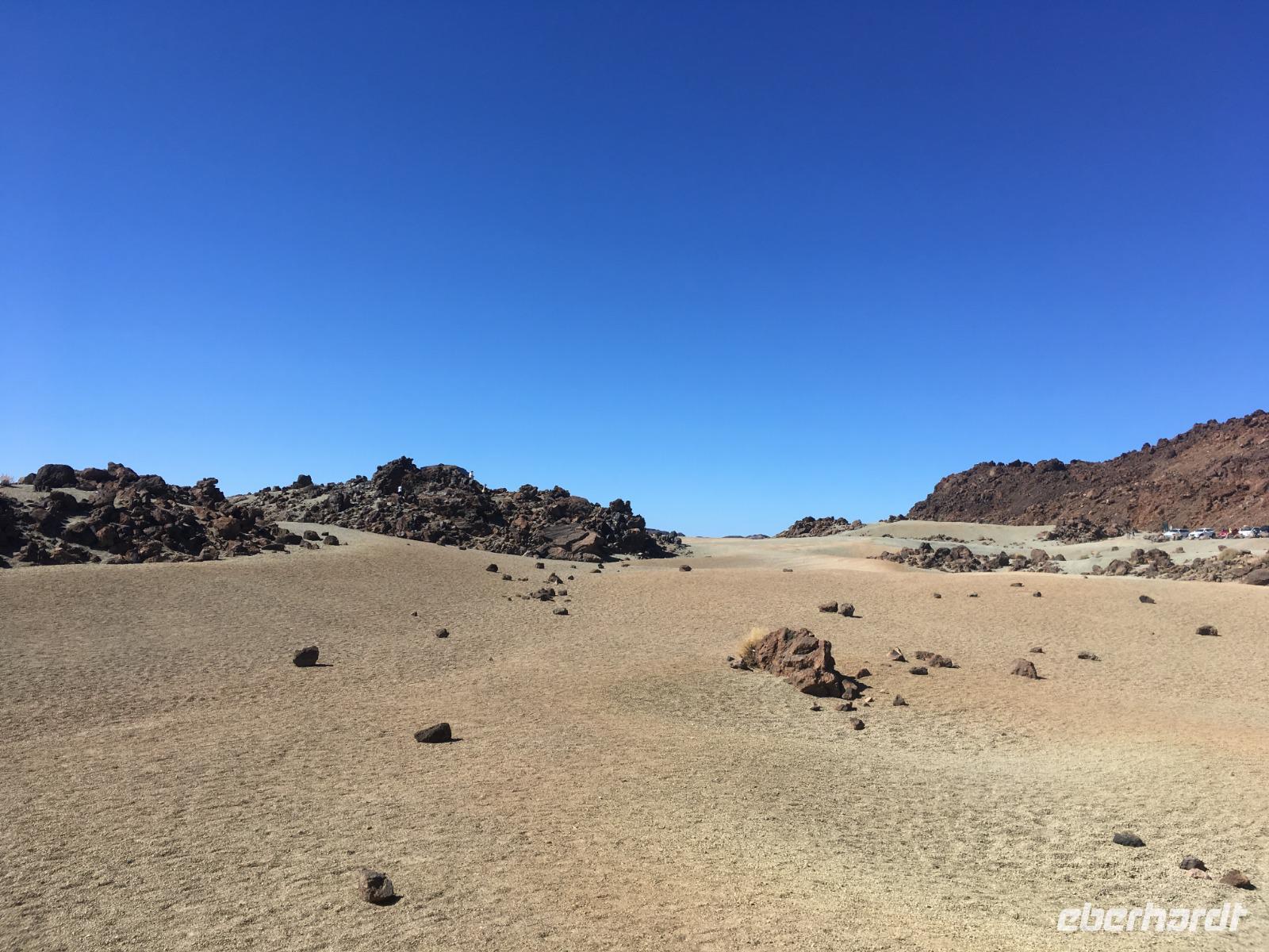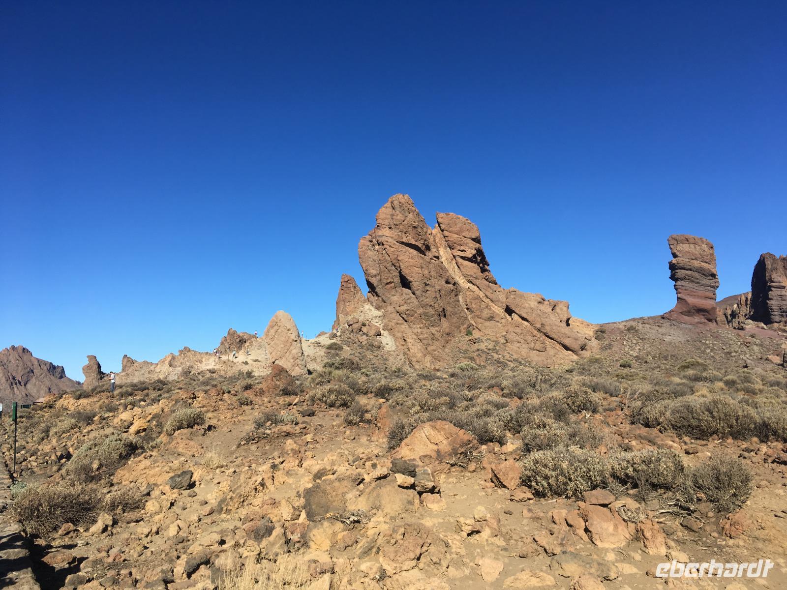 Wir setzen unsere Fahrt weiter fort, womit sich die Vegetation zusehends ändert. Noch prägen Mandel- und Feigenbäume die Landschaft, doch schon bald werden diese durch kanarische Ginstergewächse und Besenrauken abgelöst. Der auf den ersten Blick unwirtliche Boden lässt eine Planzenvielfalt auf sich gedeihen. So prägt auch der rote Natternkopf das vulkanische Landschaftsbild, gefolgt von vielen weiteren Pflanzenarten, die besonders im Frühling prächtig blühen. Auf 2300 Metern angelangt, möchte unsere Eberhardt-Gruppe mit der ersten Seilbahn den Pico, die Spitze des Teide, erreichen. Doch schon rasch muss uns Gisela mitteilen, dass der Wind zu stark weht und die Seilbahn daher leider nicht fährt. Da Sicherheit vorgeht, setzen wir unser Programm erst einmal weiter fort und erkunden weitere Teile des Teide Nationalparkes. So stoppen wir unter anderem bei dem Roque de García, bizzar geformte Felsformationen, in denen wir einen Bär und den Finger Gottes (Roque Cinchado) erkennen. Gegen Vormittag wollen wir unser Glück noch einmal versuchen und passieren auf unserem Weg nochmals die Seilbahn. Der Wind weht nur noch stärker, erfahren wir sogleich und sehen, dass die Seilbahn stillsteht. Doch glücklicherweise bietet der Teide noch weitere Teile, die äußerst sehenswert sind. Einer davon ist der Aussichtspunkt Minas de San José Sur. Die dortige Landschaft wird auch Paisaje lunar genannt, was „Mondlandschaft" bedeutet. Wir sind uns einig: Die Landschaft auf dem Teide ist beeindruckend.