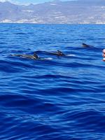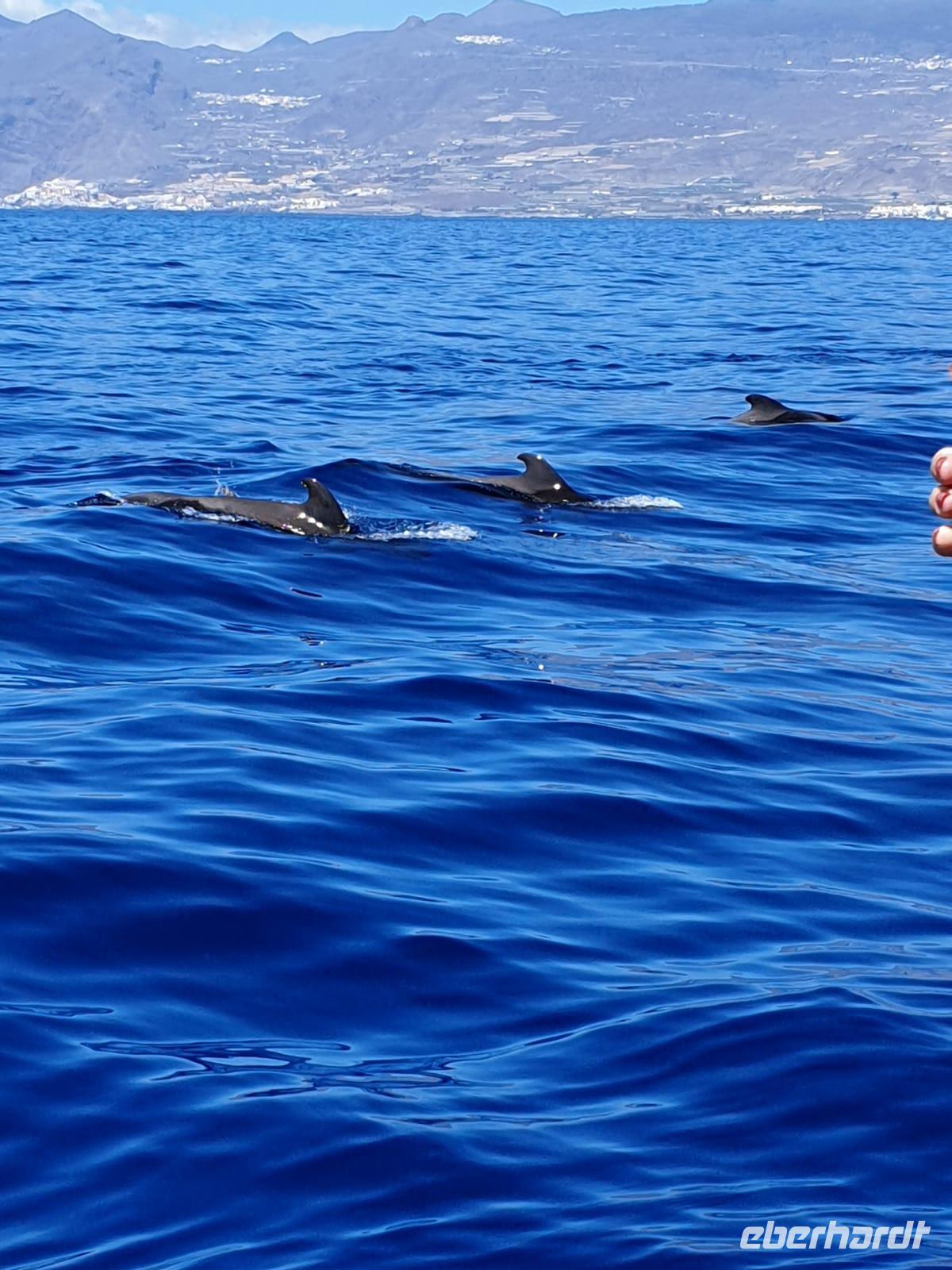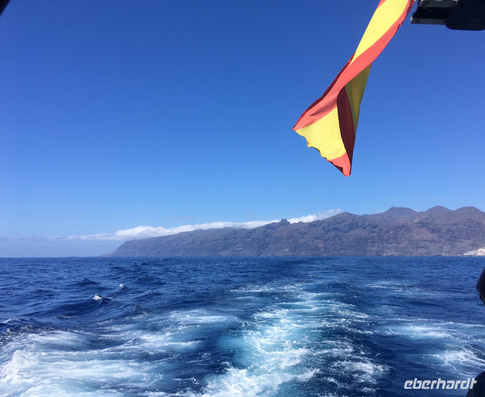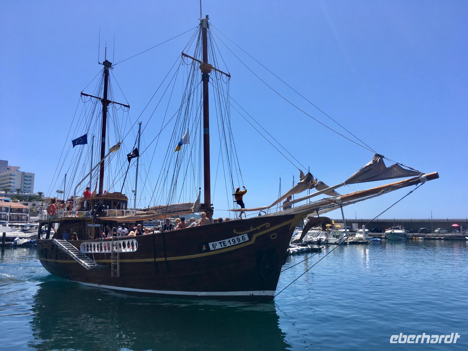 Wir führen unsere Fahrt weiter zum neuen Hafen Los Gigantes fort, von wo aus wir eine Bootstour mit einem Segelschiff im Piraten-Stil starten. Sobald alle Gäste eingestiegen sind, wurden die Leinen losgelöst und die Fahrt ins Meer hinaus beginnt. Auf einmal wird das Schiff langsamer und wir bekommen freie Sicht auf Wale, die sich von ihrer schönsten Seite zeigen. Anschließend wird uns eine Paelle serviert bei kühlen, erfrischenden Getränken. Kaum haben wir uns die typisch spanische Reispfanne schmecken lassen, gelangen wir zu einer Bucht, vor der wir vom Boot aus ins Wasser steigen oder sogar springen dürfen. Einige unserer Eberhardt-Gäste zögern nicht lange und gönnen sich eine Abkühlung im Wasser - die erste ist jedoch unsere Reiseleiterin Gisela.