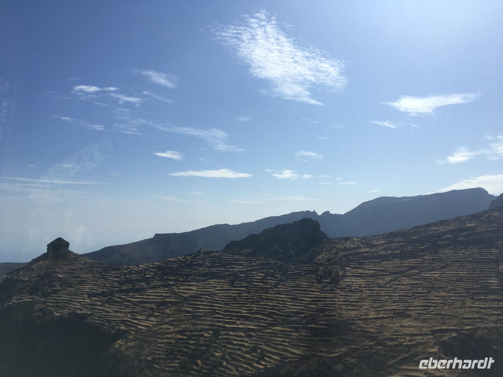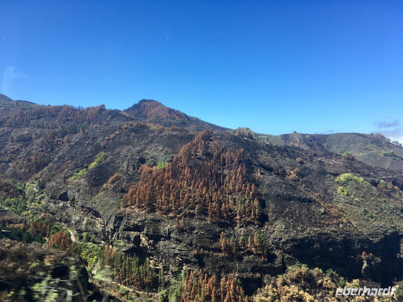 Zur Mittagszeit erreichen wir den Ort Valle Seco. Übersetzt bedeutet dies trockenes Tal, dabei verfügt Valle Seco über große Wasservorräte. Um uns für die weitere Fahrt zu stärken, kehren wir in das Restaurant Balcón de Zamora ein. Wir lassen uns ein reichhaltiges Menü schmecken, das von einem Glas Rotwein bei toller Aussicht begleitet wird. Gut gesättigt setzen wir die Fahrt fort und passieren Hänge, an denen Feigenbäume, Eukalyptusbäume sowie wildwachsende Geranien gedeihen. Die Gegend wird auch als die Schweiz von Gran Canaria bezeichnet. Rasch bekommen wir die Ausmaße des Waldbrandes zu Gesicht, der sich im August dieses Jahres im Naturschutzgebiet aufgrund von Brandstiftung ereignete.
