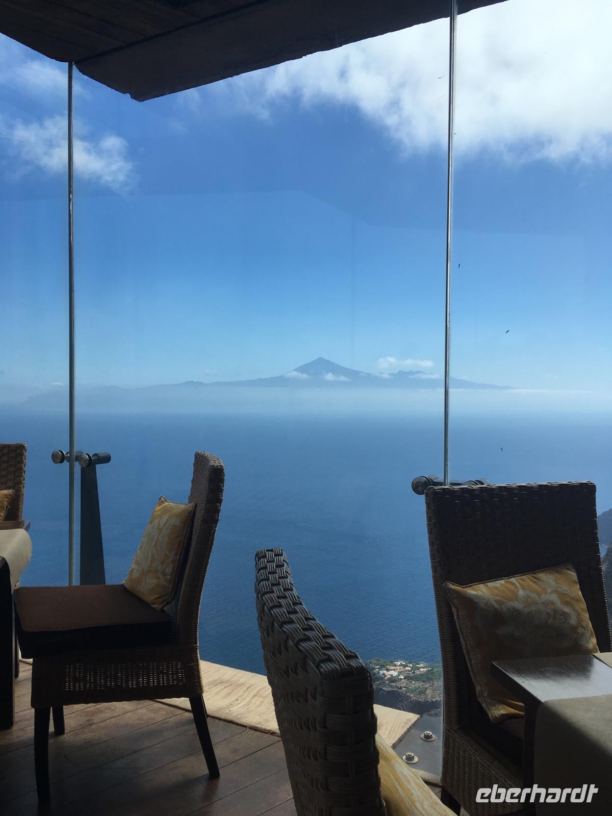 Am Morgen werden wir nach einem ausgiebigen Frühstück von unserer Reiseleiterin Andrea abgeholt und lassen unsere heutige Inselrundfahrt beginnen. Wir verlassen San Sebastián und fahren zunächst in Richtung des Inselinneren. Rasch geht es bergauf und wir erreichen den Roque Agando, über den sich sanft ein Wolkenmeer gelegt hat. Wir genießen die fantastische Aussicht und setzen unsere Fahrt sodann an das Randgebiet des Nationalparkes Garajonay fort. Die noch eben durch Wolfsmilchgewächse geprägte und insgesamt karge Naturlandschaft wird nun zunehmend grüner. Wir erreichen die Umgebung von Hermigua. Die Besucher dieses Dorfes werden auf dem Ortsschild mit den Worten „Wir haben das weltbeste Klima" begrüßt. So soll es einst ein Biologe gesagt haben, schließlich liegen die Temperaturen im Winter bei maximal milden 15 Grad und im Sommer bei maximal 30 Grad. Als unsere Eberhardt-Gruppe sich bei einem Fotostopp davon überzeugen möchte, liegt derweil eine Wolke über den Felsen und die Sonne scheint nur vorsichtig durch die Felsen hervor. Sodann lassen wir die Berghänge hinter uns und erhalten eine schöne Aussicht auf das Dorf Hermigua. Ein kleiner Bach fließt an den Hängen entlang und Ziegen grasen dort. Andrea erklärt uns, dass die Ziegenzucht auf La Gomera wichtig für die Käseproduktion sei. Schließlich ist der Ziegenkäse aus der kanarischen Küche nicht wegzudenken. Außerdem werden in Hermigua Bananen, Avocados, Mais und Kartoffeln angebaut. Einen Blick erhaschen wir außerdem mit etwas Geduld noch auf einen Papayabaum, der sich durch einen langen, dünnen grauen Stamm und eine grüne Krone auszeichnet. Wir nähern uns der Küste von Hermigua und erreichen sogleich den Ort Agulo, den wir bei einem Spaziergang näher erkunden. Unser Weg führt uns durch die engen Gassen mit Häusern, die von bunten Türen und Fenstern geschmückt werden. Im weiteren Verlauf unserer Inselrundfahrt passieren wir den Lorbeerwald und gelangen zum Besucherpark Garajonay des Nationalparks. Hier werden interessante Informationen zur Insel La Gomera bereitgestellt. Rasch lockt uns auch der süße Duft in die kleine Bäckerei, in der eine große Auswahl an Gofio-Keksen geboten wird. Langsam erreichen wir auch die Mittagszeit und so genießen wir heute ein Mittagessen der besonderen Art, begleitet von einem wohlschmeckenden Glas Rotwein bei fantastischer Aussicht. Auf 600 Metern Höhe ist das Restaurant Mirador de Abrante im Norden der Insel gelegen. Unsere Eberhardt-Gruppe hat das Glück, ihren Platz direkt an der Fensterfront einnehmen zu dürfen und das Essen bei herrlichem Blick auf den Teide von Teneriffa zu genießen. Satt gegessen haben wir uns zweifelsohne, doch satt sehen werden wir uns so schnell nicht an dem bezaubernden Blick auf den Teide, den wir Tage zuvor noch besuchten. Ein Höhepunkt dieses Tages ist auch die anschließende Darbietung der Pfeifsprache el silbo, die uns von dem Kellner Mario geboten wird. Diese Art der Verständigung hat ihre Ursprünge bereits bei den Guanchen, die sich damit eine Verständigung über die Schluchten hinweg ermöglicht haben. Seit 1999 wird el silbo in den Schulen als eigenes Fach gelehrt, seit 2009 zählt diese Art der Verständigung zum Unesco Weltkulturerbe.