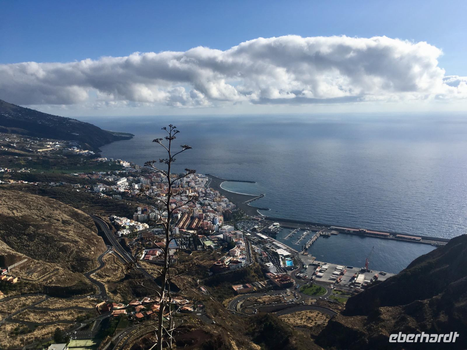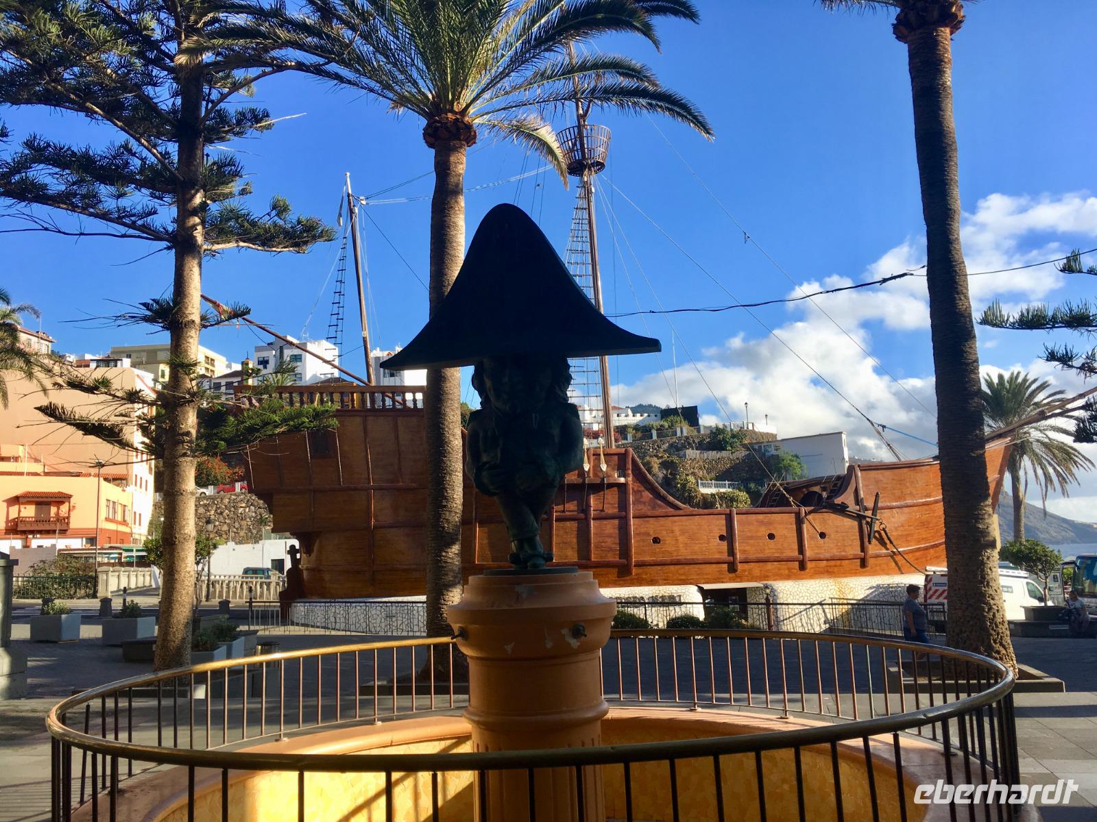 Die heutige Nacht wird von einem kräftigen Meeresrauschen begleitet. Schließlich ist das Hotel unmittelbar neben dem Meer gelegen. Und so kommen wir am Morgen auch in den Genuss, bei einem ausgiebigen Frühstück einen wunderschönen Sonnenaufgang am Meer mitzuerleben. Die Sonne geht rotgefärbt langsam am Horizont auf und bietet uns somit eine herrliche Kulisse. Der heutige Tag soll uns weitere Facetten der kanarischen Inseln aufzeigen, die wir bei einem Ausflug in den Süden erleben werden. Hierfür holt uns unser Reiseleiter Rudi ab und kurz darauf trifft der Busfahrer Sergio mit seinem Bus ein. Wir freuen uns darauf, uns heute die Insel von Rudi zeigen zu lassen. Er erzählt uns auf dem Weg in das Stadtzentrum, dass er bereits 35 Jahre lang auf La Palma lebt und aus seinen Erzählungen heraus merken wir rasch, dass er ein wahrer La Palma-Kenner ist. Unseren ersten Halt legen wir im Stadtzentrum Santa Cruz ein, wo wir eine Reproduktion des Schiffes Santa María erblicken, mit dem Kolumbus 1492 die amerikanische Küste erreichte. Es soll an die Seefahrer und Auswanderer erinnern, die insbesondere nach Kuba ausgewandert sind. Vor dem Schiff thront eine Zwergenstatue, die den Enanos (Zwergen) gewidmet ist. Sie haben in der kanarischen Geschichte eine lange Tradition. In La Palma findet alle fünf Jahre eine große Feier statt, bei der die 'Jungfrau des Schnees' von der Kirche hinunter in das Dorf getragen und von vielen Menschen begleitet wird (La Bajada). Dort angelangt, wird der Zwergentanz (La Danza de Enanos) getanzt von in Kostümen gehüllte Menschen. Sie tragen einen übergroßen Dreispitz und Masken. Im kommenden Jahr ist es wieder soweit und La Palma ist schon fleißig mit den Vorbereitungen beschäftigt, und hierunter nicht zuletzt mit einem Casting für zukünftige Zwerge.