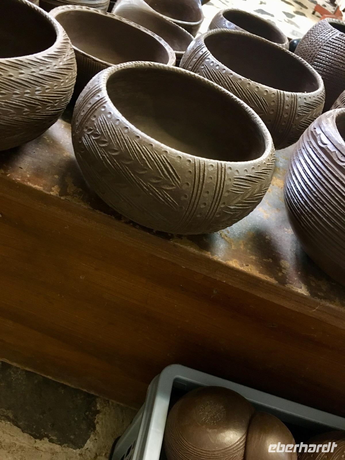 Im Anschluss erwartet uns ein Kontrastprogramm. Im Süden gelegen sind die Salinen von Fuencaliente (heiße Quelle), die einzige noch in Betrieb befindliche Salzgewinnungsanlage der Kanaren. Für La Palma weist die Saline eine jahrhundertelange Bedeutsamkeit auf. Im dortigen Restaurant El Jardín de la Sal lässt sich die Mehrheit unserer Eberhardt-Gruppe nieder und legt eine Verschnaufpause bei einem Kaffee, Eis oder Stück Kuchen mit Blick auf den Leuchtturm ein. Für den Nachmittag haben wir den Besuch des Vulkans San Antonio geplant. Wir bestaunen bei einem Spaziergang über den runden Kraterrand die Kulisse, die uns hier geboten wird, ganz langsam scheinen die Wolken über den Krater zu ziehen. Unser letzter Programmpunkt soll für heute die Töpferwerkstatt El Molino von Ramón sein. Wir fahren wieder Richtung Osten und dort angelangt, dürfen wir Ramon dabei zuschauen, wie er sein Kunsthandwerk vollbringt. Dabei bleibt er stets nah am Original der Fundstücke und benutzt keine weiteren Farben, sondern verfährt so, wie es die Ureinwohner einst machten.