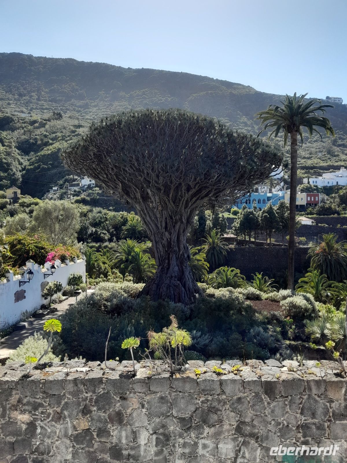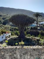 Schon unterwegs zu unserem nächsten Stopp bestaunen wir die, wie riesige Brokkoli in die Landschaft geworfenen Drachenbäume. In dem kleinen Dorf Icod de los Vinos, sehen wir dann wenig später das wohl älteste Exemplar der Welt, den tausendjährigen "Drago Milenario". Er misst sechs Metern im Umfang und bringt es auf eine Höhe von siebzehn Metern. Wirklich beeindruckend, allerdings lernen wir, dass er nicht wirklich ein Baum ist, sondern ein Agavengewächs – so wie Bananen keine Palmen sind, sondern Stauden und sehr eng mit Strelitzien verwandt. Gisela erklärt uns noch eine ganze Menge mehr zur lokalen Botanik bevor wir durch die Berge weiterfahren.