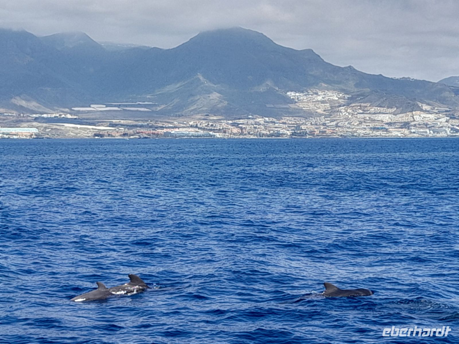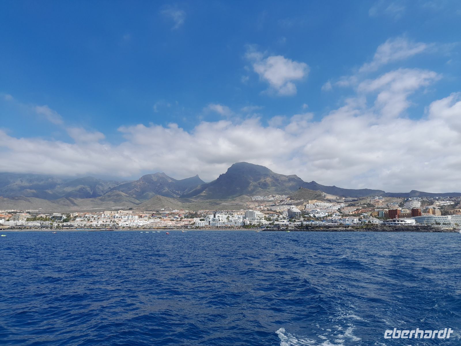 Glücklicherweise, zumindest für die Seekranken, geht es nun so langsam wieder zurück Richtung Küste. Man hat nun eine fantastische Aussicht auf die zerklüftete Südküste Gran Canarias mit den Stränden von Puerto Rico und etwas weiter entfernt Maspalomas. Am Horizont kann man heute auch wunderbar die Nachbarinsel Teneriffa mit dem Teide erkennen.