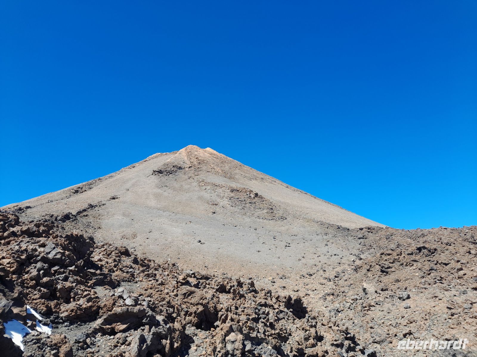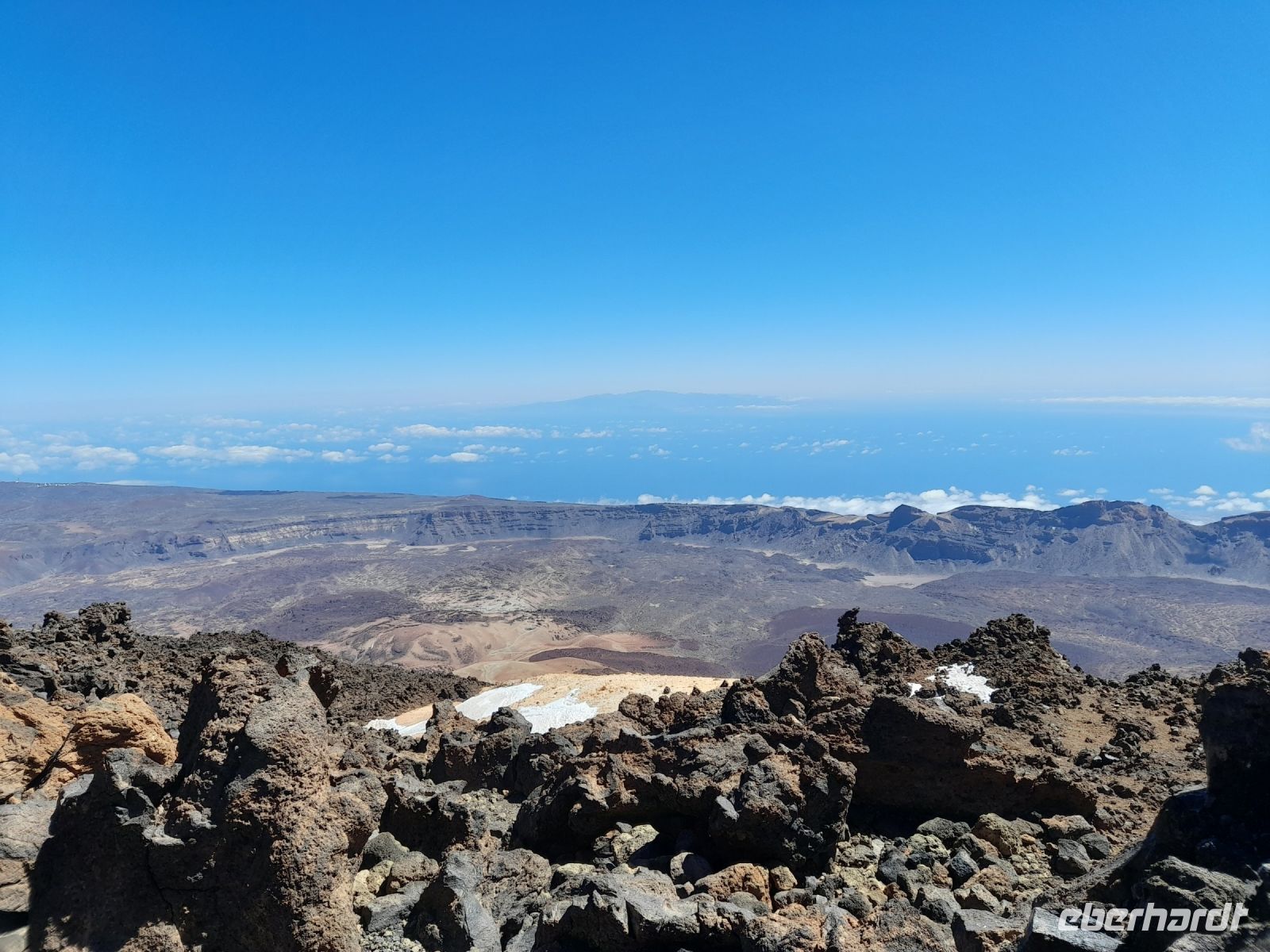 Schließlich erreichen wir trotz einigem Verkehrsaufkommen die Talstation der Teide Seilbahn auf 2356 Metern. Das wunderbare Wetter spielt uns in die Karten, denn oftmals ist die Auffahrt aufgrund zu starken Windes nicht möglich. Heute läuft jedoch alles prima: in acht Minuten bringt uns die Gondel hinauf auf 3555 Meter – der Gipfel ist nun zum Greifen nah, für den Aufstieg braucht man jedoch eine gesonderte Genehmigung. Wir genießen also von hier den fantastischen Weitblick und das letzte bisschen Schnee, was hier in den Schattenlöchern noch hängt. Selbst hier oben herrschen fast frühlingshafte Temperaturen – da kann man doch mal ein schadensfrohes Schneebild nach Hause schicken.