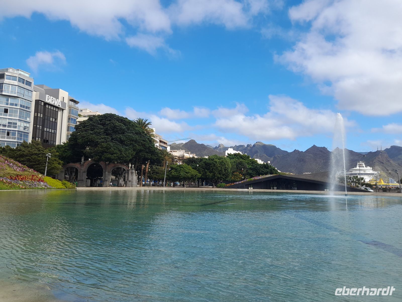 de Meuron die Neugestaltung des Platzes. So findet sich nun nach dem Cabildo Insular aus den 1930er Jahren und dem Denkmal für die Gefallenen des Bürgerkriegs von 1947 ein großer Teich in der Mitte des Platzes, von unserem Reiseleiter José etwas abfällig „Ententeich“ genannt. Enten finden wir jedoch keine, dafür aber Kanarienvögel und etwas weiter entfernt an der Hafenmole mehrere Kreuzfahrtschiffe. Wir haben nun ein wenig Zeit, um auf eigene Faust durch die Gassen zu schlendern, bevor es dann weiter geht in die alte Inselhauptstadt, San Cristóbal de La Laguna.