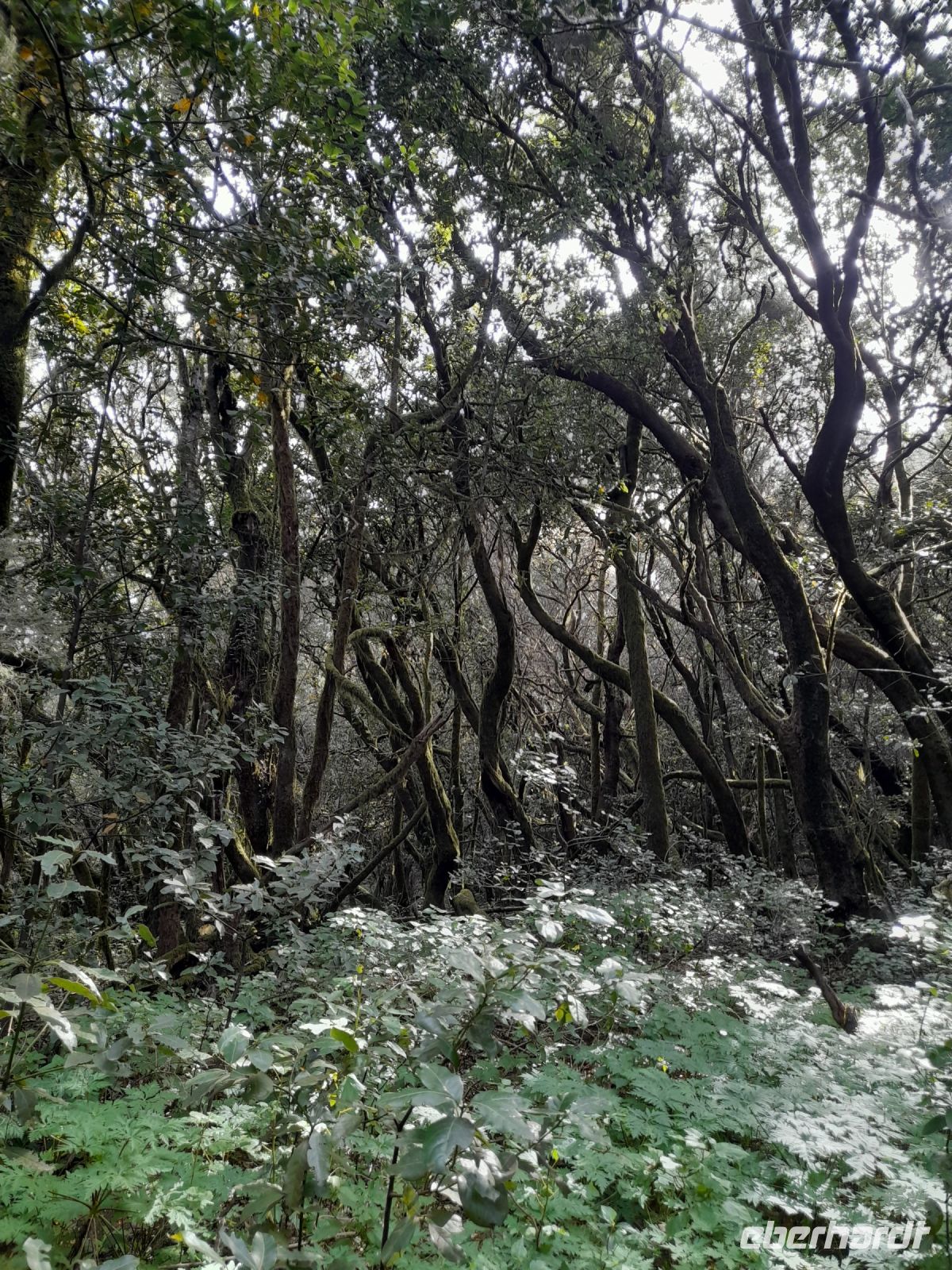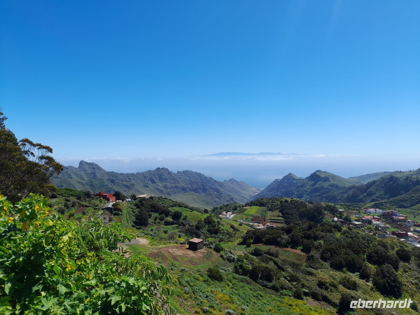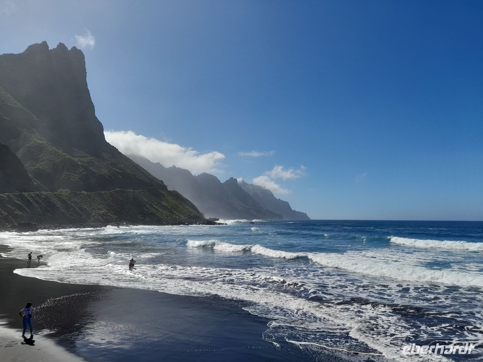 Wir verlassen die Stadt in Richtung Nordosten und erreichen schon nach kurzer Zeit die Ausläufer des Anaga-Gebirges. Über enge Straßen schlängeln wir uns langsam empor und können am Mirador de Jardina noch einmal einen fantastischen Blick über La Laguna und den weiter östlich liegenden Teide genießen. Auf dem Parkplatz bietet sich auch die Gelegenheit ein paar leckere Kekse oder getrocknete Feigen zu kaufen, um den sich langsam ankündigenden Hunger ein wenig zu vertreiben. Denn bevor wir in den Genuss unseres Mittagessens kommen, führen uns zunächst weitere Serpentinen hinein in den mystischen Mercedes-Wald, das letzte Stück des noch auf Teneriffa erhaltenen Lorbeerwalds. Die märchenhafte Stimmung der Umgebung, sowie die souveränen Fahrkünste unseres Busfahrers lassen die weitere Fahrt nicht langweilig werden. Schließlich teilt sich die Straße: rechts geht es zurück nach Santa Cruz, dessen Hafen wir weit unten im Tal erkennen können, links geht es nach Taganana. Der Name bedeutet soviel wie „von Bergen umgeben“ und das ist kein Zufall. Langsam bahnt sich unser Bus den Weg hinunter an die Küste. Die Aussicht auf den äußersten Norden Teneriffas ist wirklich atemberaubend.