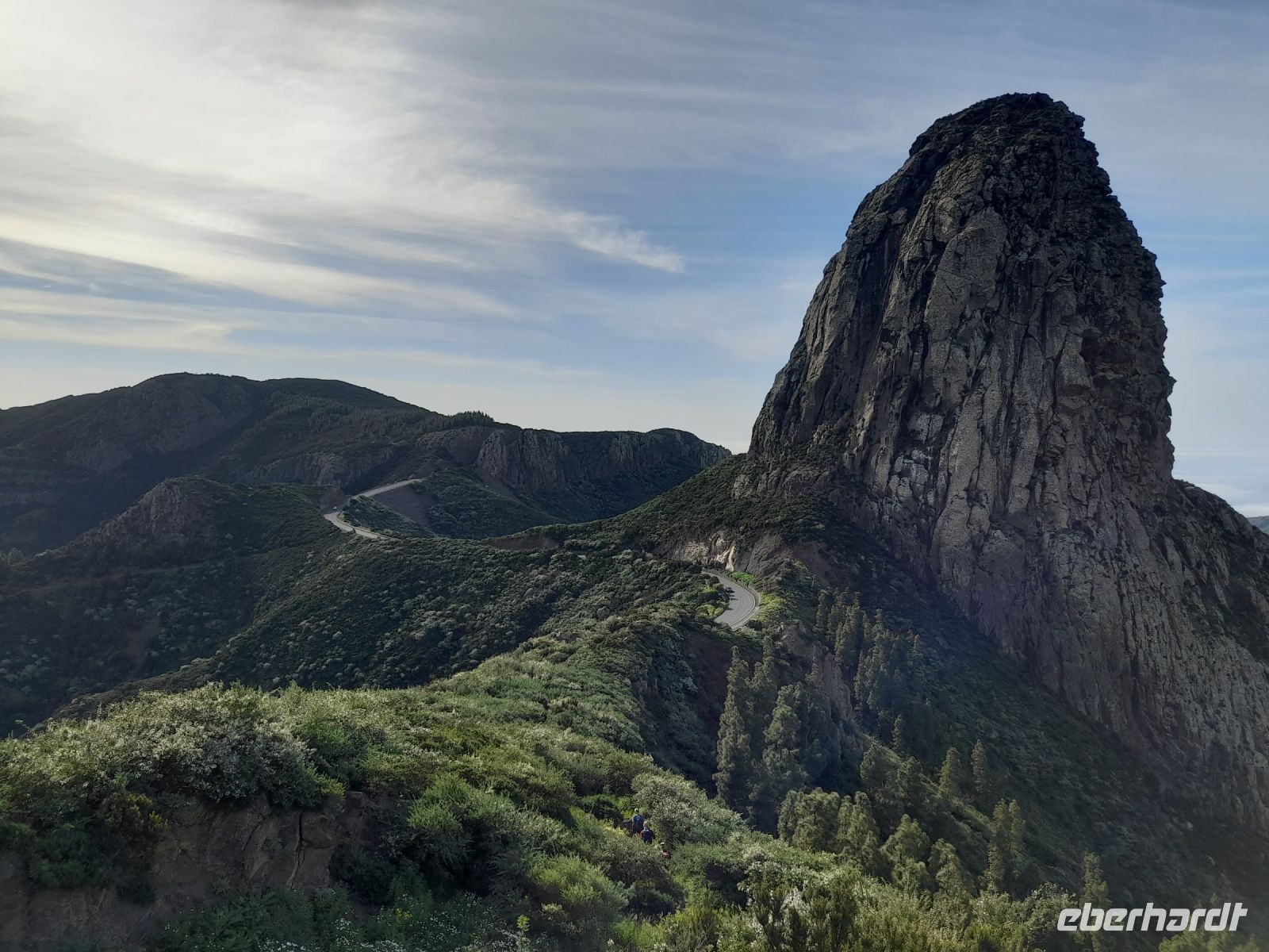 Am Mirador del Morro de Agando legen wir unseren ersten Stopp ein, um die Pflanzenwelt etwas näher zu betrachten und die fantastische Aussicht zu genießen. Teneriffa und der Teide scheinen heute zum greifen nah zu sein. Am Rande des Nationalparks befindet sich der beliebte Treffpunkt „Laguna Grande“ - ihren Namen hat die Lichtung von dem Umstand, dass sich die Senke bei starkem Regen mit Wasser füllt und dann zumindest für kurze Zeit wie eine Lagune aussieht. Hier haben wir die Möglichkeit ein wenig durch den Lorbeerwald zu spazieren und dann im urigen Restaurant den typischen Hochlandschnaps „Gomeron“ zu probieren. Die Kellner hier kommunizieren untereinander noch in der traditionellen Pfeifsprache „El Silbo“ und der Chef erklärt sich bereit, sie uns ein wenig näherzubringen und uns zu demonstrieren, wie sie funktioniert – zu unserer Überraschung ist sie polyglott: auch Deutsch kann problemlos direkt in El Silbo umgewandelt werden.