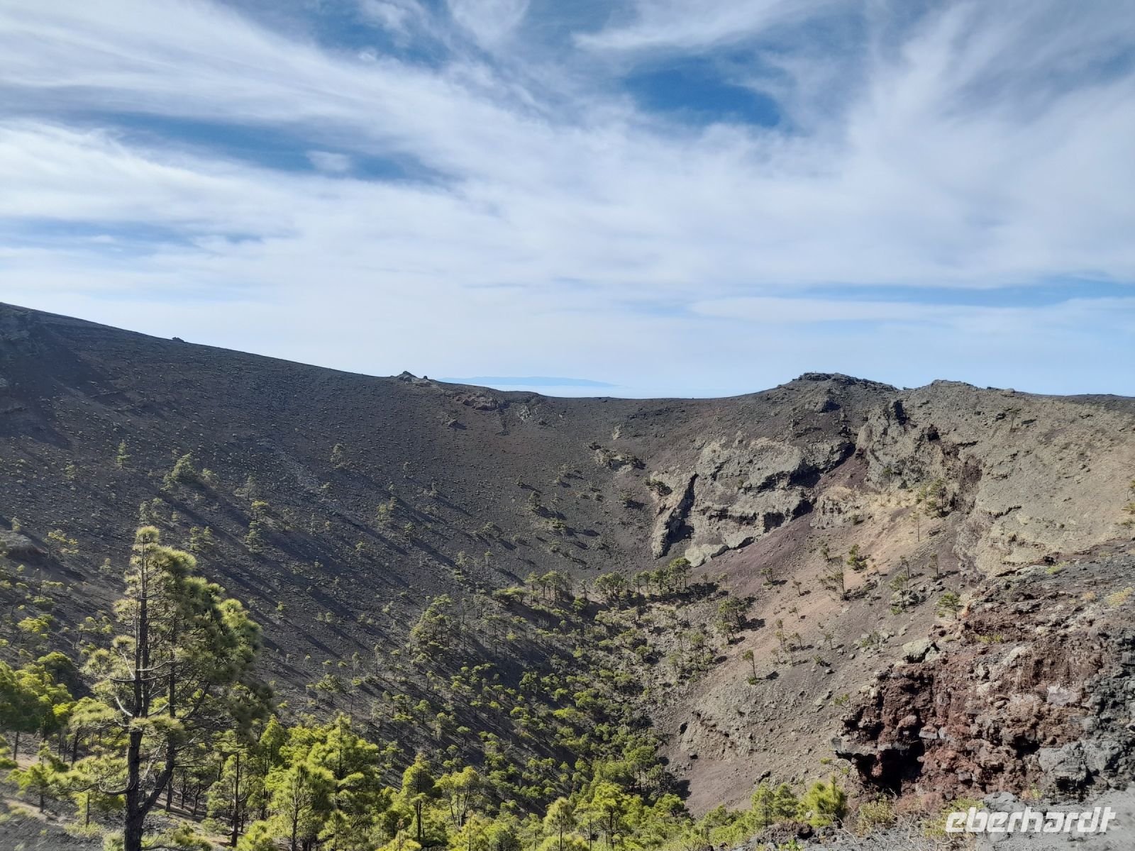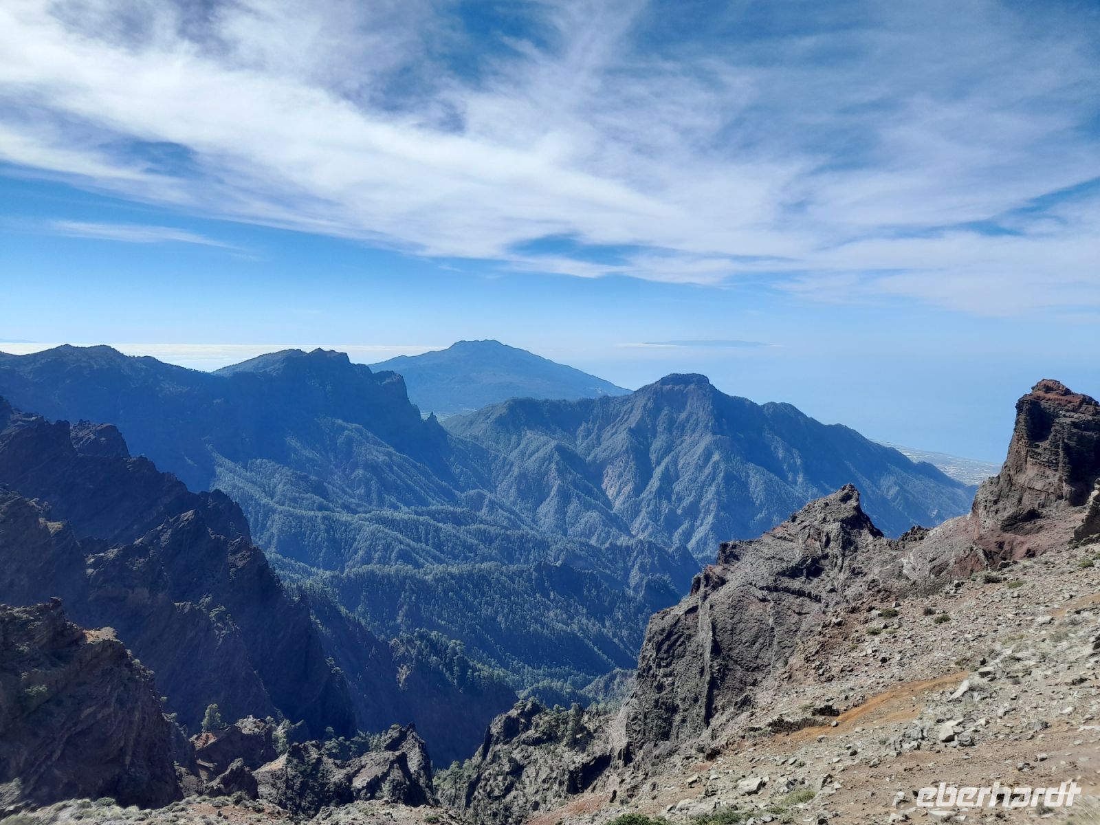Die drittkleinste der Kanaren ist nicht nur die vulkanischste, sondern auch die feuchteste und für viele auch die schönste Insel, daher auch der Beiname „Isla Bonita“. Mit einem Alter von etwa zwei Millionen Jahren ist La Palma auch das Nesthäkchen unter ihren Schwestern und ihre Entstehung lässt sich sehr gut nachvollziehen. Unser Ziel ist heute also der älteste und höchste Teil der Insel im Norden. Mit drei Autos geht unser Abenteuer in Richtung des Nationalparks Caldera de Taburiente los. Unterwegs stellen wir des Öfteren fest, dass die kleineren Vehikel heute ganz praktisch sind, denn recht schnell landet wir jenseits von Santa Cruz auf einer engen und kurvenreichen Straße. Unterwegs zum höchsten Punkt der Insel durchqueren wir drei Vegetationszonen: zunächst die üppige tropische Zone, die dominiert wird durch den landwirtschaftlichen Anbau von Avocados, Mangos, Papayas und natürlich Bananen. Auf etwa 900 Metern höhe beginnt dann der Wald aus Lorbeergewächsen und kanarischen Kiefern und schließlich verlassen wir auf über 1500 Metern den Wald und finden uns in einer zerklüfteten Landschaft mit alpiner Flora wieder. Hier oben legen wir auch unseren ersten Stopp ein und haben eine fantastische Aussicht auf die Nachbarinseln Teneriffa, La Gomera und El Hierro. Außerdem können wir einen ersten Blick in die sogenannte Caldera de Taburiente werfen. Rein geologisch handelt es sich war um keine Caldera, aber dennoch um einen Vulkankrater mit etwa neun Kilometer Durchmesser und 28 Kilometer Umfang. Der tiefste Punkt des ältesten Teils der Insel liegt auf etwa 400 Metern, sodass sich geschützt im Krater zahlreiche Arten von Pflanzen erhalten und weiterentwickeln konnten. So gibt es zum Beispiel 19 Arten von endemischen Bäumen, die sonst nirgendwo auf der Welt zu finden sind.