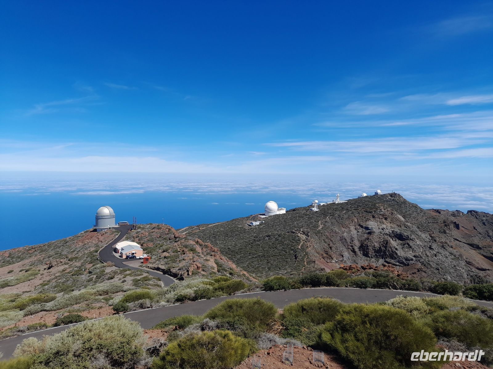 Wir fahren nun noch weiter hinauf in Richtung des Roque de los Muchachos auf 2426 Meter Höhe. La Palma ist Himmel-Schutzgebiet, das heißt, dass Lichtverschmutzung hier weitestgehend vermieden wird und man ideale Voraussetzungen für die Beobachtung des Tag- und Nachthimmels hat. So finden sich hier die wichtigsten Observatorien und Teleskope der nördlichen Hemisphäre und Forscher aus 131 Ländern arbeiten hier. Besonders beeindruckend sind die riesigen Spiegel zur Erforschung der Gamma-Strahlung, die wie außerirische Erscheinungen mitten in der kargen Landschaft stehen. Auf dem Roque de los Muchachos haben wir die Möglichkeit einen kleinen Spaziergang zu unternehmen und von hier die Caldera de Taburiente, den vulkanischen Bergrücken im Süden und den neuen Vulkan Tajogaite zu überblicken.