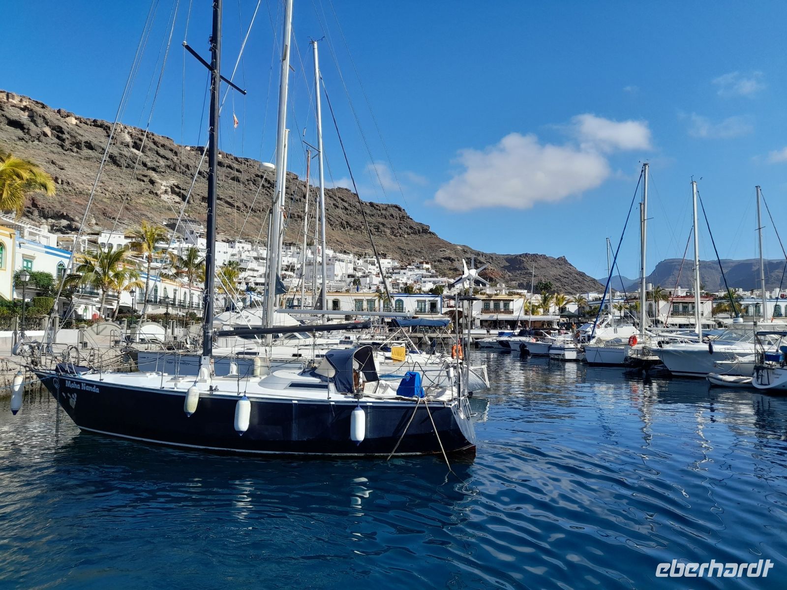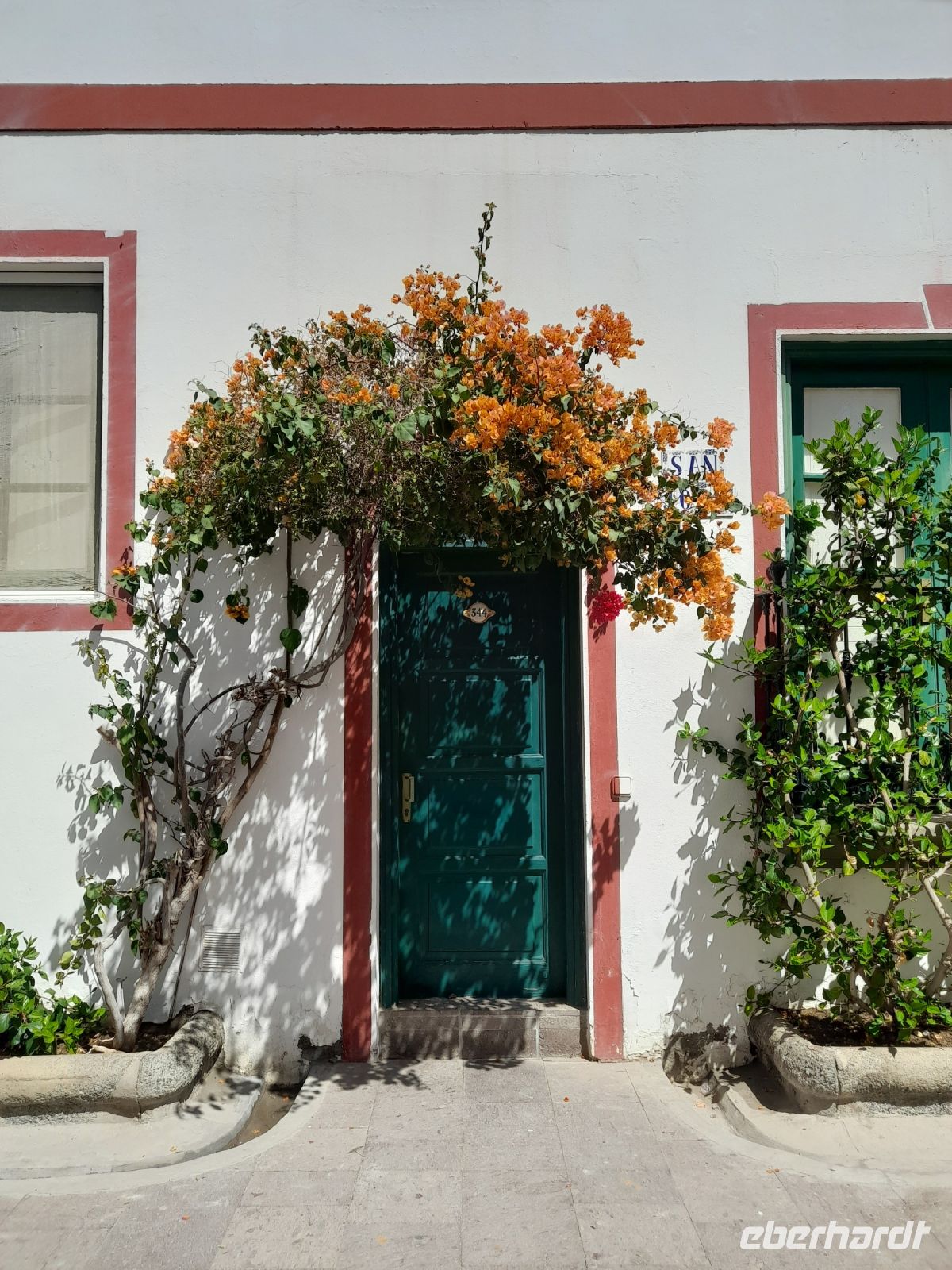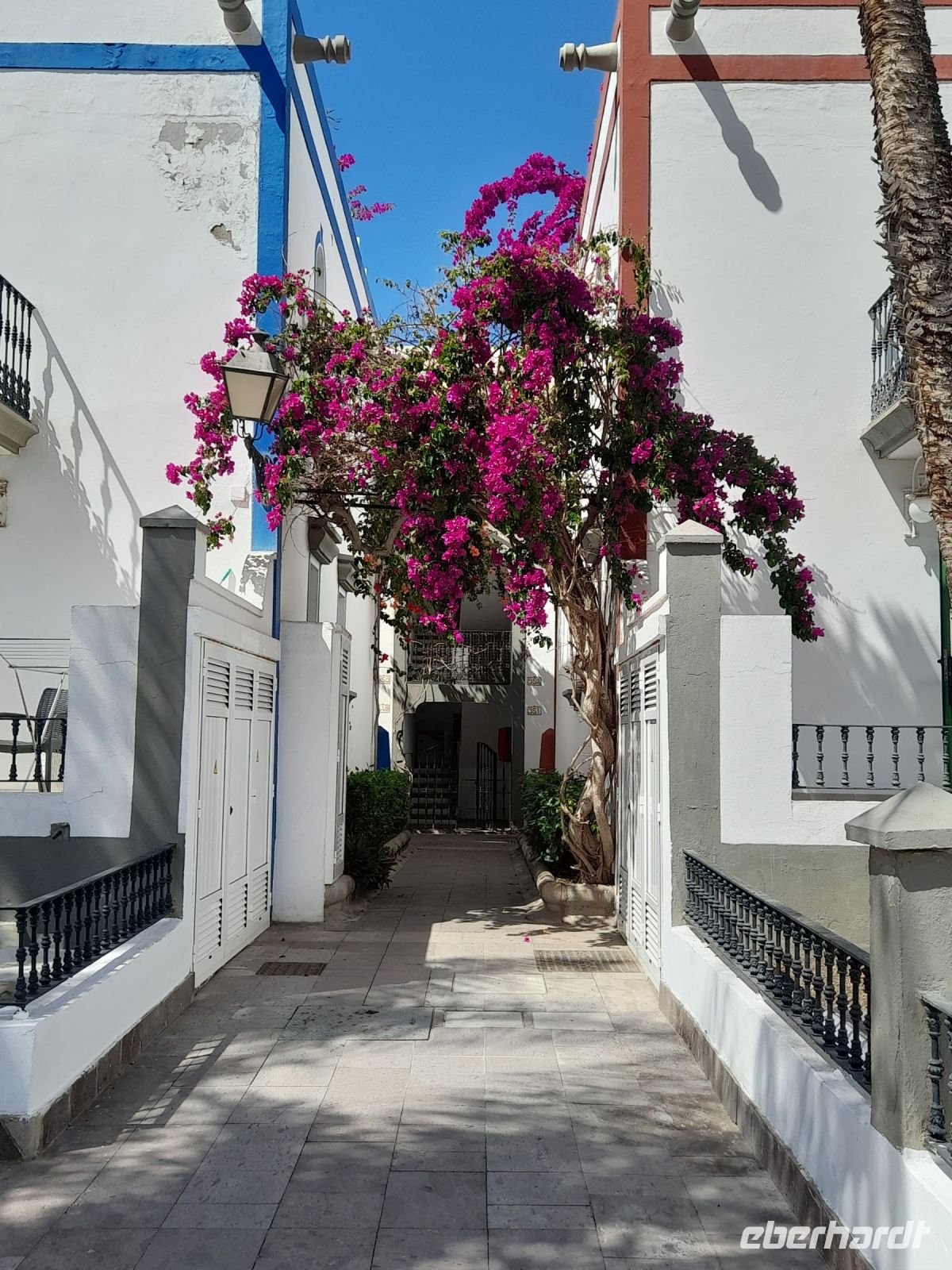 Unser heutiges Ziel liegt nicht weit entfernt von Maspalomas im trockenen Süden Gran Canarias. Nach einer halben Stunde Fahrt erreichen wir das pittoreske Fischerdorf Puerto de Mogán. Es ist vor allem dafür bekannt, dass sich hier, im Gegensatz zu den meisten ehemaligen Dörfern an der Küste, die alte Architektur erhalten hat und nicht die Hotelanlagen Überhand genommen haben. So kann man hier gemütlich durch die kleinen Gassen weiß getünchter Häuschen mit bunten Fensterrahmungen schlendern und die prächtigen Bepflanzungen wunderbar gedeihender Zierpflanzen bewundern.