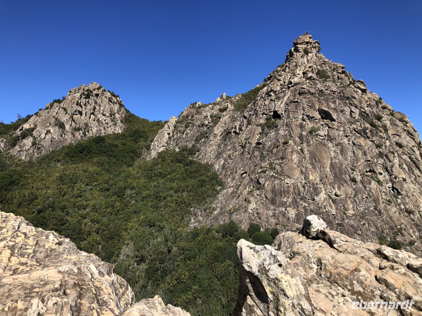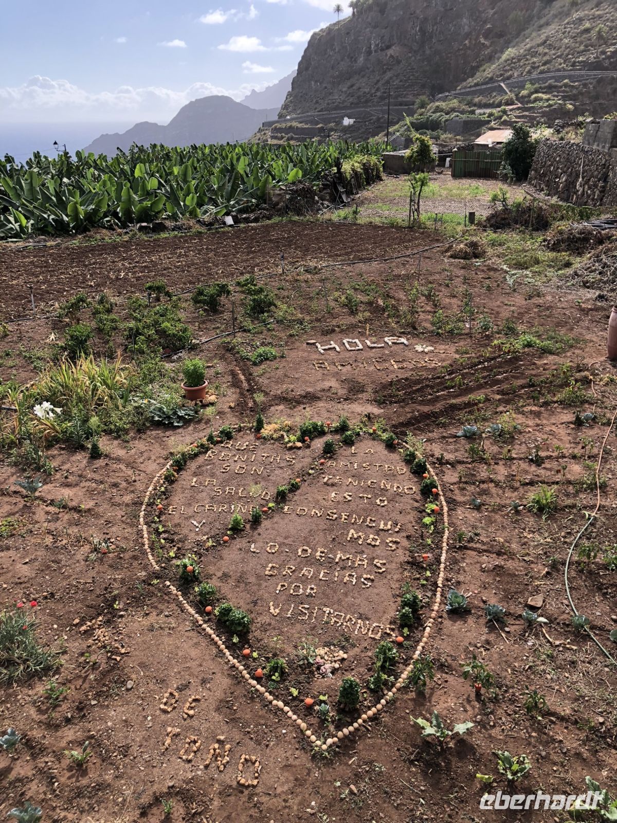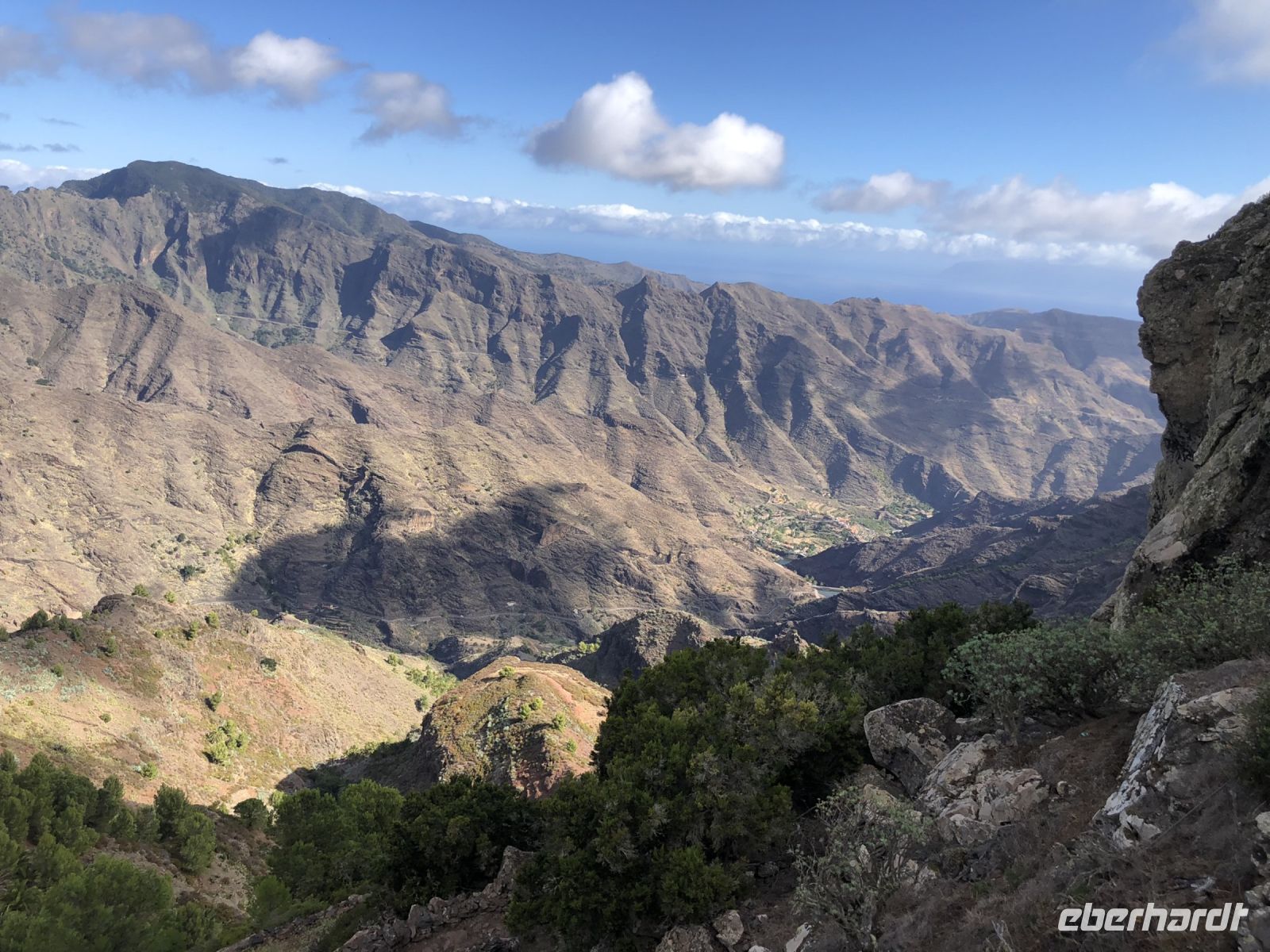 Das Mittagessen fand über der Schlucht statt, mit leckeren kanarischen Kartoffeln, Fleisch und Fisch der Region sowie dem typischen Dessert „Quesillo“ mit Palmenhonig. Da haben wir auch der Pfeifsprache auf Spanisch und Deutsch zu gehört.