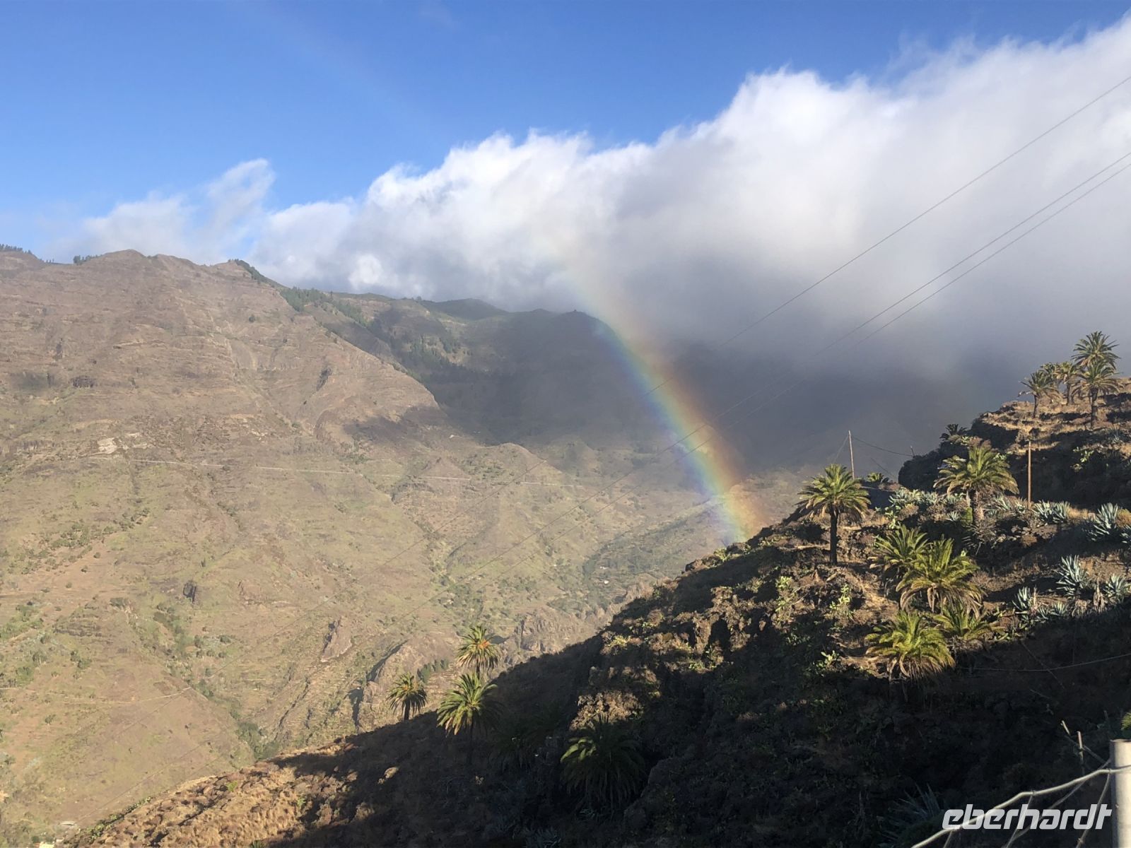 Mit einem wunderschönen Sonnenaufgang begannen wir den Tagesausflug in Richtung Hermigua. Auf dem Weg haben wir einen malerischen Regenbogen bewundern können. Die Küstenlinie erwärmt sich zeitig und oberhalb ist noch die Wolkendecke. In Hermigua haben wir die schönsten Kekse der Insel probiert, besonders die Zitronen- und Mandelkekse sowie einen leckeren Barraquito-Kaffee.