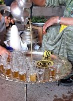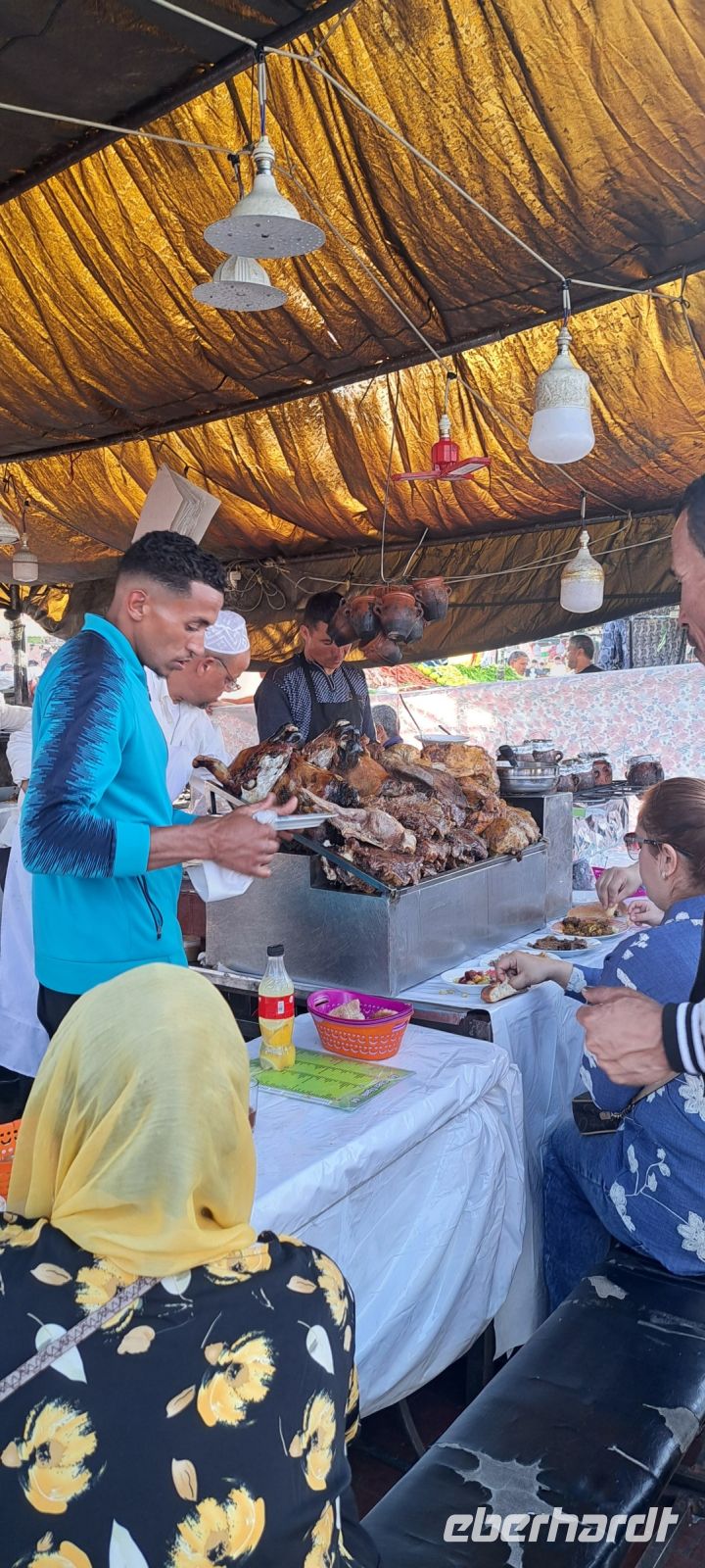 Nun erleben wir noch den großen Platz bei Dunkelheit er hat sich in ein lebhaftes Spektakel verwandelt. Es gibt zahlreiche Essensstände, die köstliche marokkanische Spezialitäten anbieten, von gegrilltem Fleisch ( auch leckere Schafsköpfe! ) bis hin zu frischen Säften und traditionellen Süßigkeiten. Musiker, Schlangenbeschwörer und Gaukler (die arme Äffchen für Fotos anbieten) unterhalten die Besucher. Die Geräusche und Düfte sind überwältigend und machen den Djemaa el Fna zu einem unvergesslichen Erlebnis. Es ist ein Ort, an dem man die Kultur und das Leben der Einheimischen hautnah erleben kann. Mohamed läd uns an einem Stand noch zu einem Gewürztee ein. Voll mit Eindrücken fahren wir zurück zum Hotel. Was für ein Tag.........