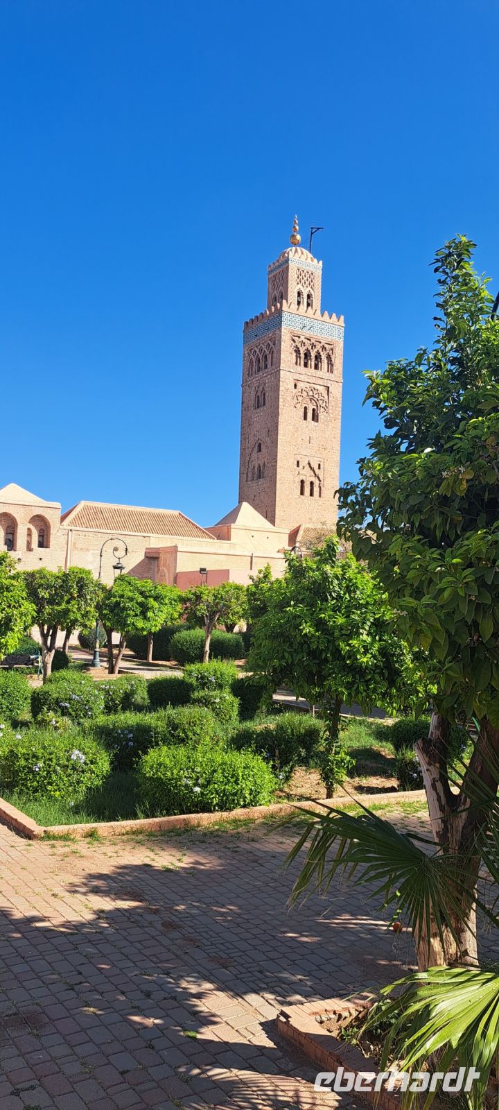Mit Mohamed der uns gut gelaunt nach dem Frühstück abholt, beginnen wir unsere Tour an der beeindruckenden Koutoubia-Moschee, dem Wahrzeichen Marrakeschs, das mit seinem majestätischen Minarett die Skyline dominiert. Die Koutoubia-Moschee ist das größte und bekannteste religiöse Gebäude in Marrakesch und ein herausragendes Beispiel für die maurische Architektur. Sie wurde im 12. Jahrhundert unter der Almohaden-Dynastie erbaut und beeindruckt mit ihrem majestätischen Minarett, das sich 77 Meter in die Höhe erhebt und die Skyline der Stadt prägt. Obwohl die Moschee selbst nur für Muslime zugänglich ist, können wir die beeindruckende Architektur und die schönen Gärten rund um das Gebäude bewundern.