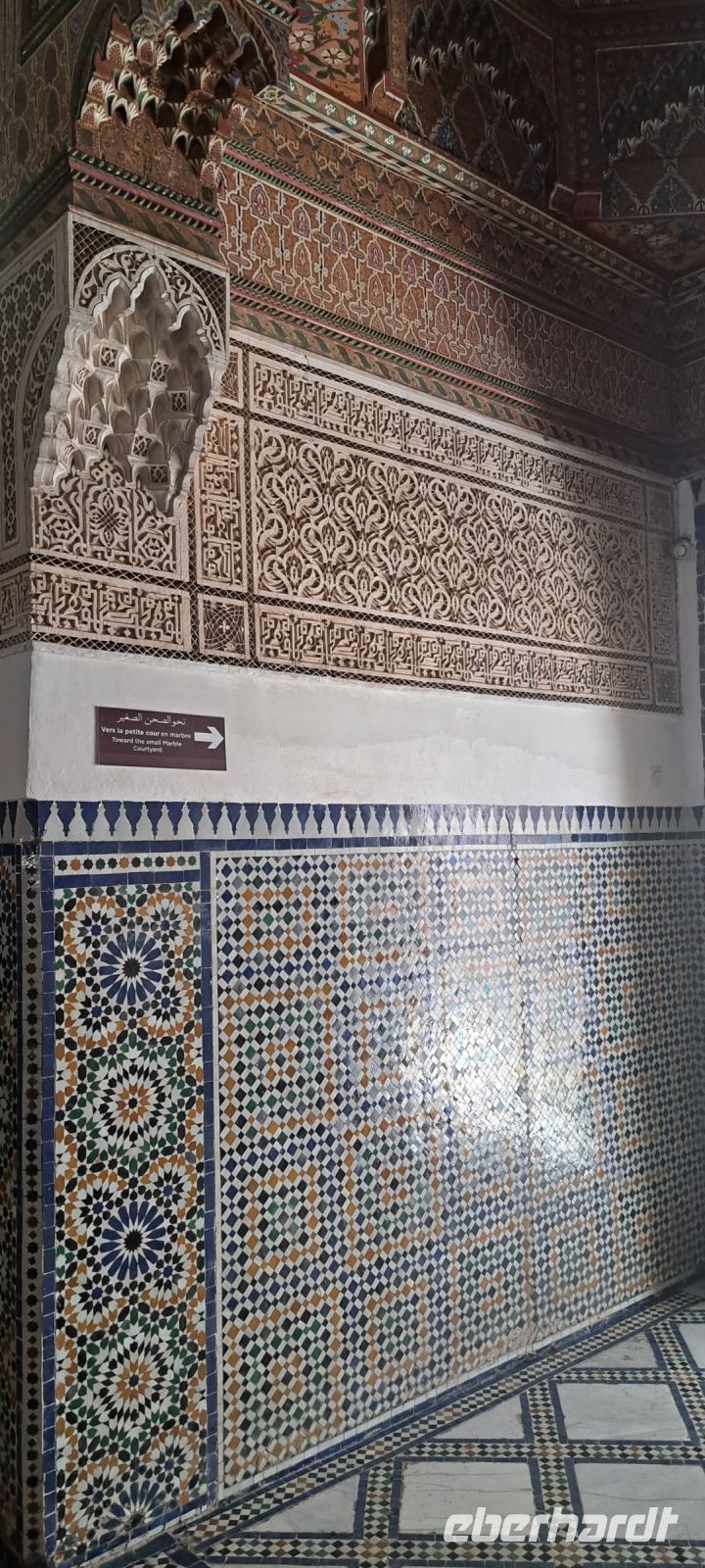 Der Palast ist bekannt für seine kunstvollen Innenräume, die mit filigranen Stuckarbeiten, bunten Zellige-Mosaiken und wunderschönen Holzdecken verziert sind. Die Räume sind großzügig gestaltet und bieten einen Einblick in die Lebensweise der damaligen Elite. Besonders beeindruckend sind die großen Innenhöfe und Gärten, die mit Orangenbäumen, Palmen und blühenden Pflanzen geschmückt sind.