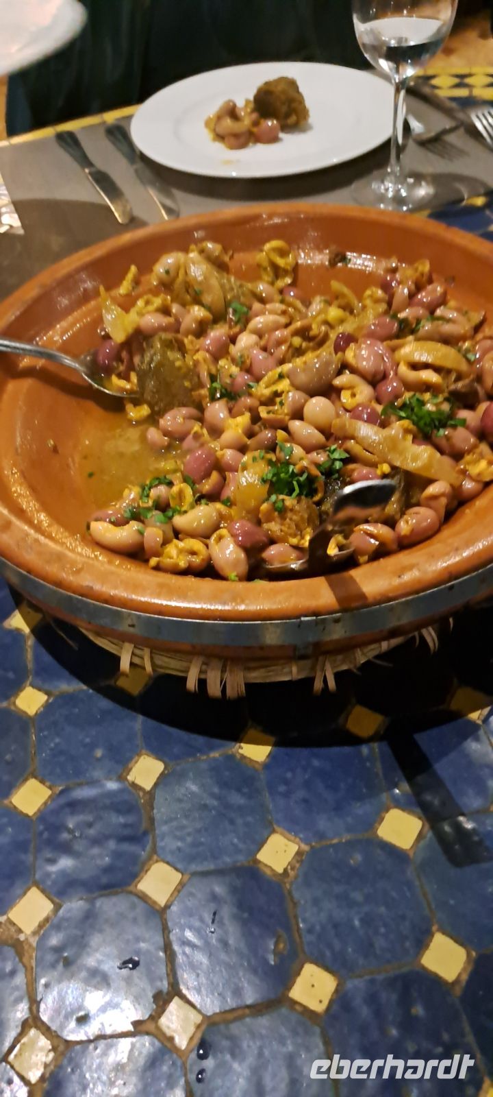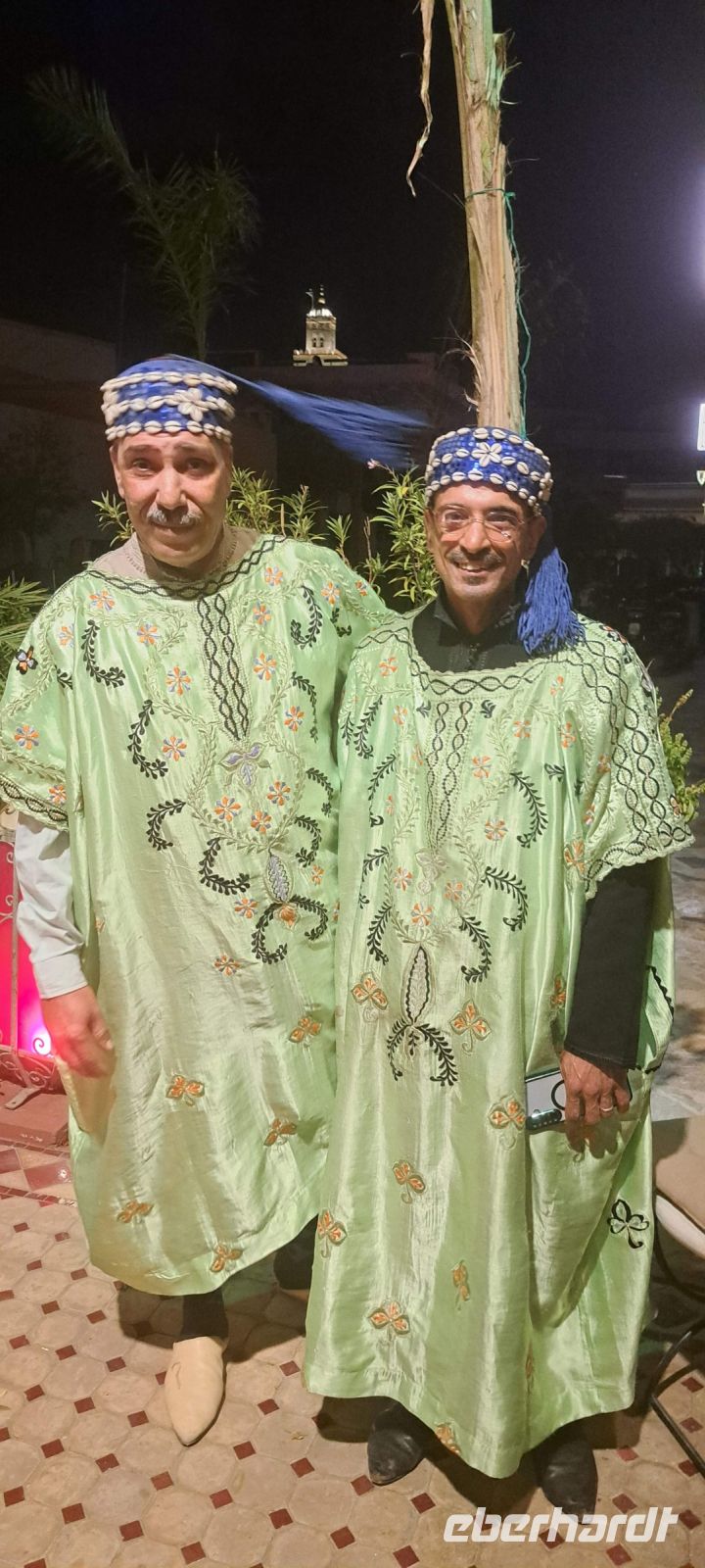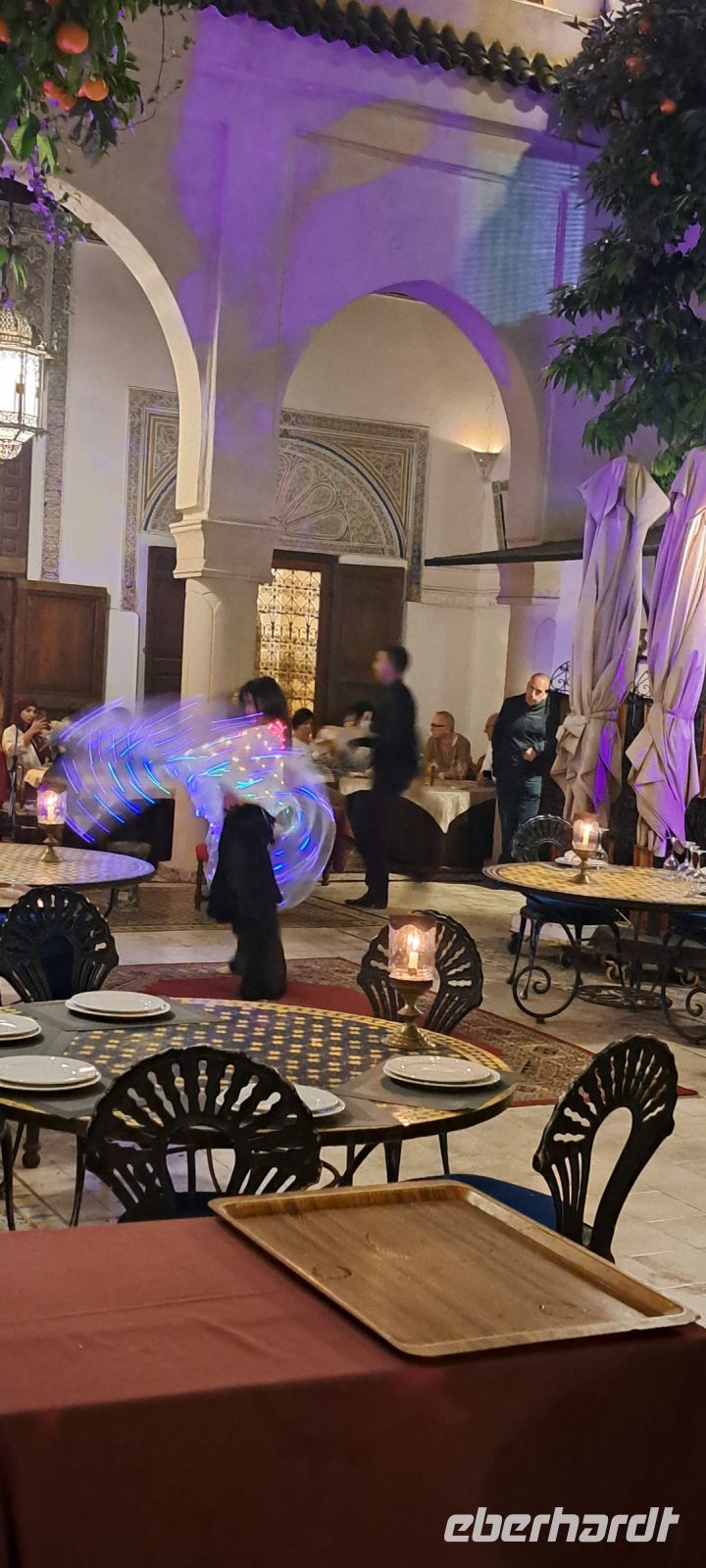 Zum Abendessen geht es wieder Richtung Gauklerplatz zu einem typischen marokanischen Restaurant "Al Baraka". Wir sitzen im Innenhof und genießen unsere erste Tajine (.Eine Tajine ist ein traditionelles marokkanisches Kochgeschirr, das aus Ton oder Keramik besteht und eine charakteristische konische Form hat. Sie wird oft verwendet, um Eintöpfe und Schmorgerichte zuzubereiten, die durch das langsame Garen besonders zart und aromatisch werden. Die Form der Tajine sorgt dafür, dass der Dampf zirkuliert und die Aromen sich gut entfalten können. Typische Zutaten sind Fleisch, Gemüse, Gewürze). Zu unserer Überraschung treten noch zwei Bauchtänzerinnen auf...............wie nett!!