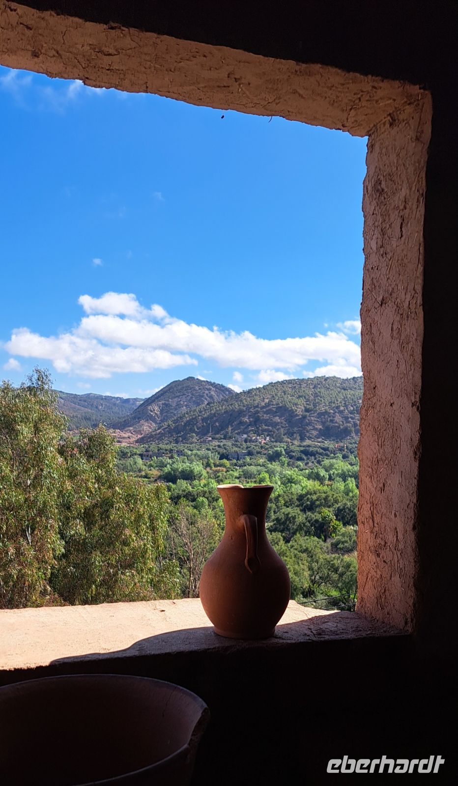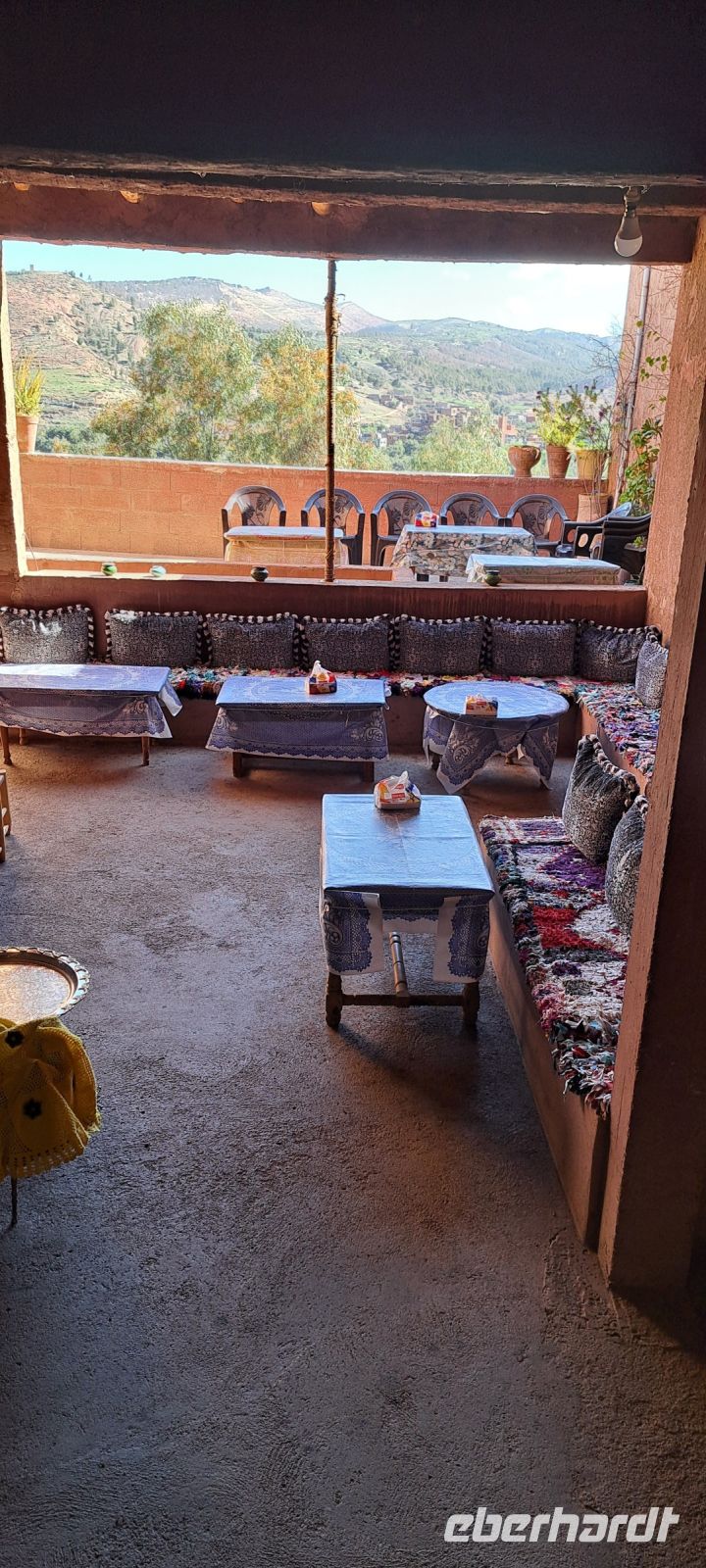Die Mittagspause verbringen wir auf der Terrasse mit herrlicher Aussicht auf das Atlas Gebirge .Im Restaurant "Amnougour" wieder wird uns eine traditionelle leckere Tajine serviert.
