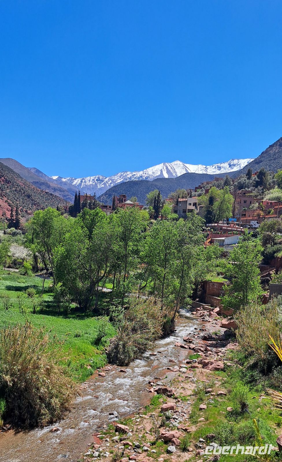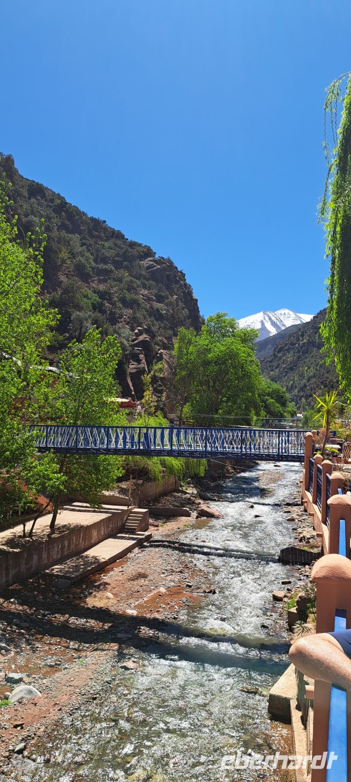 Heute ging es für die meisten von uns ins Ourika Tal. Es liegt etwa 30 Kilometer von Marrakesch entfernt und ist bekannt für seine atemberaubende Landschaft, die von grünen Berghängen, traditionellen Berberdörfern und einem Fluss der durch das Tal fließt (mit vielen "Wackelbrücken" über den Fluss) geprägt ist. Das wunderschöne Panorama des Atlasgebirges mit den schneebedeckten Gipfeln, der höchste Berg der Toubkal ist 4167m hoch, begleitet uns bei der Tour.