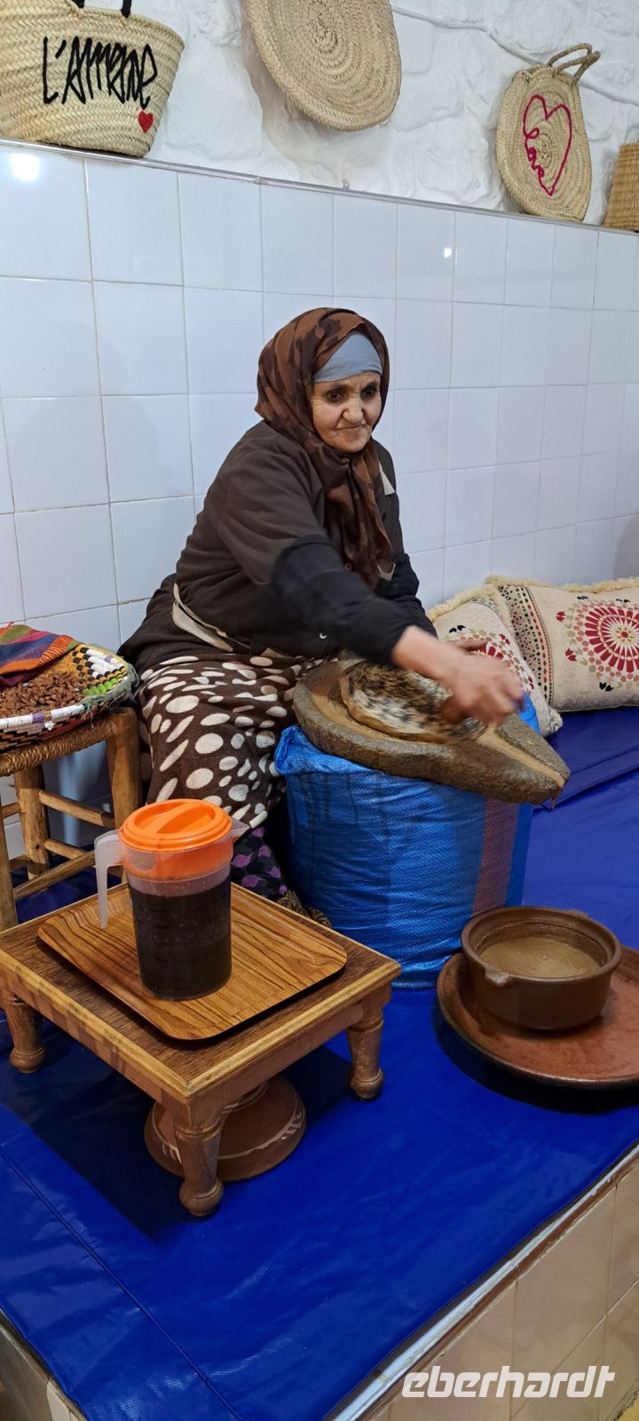 Eine kurze Wanderung entlang des Flusses bringt uns zu der Frauenkooperation, Hier finden Witwen, Geschiedene ältere Frauen eine sinnvolle Aufgabe, es ist eine lokale gemeinnützige Gemeinschaft. Wir schauen zu, wie das wertvolle Öl aus den Arganfrüchten gewonnen wird. Die hergestellten Produkte werden zum Verkauf angeboten. Das Arganöl ist gut für die Schönheit der Haare und der Haut, ist auch eine Medizin und zum Kochen geeignet durch jeweils verschiedene Verarbeitung. Na denn da kann nicht mehr viel schief gehen.........und viele von uns nehmen ein kleines Souvenir mit.