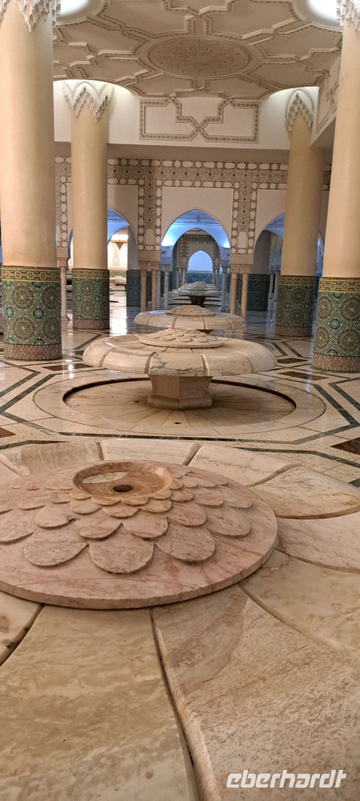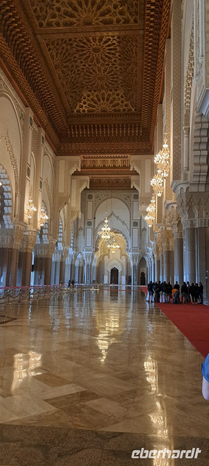 Wir betreten die einzige Moschee die von Touristen besichtigt werden kann. Die Hassan II Moschee ist die größte Moschee in Marokko ( 20000qm Gebetshalle ) und die drittgrößte der Welt. Die Moschee wurde direkt am Atlantik erbaut und bietet eine atemberaubende Aussicht auf das Meer. Sie bietet innen Platz für über 25000 Personen und weitere 80000 Plätze im Außenbereich. Sie ist nach dem seit 1961 regierenden und 1999 verstorbenen König Hassan II benannt. "Wie der Thron Allahs über dem Wasser" ist sie in einer Rede von König Hassan erwähnt worden. Nach über 7Jahren Bauzeit ist sie 1993 zum 60ten Geburtstag de Königs eingeweiht worden. 35000 Handwerker, Arbeiter und Zulieferer waren mit dem Bau beschäftigt. Die Moschee ist ein Geschenk( aus Steuermitteln!!) des marokkanischen Volkes an seinen König.( Baukostenwerden auf ca. 400-700Millionen Dollar geschätzt) Das Dach öffnet sich automatisch, es gibt eine Fußbodenheizung, Rolltreppen, Aufzüge und ein Laserstrahl zeigt nachts Richtung Mekka.