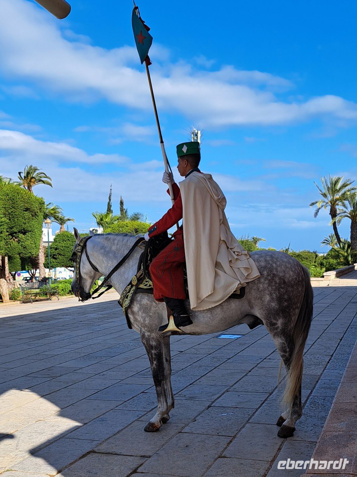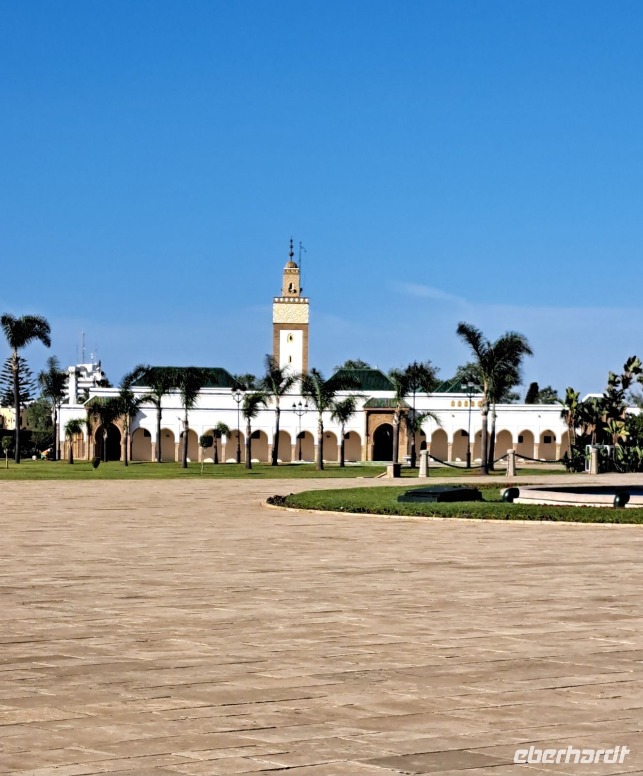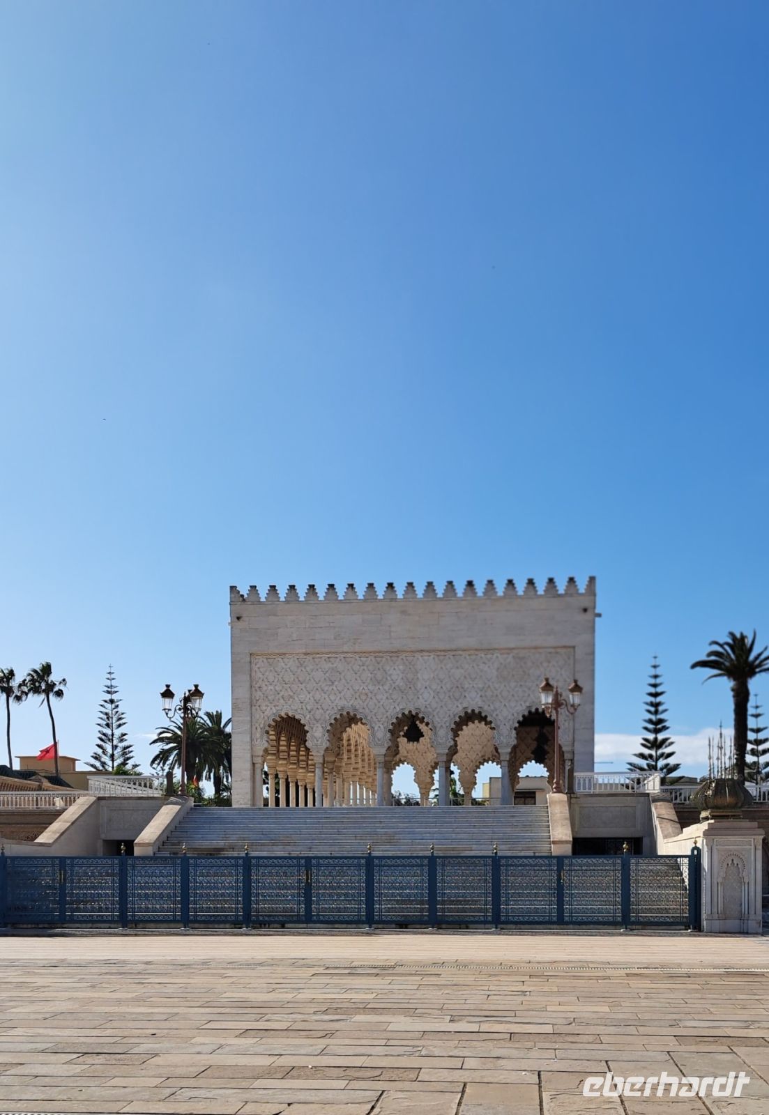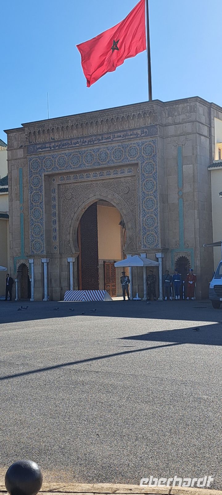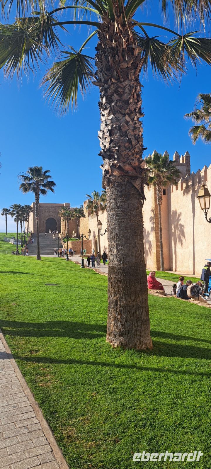 Die Umgebung des Mausoleums ist ebenfalls sehenswert, mit schönen Gärten und einem Blick auf die Hassan-Turm-Ruine, die ein weiteres wichtiges historisches Wahrzeichen von Rabat ist. Den Königspalast können wir uns nur von weitem ansehen, 30m Richtung Tor, weiter geht es nicht. Wachen hoch zu Ross achten genau darauf, dass sich niemand weiter vorwagt.... Der Palast ist die Residenz des Königs. Allerdings erfahren wir von Mohamed, dass sich der König nur zu offiziellen Ereignissen dort aufhält. Alle Bediensteten des Königs erhalten in der nahen Umgebung eine Unterkunft. Der König gilt als Verfechter einer moderaten Modernisierung des Landes. Frauen wurden mehr Rechte zugesichert, sie sind zivil und sozial den Männern gleichgestellt.