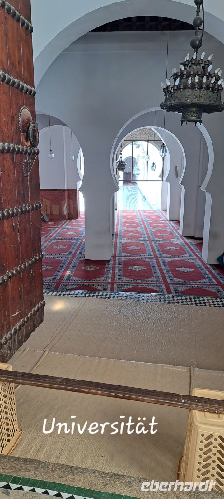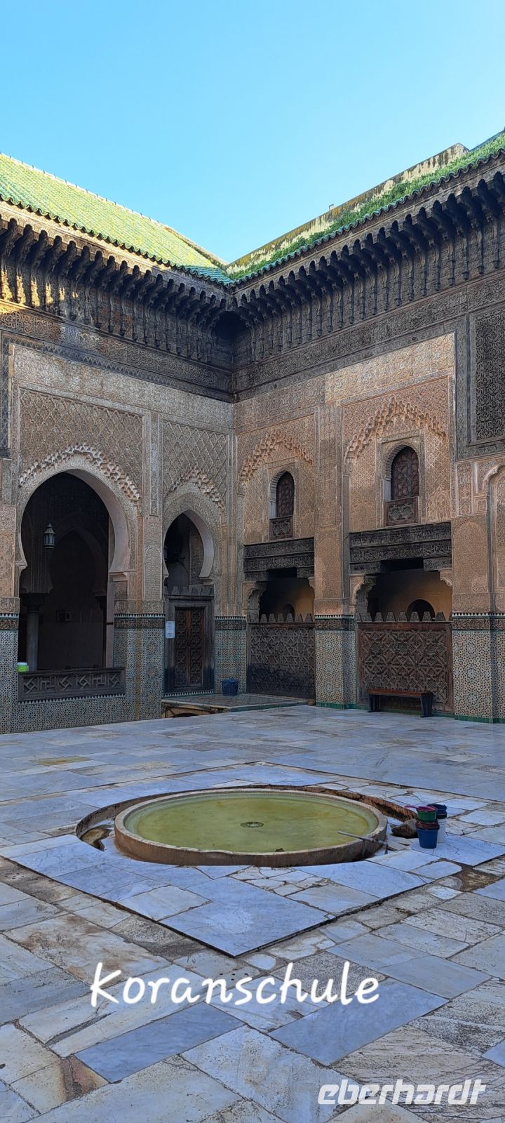 Am Nachmittag in Fés angekommen besichtigen wir in der Medina noch kurz eine Koranschule. Der zentrale Innenhof ist ein ruhiger Ort mit einem schönen Brunnen, der von Säulen umgeben ist. Wir bekommen von Mohamed die Details der Architektur erklärt. Dann fahren wir mit dem Bus zu einem Aussichtspunkt oberhalb von Fes. Hier haben wir eine tolle Aussicht auf die Medina von Fes mit ihrem Labyrinth von kleinen Gassen. Wir werden sie am nächsten Tag besuchen und stauen über die riesigen Ausmaße, noch viel größer und unübersichtlicher als in Marrakech.
