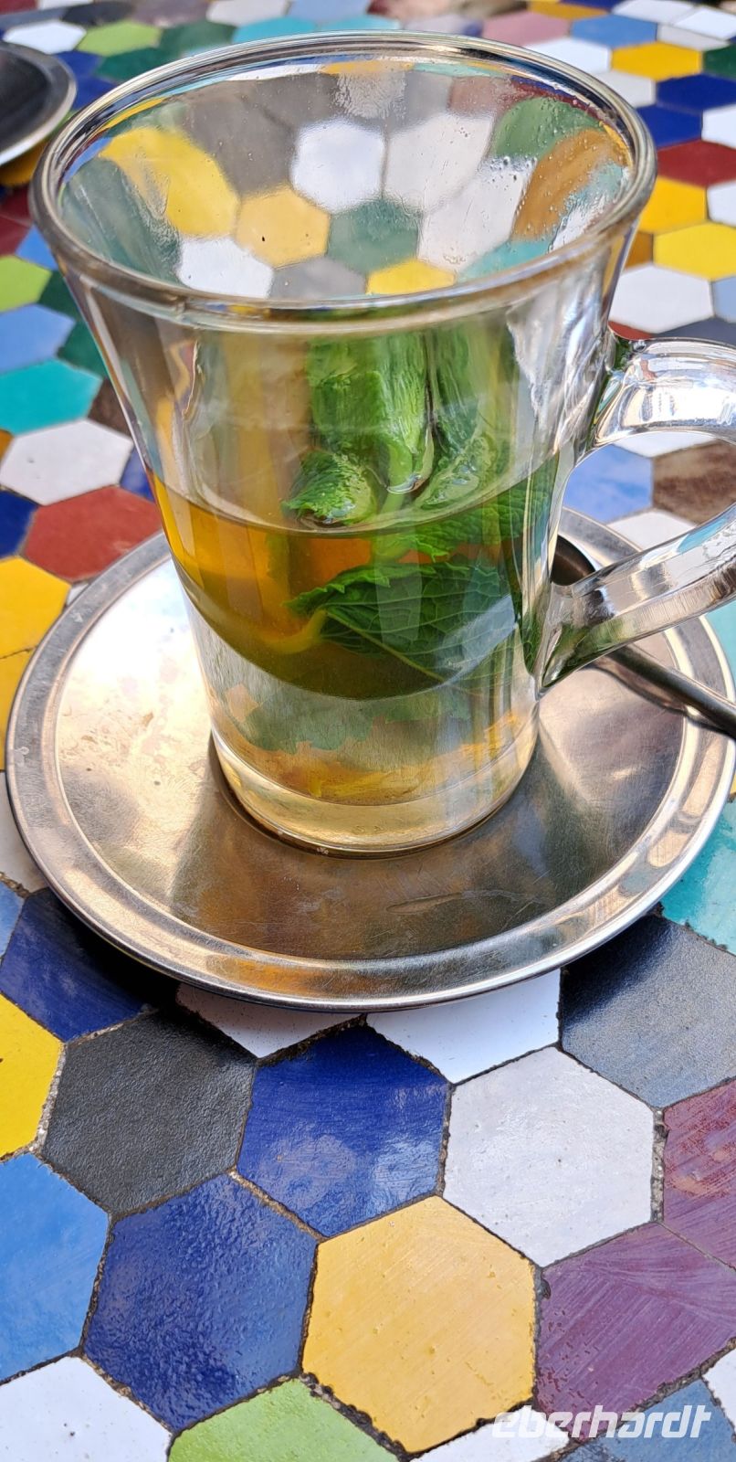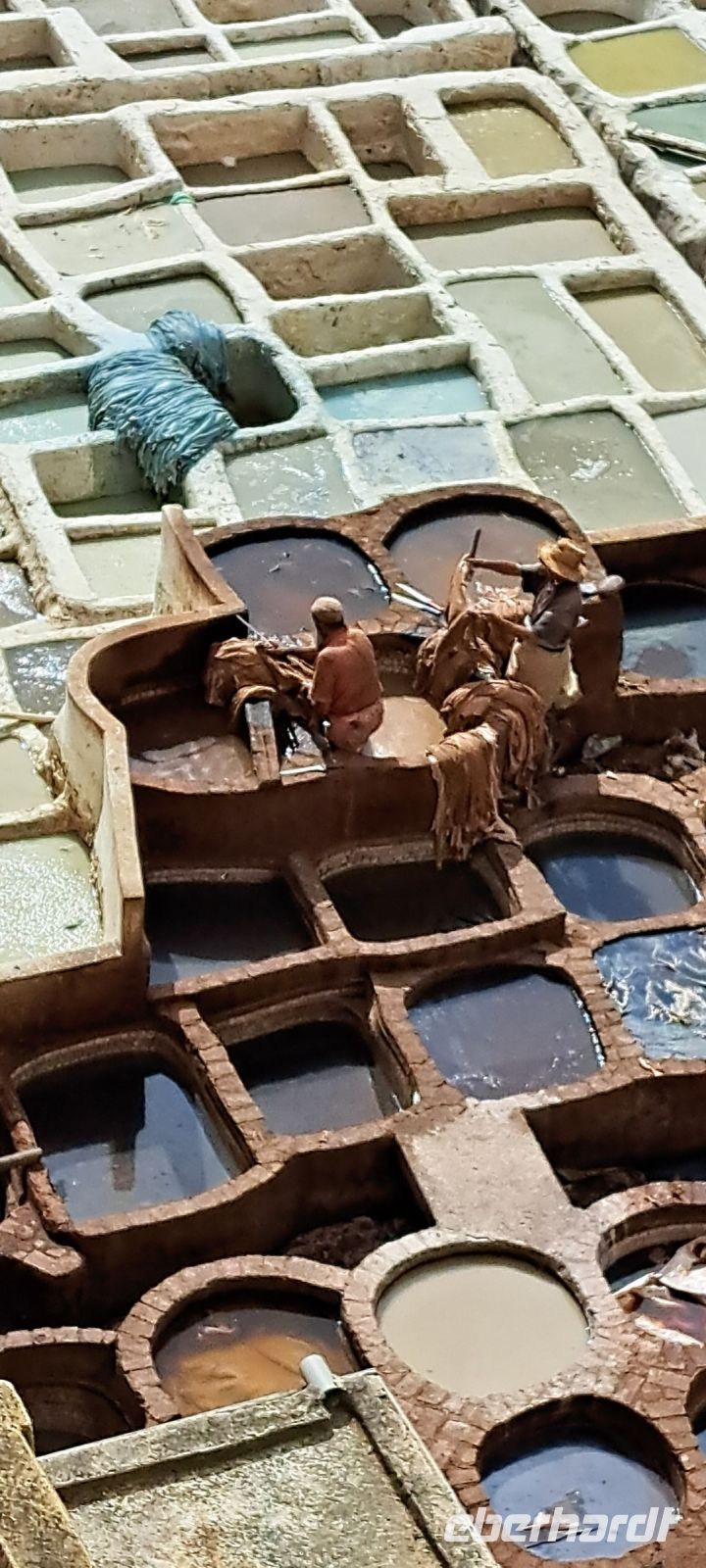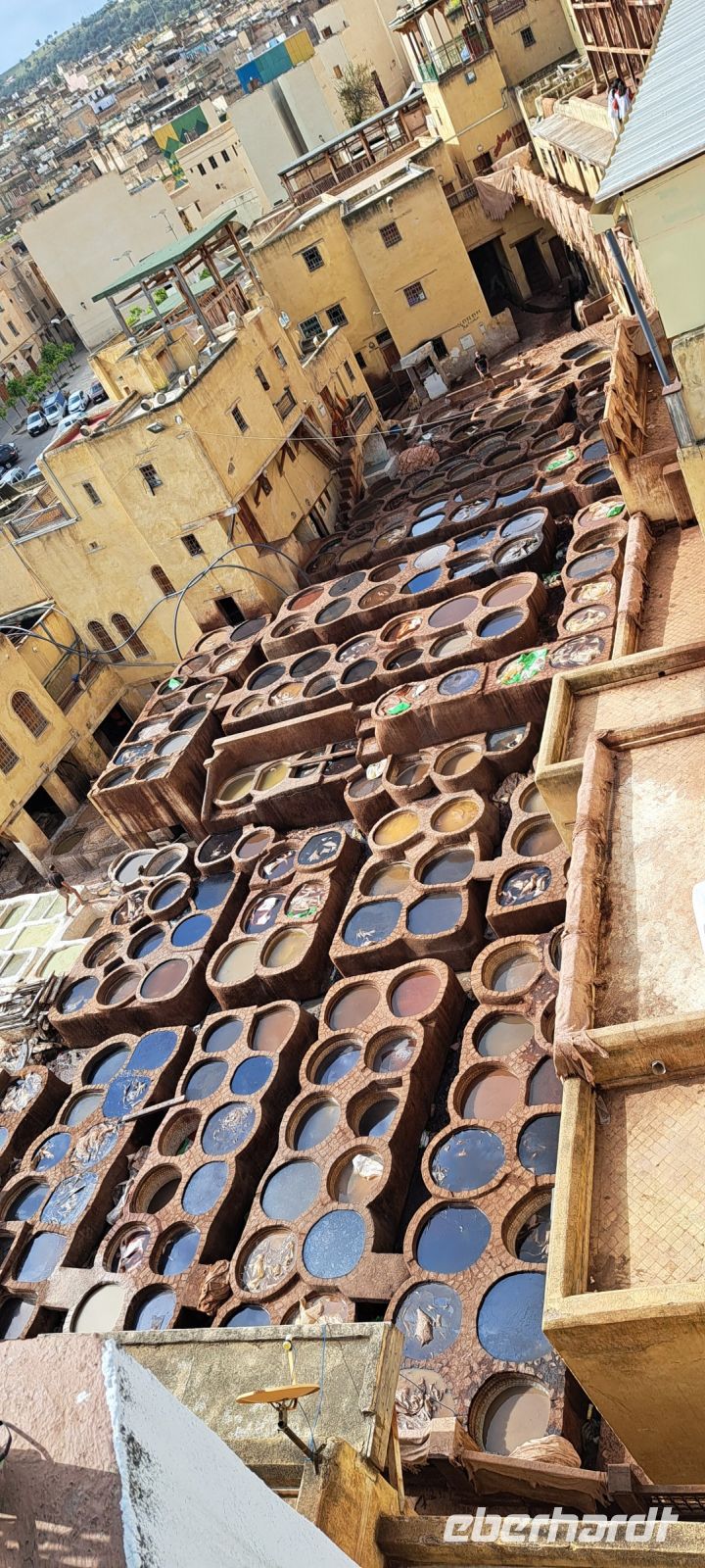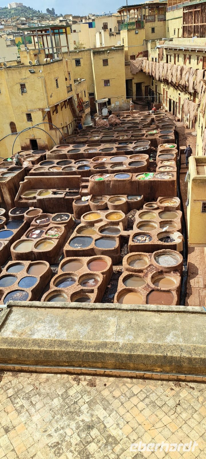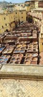 Wir starten unseren Rundgang durch die Medina von Fés ( Unesco Weltkulturerbe). Mohamed hat noch einen Helfer organisiert. Mohamed geht voran, ich laufe am Ende von der Gruppe und unser Helfer flitzt hin und her damit sich keiner von uns verläuft oder einen Abzweig verpasst. Anfänglich finden wir es etwas übertrieben, doch dann sind wir ganz froh, dass wir ihn haben. Es ist ein einziges Labyrinth, das Herzstück von Fés wahrscheinlich das verwinkelste Labyrinth das wir je erlebt haben. Manche Menschen kommen monatelang nicht aus der Medina heraus, sie leben hier. Man ist sich nicht sicher ob man es mag. Wir sind fasziniert, dann wieder angewidert, mal begeistert mal entsetzt. Gerüche, Geschmäcker, Geräusche-hier bleibt wohl niemand von einer Überforderung der Sinne verschont. Es gibt unzählige Geschäfte, Handwerker Lebensmittel (ganze Tierkörper) und die Gässchen sind so eng, dass zwei Personen kaum aneinander vorbei kommen .Irgendwann erreichen wir die Chouara- Gerberei die sich mitten in der Medina befindet. Eine der ältesten Gerbereien der Welt, 1132 gegründet. Wir bekommen am Eingang ein Stängelchen Minze um den intensiven Geruch zu neutralisieren. So schlimm finden wir den Geruch dann aber doch nicht. Von einer Terrasse oberhalb der Gerberei können wir das Treiben quasi aus der Vogelperspektive beobachten. 40 Tage dauert es bis ein Fell (Rind, Ziege, Dromedar) fertig gegerbt ist. Die Felle liegen in großen runden steinernen Bottichen, gefüllt mit leuchtenden Farben: Gelb Safran, Rot Mohn, Blau Indigo Braun Henna, Weiß Kalk. Bevor die Felle jedoch gefärbt werden liegen sie in einer "Naturkombination" aus Taubenkot, Tierurin, und Kalk. Die Gerber arbeiten barfuß tauchen die Felle ein, wringen sie wieder aus und färben sie. Es ist eine extrem körperlich anstrengende Arbeit und vieles läuft dabei noch ab wie im Mittelalter. Wir werden Zeuge echter jahrhundertealter Handwerkskunst, es scheint wie ein lebendiges Museum. Trotz Tourismus ist das Ganze kaum modernisiert was es eben auch so besonders macht. Wir bekommen das alles exklusiv von einem Mitarbeiter der Gerberei auf deutsch erklärt. Anschließend dürfen wir die fertigen Lederprodukte bewundern. Es gibt Jacken ,Taschen, Lederbörsen und vieles mehr. Einige erwerben nach hartem handeln ein gutes Stück aus Leder, ein schönes Andenken an die unvergessliche Medina in Fés. Irgendwo, nahe dem Ausgang haben wir noch Zeit für einen Tee, bevor es wieder zum Bus geht.
