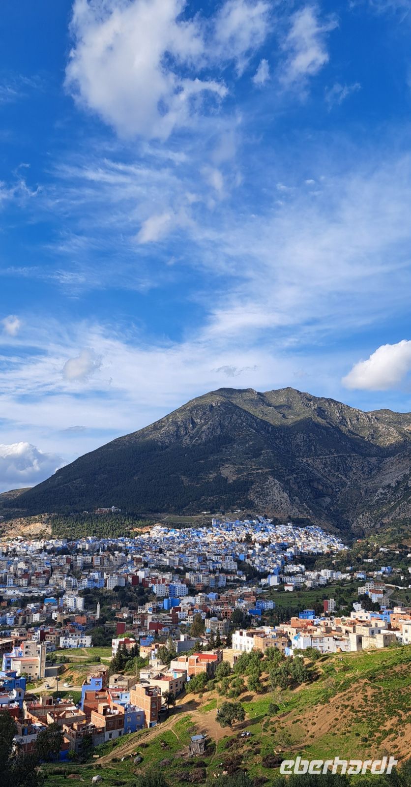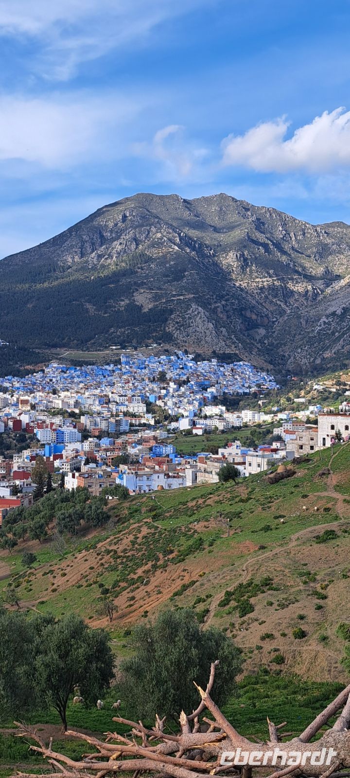 Wir fahren nun in Richtung Tanger, die Straße ist nicht besonders gut, aber die Landschaft entlang des Riff Gebirges sehr sehenswert. Unterwegs machen wir eine Mittagspause im Motel Riff. Ein kurzer Stop an einem Stausee, wo uns ein kleiner Junge mit seinem Esel Kunststücke vorführt. Gerne hätten wir ihm etwas gegeben, aber Mohamed hat uns dringlich gebeten, Kindern kein Geld zu geben. Der Junge machte auch keine Anstalten zu betteln und eine Tüte Gummibärchen die ich noch im Rucksack hatte haben ihn erfreut. Nächster Fotostop die blaue Stadt Chefchaouen, sie zeigt sich malerisch mit ihren blau angestrichenen Häusern. Die Sonne steht schon tiefer und sie gibt ein tolles Fotomotiv ab. Erst bei Einbruch der Dunkelheit kommen wir im Hotel Marina Bay in Tanger an. Wir bedanken uns herzlich bei unserem zuverlässigen Busfahrer Hussein, dem charmanten Helfer Hamid und natürlich ganz besonders bei Mohamed der uns sein Heimatland Marokko so intensiv und informativ nahegebracht hat.