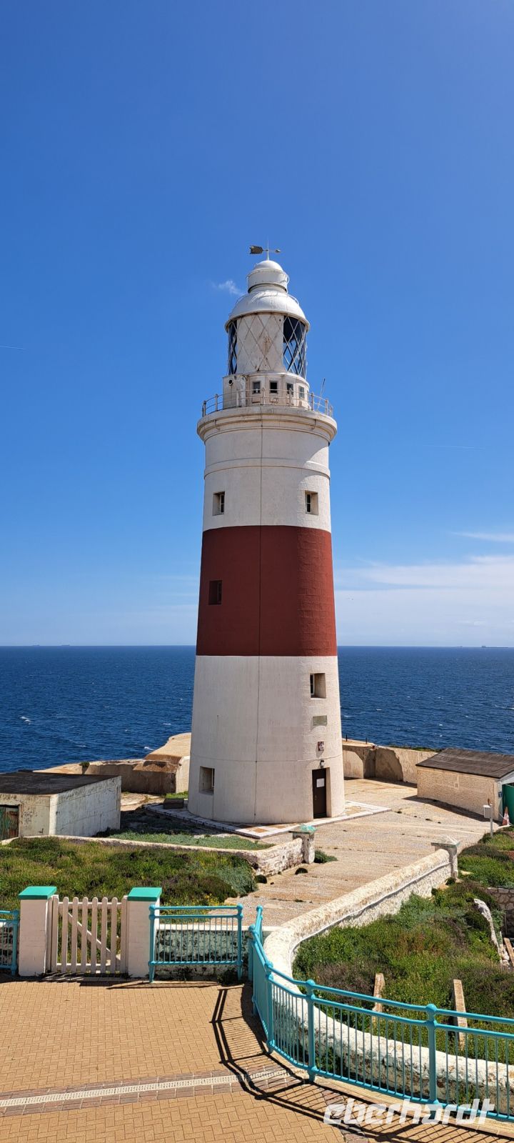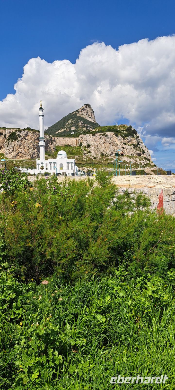 Auf uns wartet auf der anderen Seite der Grenze ein Kleinbus mit einem lustigen englischen Fahrer der uns Gibraltar zeigt. Ein paar Sätze über die jeweiligen Sehenswürdigkeiten kommen von ihm auf englisch in deutsch vom Band. Wir fahren enge Serpentinen bis zum Europa Point am Südende von der Halbinsel. Von hier aus hat man einen weiten Blick über das Meer. Vis a vis sehen wir auch eine maurische Moschee, im Kern das älteste Gebäude, das allerdings mehrfach seinen Nutzungszweck änderte.