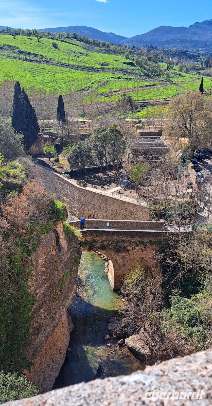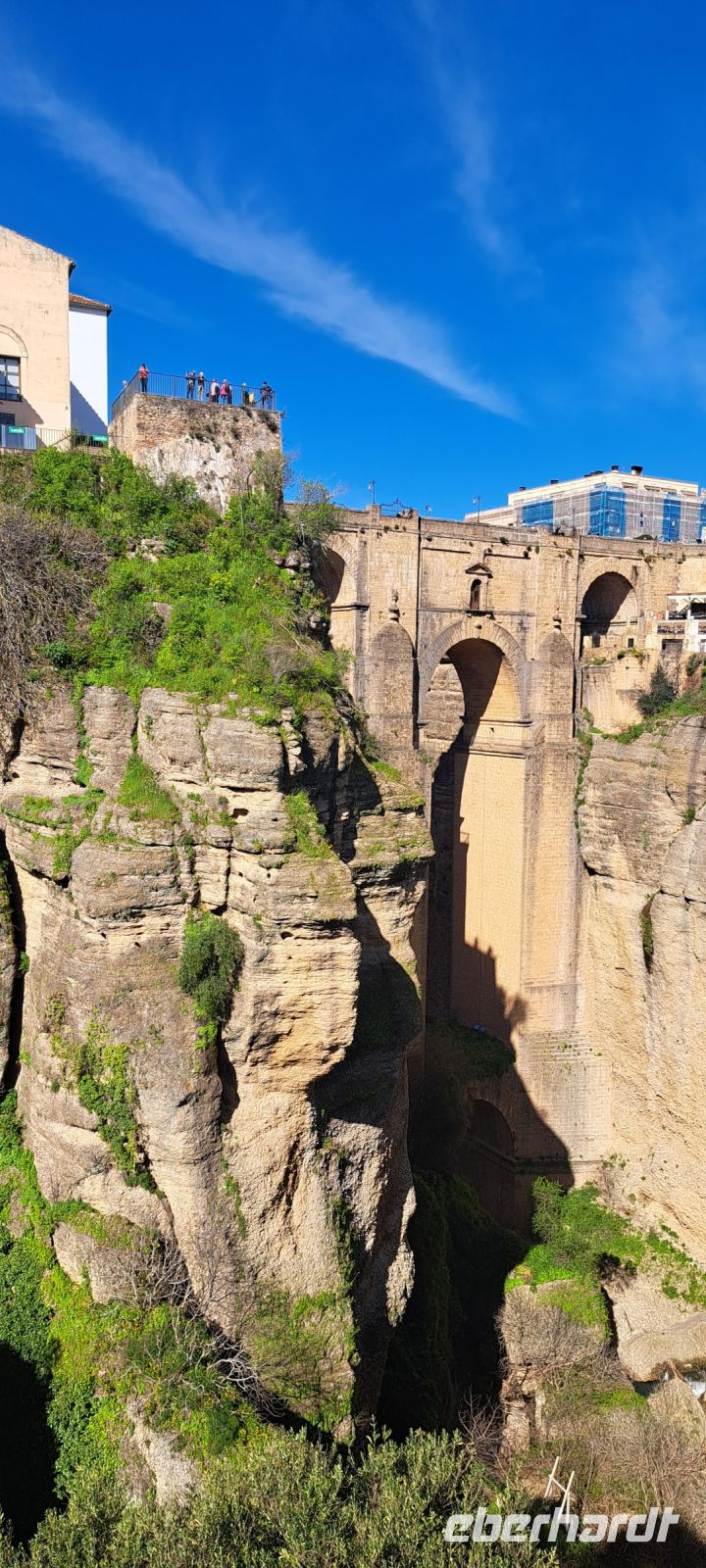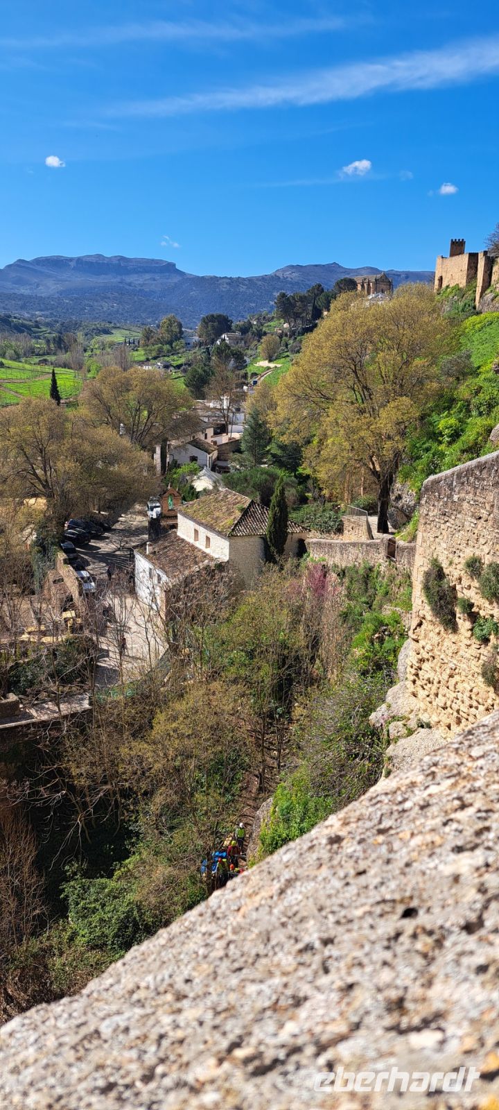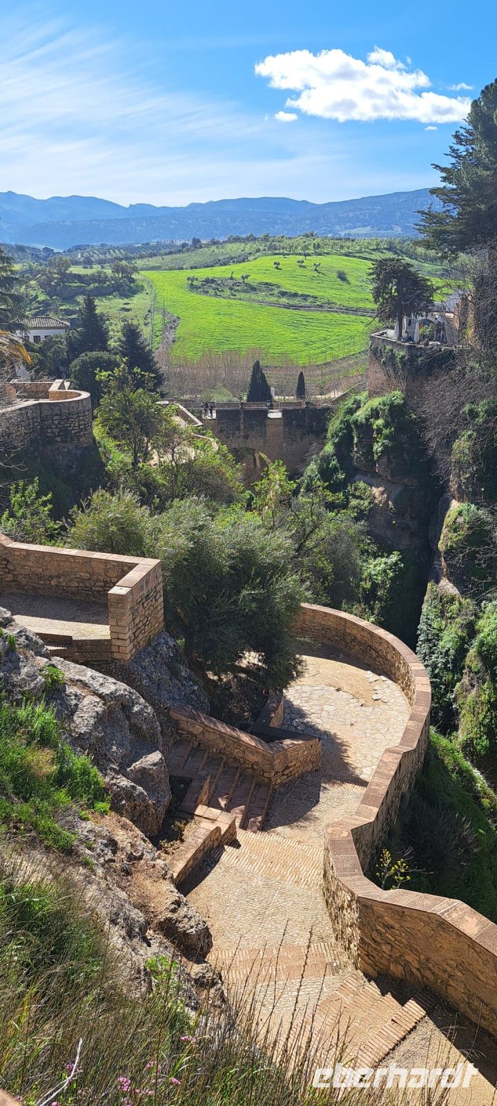 Von Estepona geht es durch eine wunderschöne grüne Frühlingslandschaft Richtung Ronda. Ronda, eine der weißen Städte Andalusiens, liegt malerisch auf einem Felsenplateau über der Schlucht El Tajo und war eine der letzten Bastionen der Mauren, bevor sie 1485 von den Christen erobert wurde. Wir marschieren mit unserem Reiseführer Daniel zunächst über die Puente Viejo (Alte Brücke von 1616) zu den arabischen Bäder hinab. Sie stammen aus der maurischen Zeit und sind ein faszinierendes Beispiel für die islamische Architektur. Sie befinden sich in der Nähe der Altstadt und bieten einen Einblick in die Badegewohnheiten der Mauren. Die gut erhaltenen Ruinen zeigen die beeindruckende Ingenieurskunst und die kulturellen Einflüsse der damaligen Zeit. Der Weg wieder hoch ist allerdings recht anstrengend aber wir werden mit dem Blick erst auf und dann von der Neuen Brücke herunter zu schauen belohnt. Der Bau der Brücke begann 1751 und dauerte fast 40 Jahre. Im zentralen Bogen der Brücke befindet sich ein Raum, der ursprünglich als Gefängnis diente. Während des spanische Bürgerkriegs(1936-1939) vermutlich auch als Folterkammer genutzt. Heute beherbergt der Raum ein kleines Museum. Die Brücke verbindet die Altstadt mit dem neueren Stadtteil El Mercadillo.