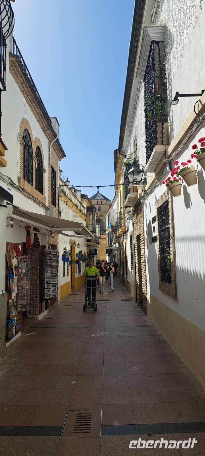 Wir treffen Ines unsere Reiseführerin und gemeinsam spazieren wir erstmal durch die Juderia, der ehemalige jüdische Stadtteil. Hier befindet sich die Synagoge von Córdoba, die im 14. Jahrhundert erbaut wurde und ein wichtiges Beispiel für die jüdische Architektur in Spanien ist. Das Viertel ist auch für seine charmanten Plätze und traditionellen Häuser bekannt. Wieder ein tolles Fotomotiv gibt es in der Blumenstraße mit einem Turm im Hintergrund.