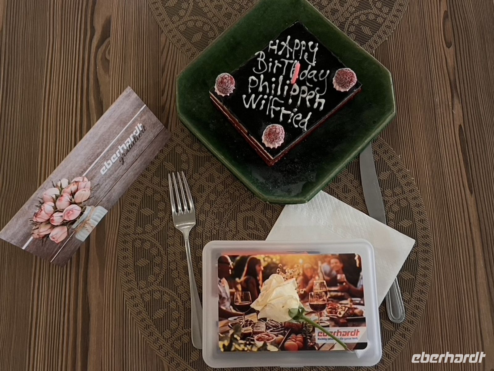 Unser heutiges Geburtstagskind Sylvia, Liddy, Anna :-) wird ebenso überrascht mit einem Geburtstagsteller des Hotels und einem ET Präsent und Karte.