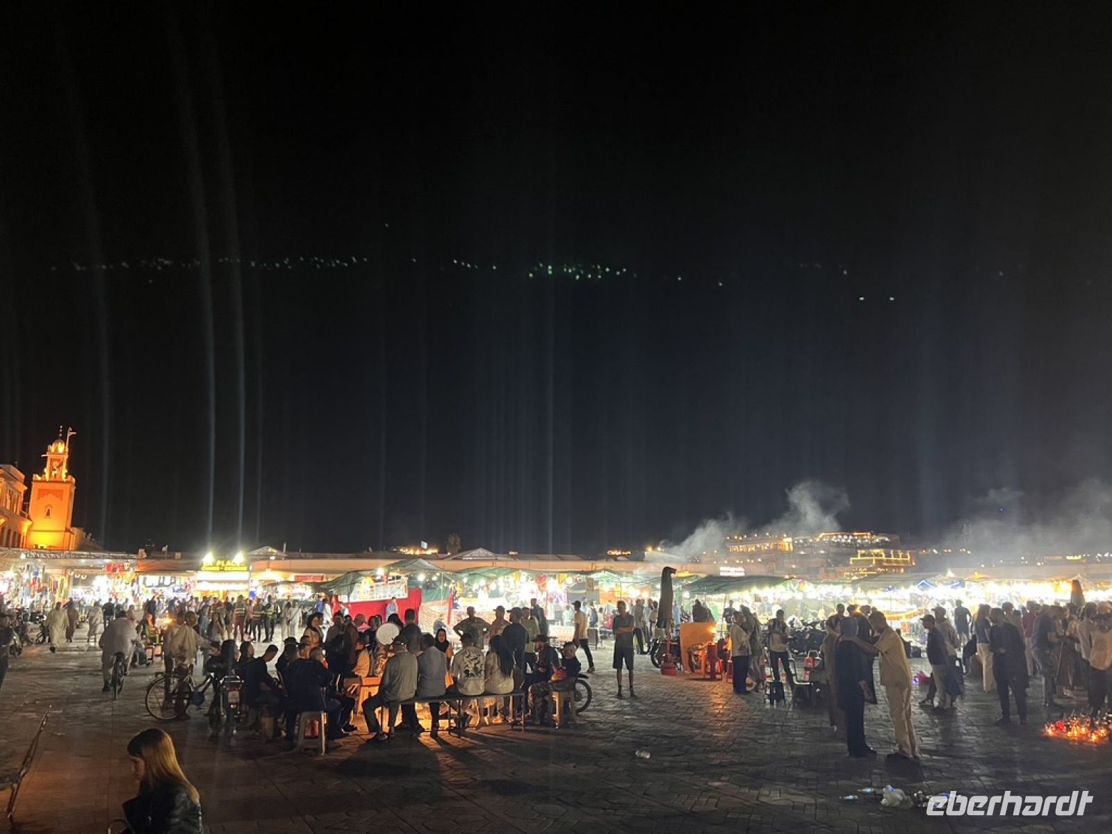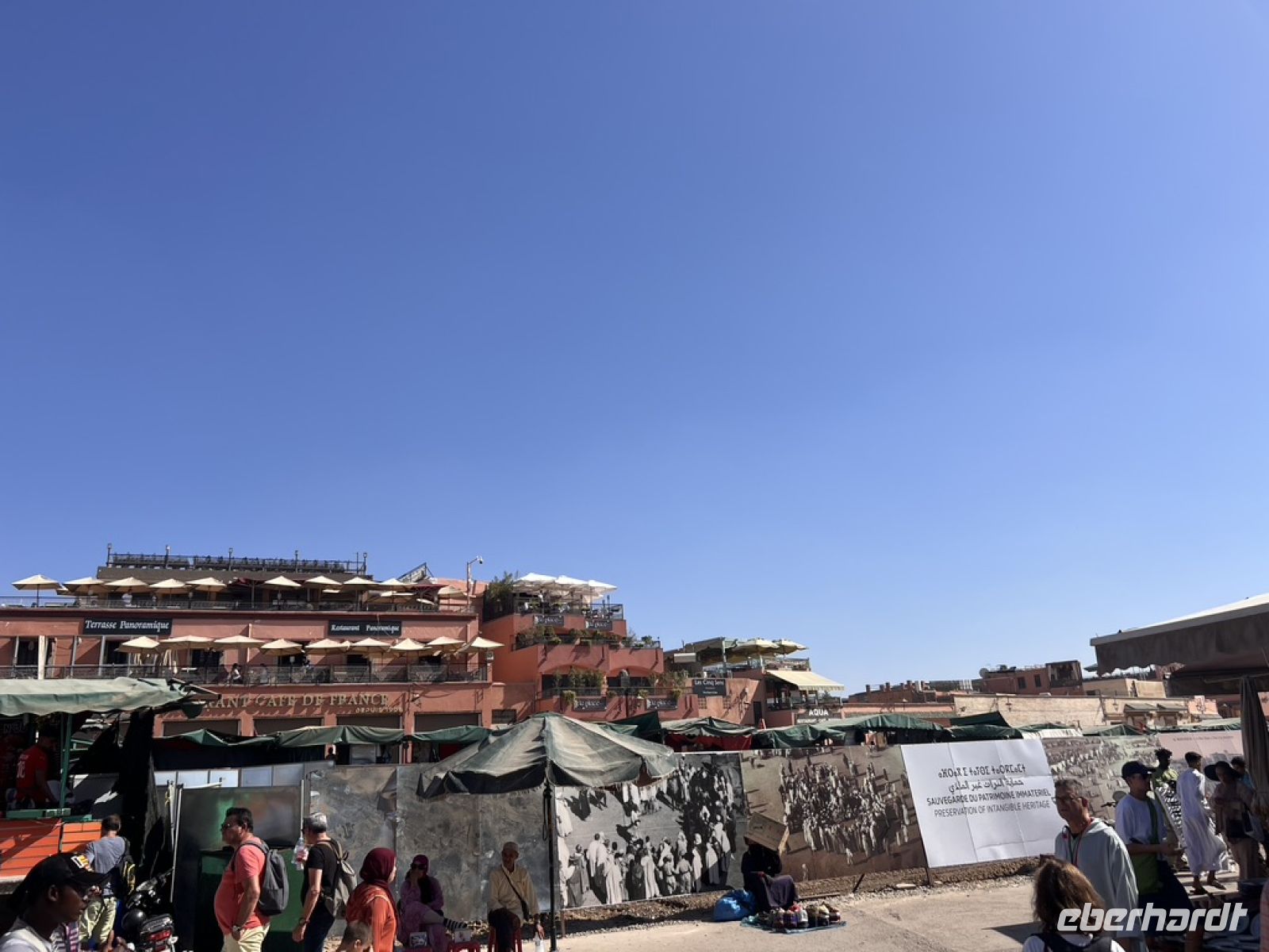 Der erste Spaziergang durch den Park an der Koutoubia-Moschee, wechseln Euros in Dirham, bis hin zum Djemaa el-Fna, wo wir im Café Argana unser erstes orientalisches Getränk probierten, war bereits ein Highlight – obwohl der berühmte Platz zur Baustelle geworden war.
