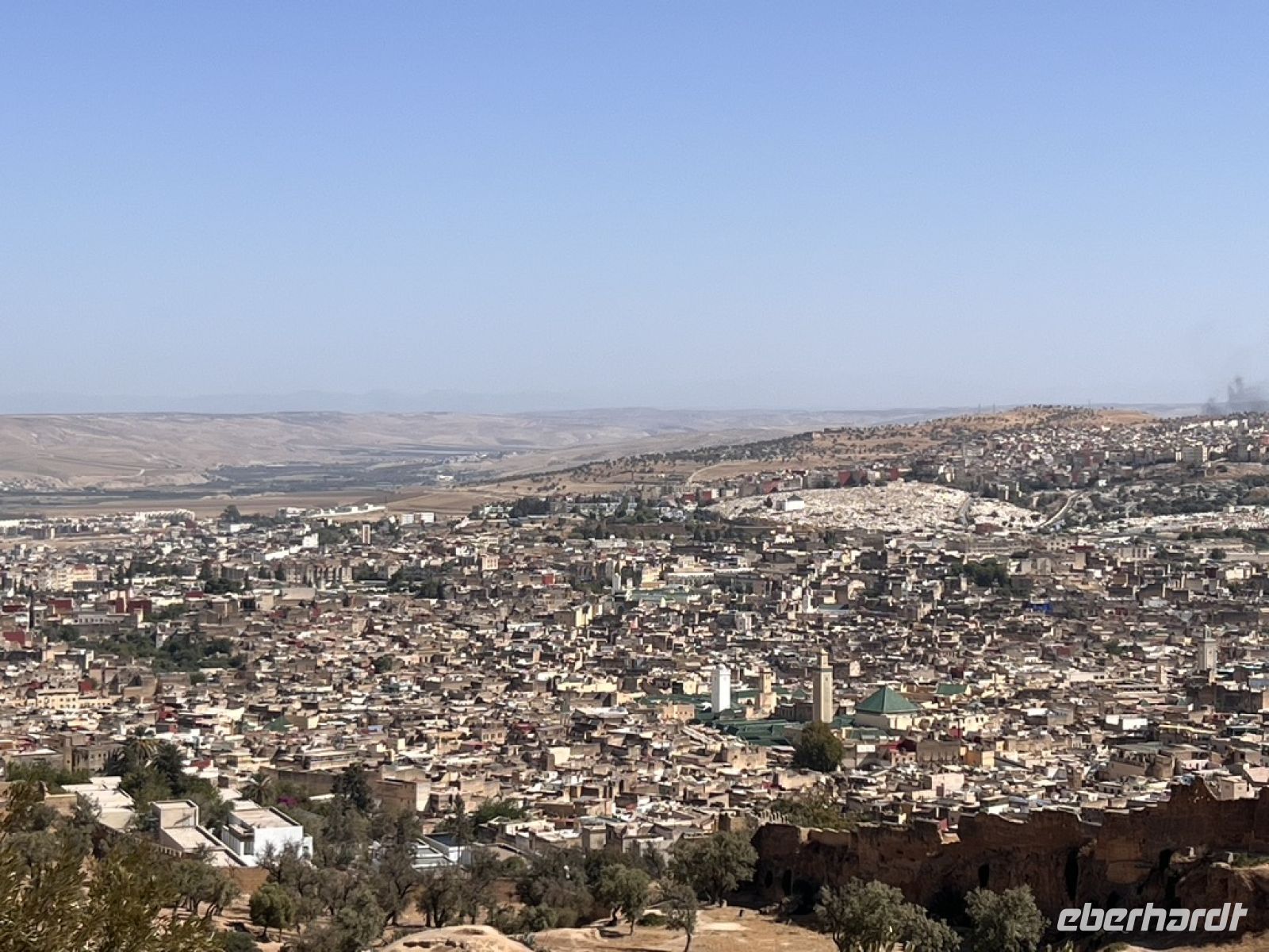 Zuvor tauchten wir kurz in Meknes, in die von riesigen Mauern umspannte Stadt ein, besuchten die Grabmoschee, schlenderten durch die Medina und Markthalle wo ich Nascherei süss und salzig besorgte, bevor wir einen Mittagsstopp auf dem Platz einlegten. Dann ging es vorbei am schönen Stausee mit Kostprobe von Granatapfelsaft, nach Fes - in die älteste Königstadt des Landes.