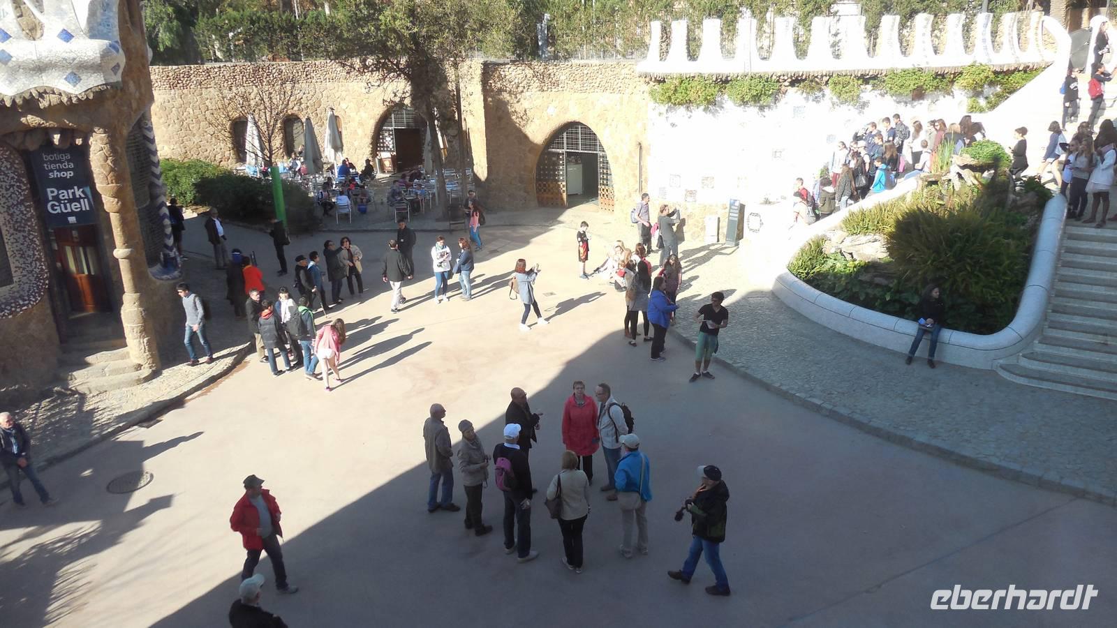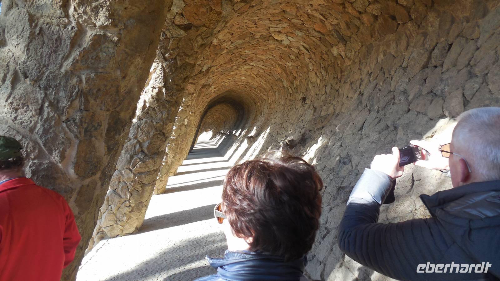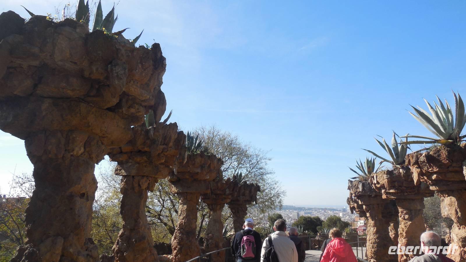 Wir beginnen die Rundfahrt entlang der Vila Gracia in Richtung Parc Güell. Bei einer Besichtigung durch den schönen Garten lernen wir die Ideologie von Gaudi kennen, wie er stets zwischen Kunst, Natur und Religion die Harmonie sucht. Ein perfektes Beispiel gibt eben dieser Park: Regenwasser fließt von oben hinab und wird durch Leitungen durch die Drachenmünder wieder ausgespeist und verschafft somit eine Art Springbrunnen ohne Motorik. Er arbeitet auch mit vielen Natursteinen und Keramikscherben, beispielsweise auf der 110 Meter langen bunten Keramikbank. Anschließend bewundern wir die verschiedensten Kakteenarten und einen fantastischen Ausblick über den Hafen von Barcelona im Kakteengarten.