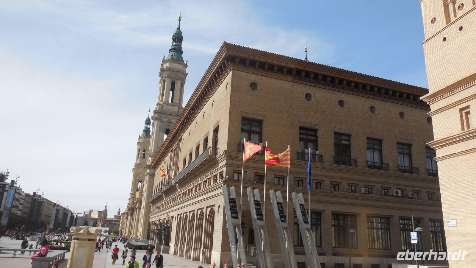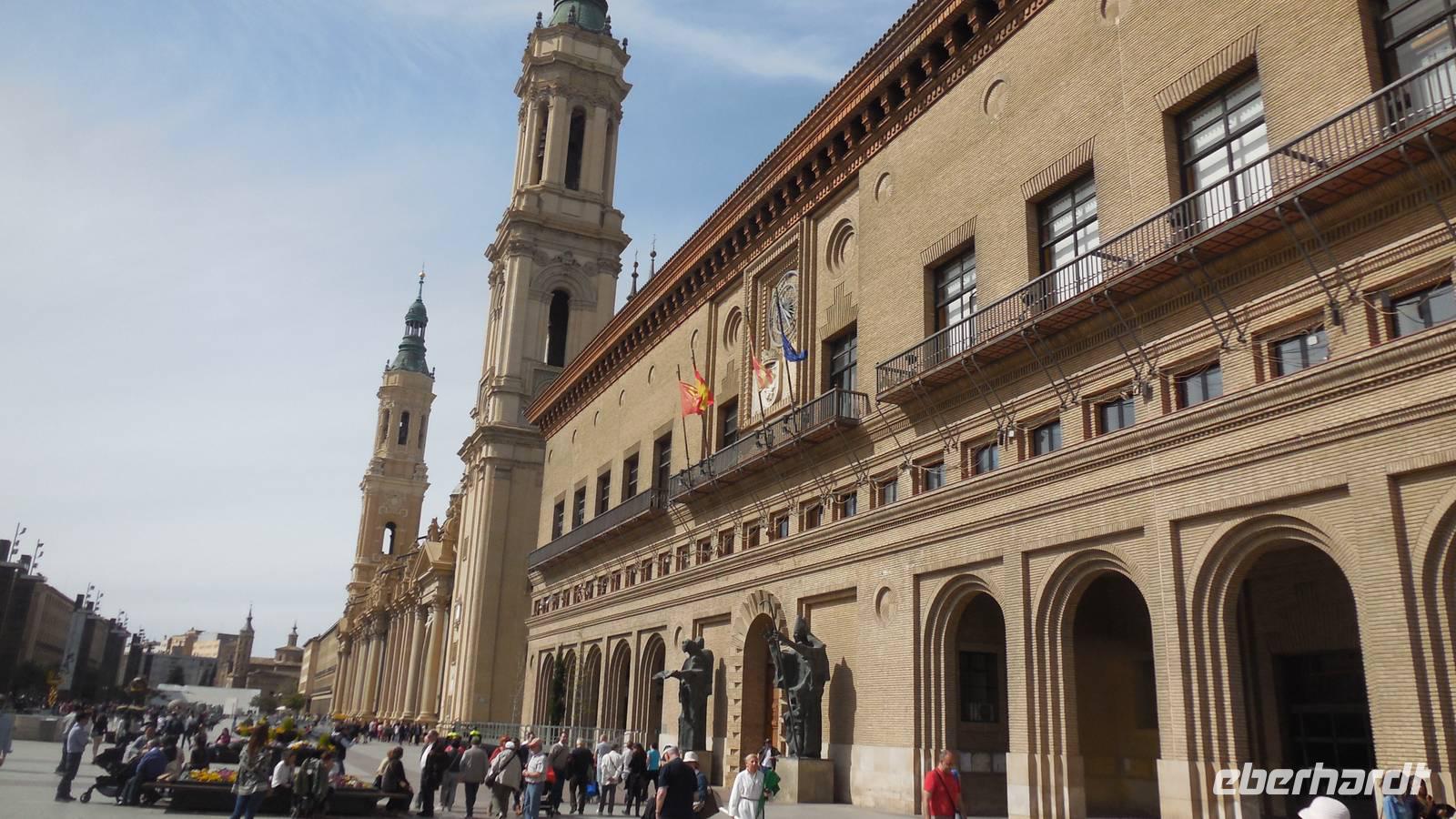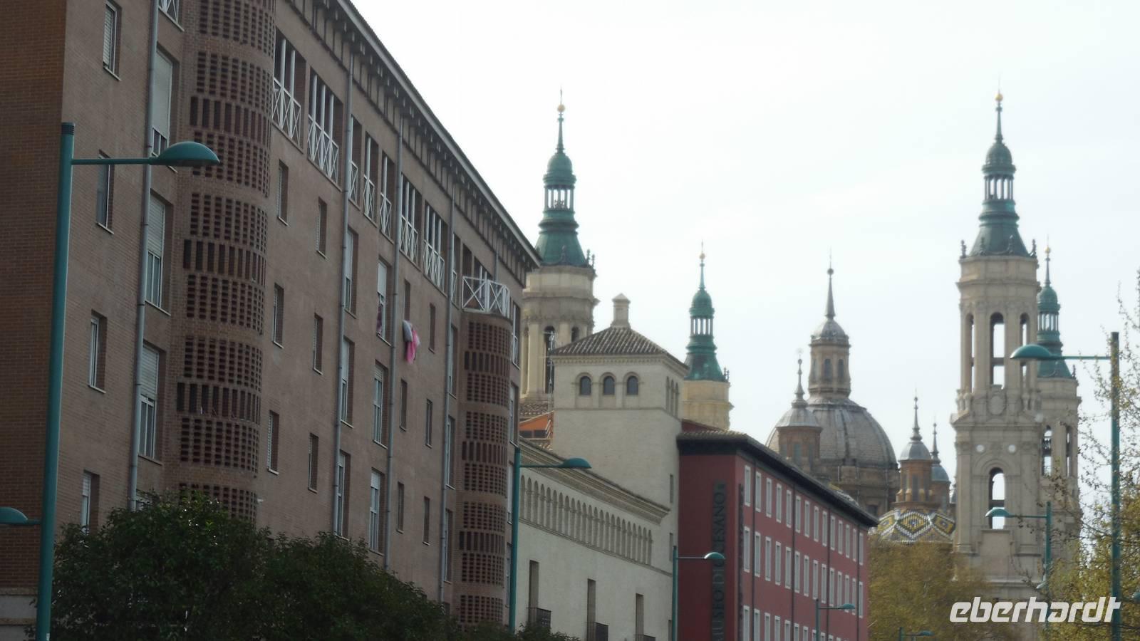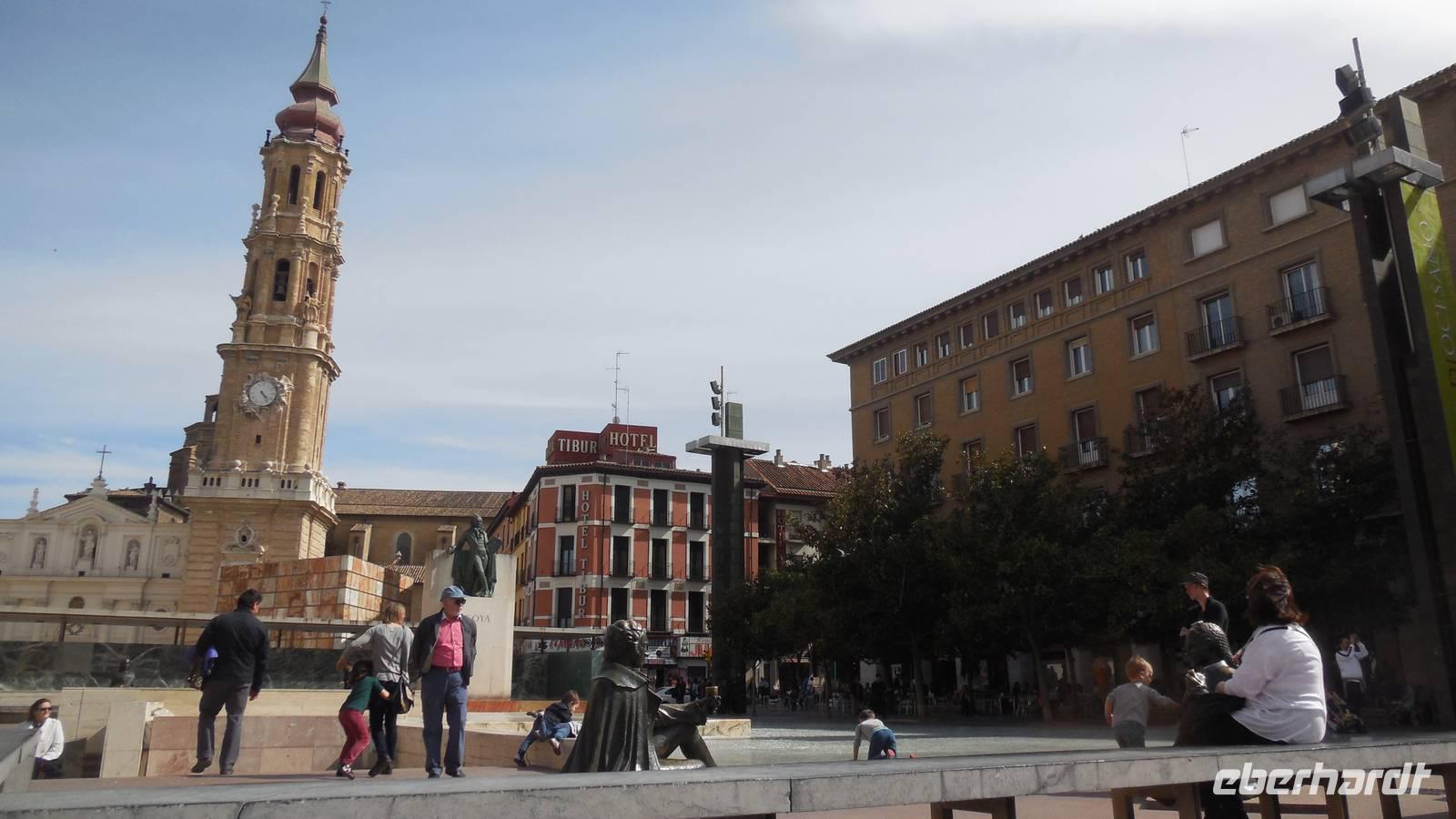 Entlang der El Coso-Straße laufen wir bis zum ältesten Gebaüde der Stadt, dem Römischen Theater. Dieser wurde zufällig neben den Neuen Theater gefunden, als man mit den Bauarbeiten begann. Eine weitere Besonderheit von Zaragoza ist die La Seo-Kirche, die eine Mischung aus verschiedensten Kunstrichtungen vereint. Auf diesem Platz liegt auch ein Monument von Goya und zwei Majas mit zwei Majos. Ebenfalls zu finden sind das Rathaus und die bekannte El Pilar-Basilika, die Patronin der Hispanischen. Interessant ist auch die Geschichte über die Bombardierung im Bürgerkrieg. Die drei abgeworfenen Fliegerbomben sind nicht explodiert. Eine davon schlug ein paar Meter vor der Wallfahrtskirche ein, eine andere durch das Dach und die dritte in der Nähe des Wandgemäldes von Goya ein. Das Volk glaubt, die Heilige Madonna hätte diese Kirche beschützt.