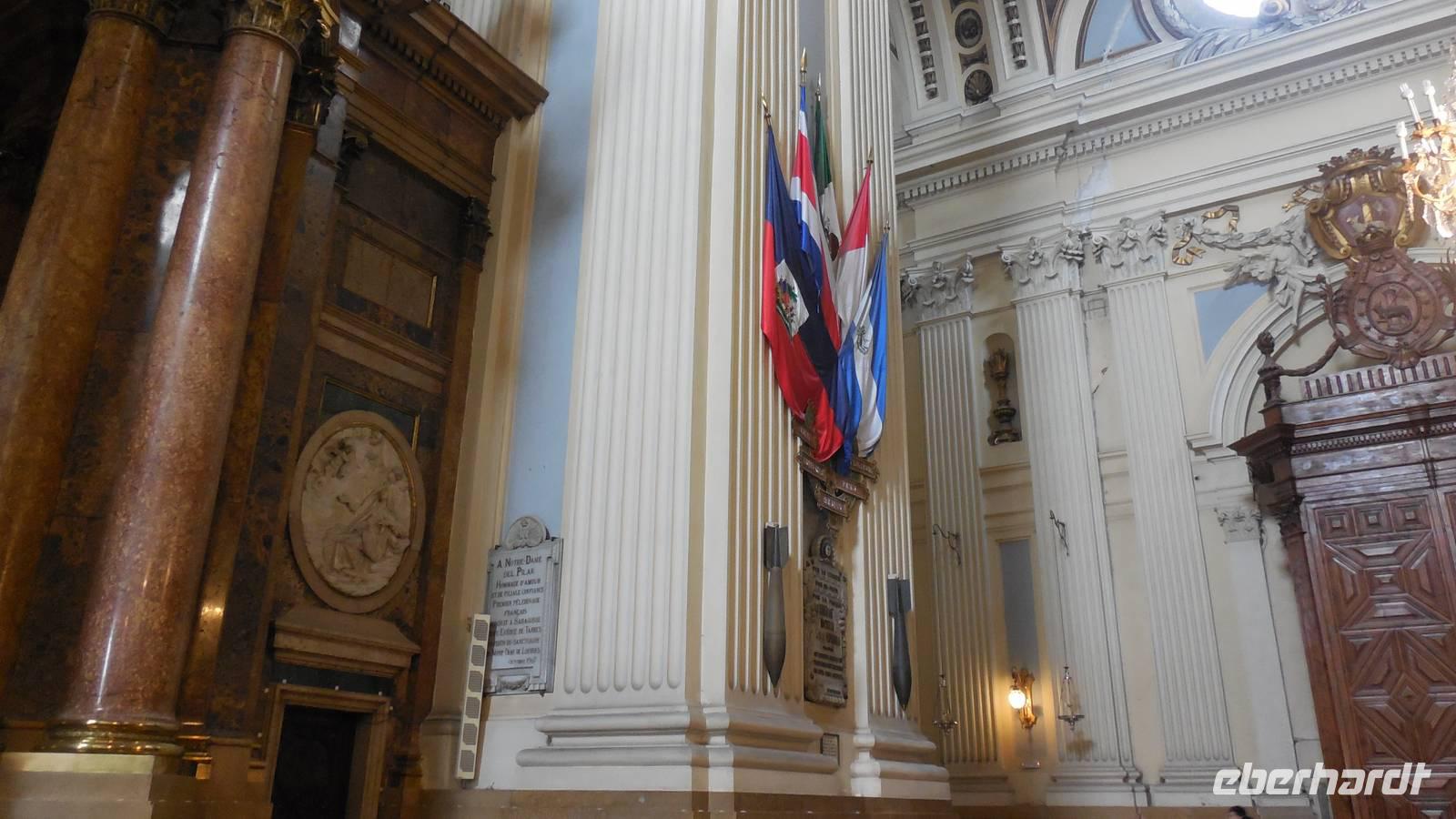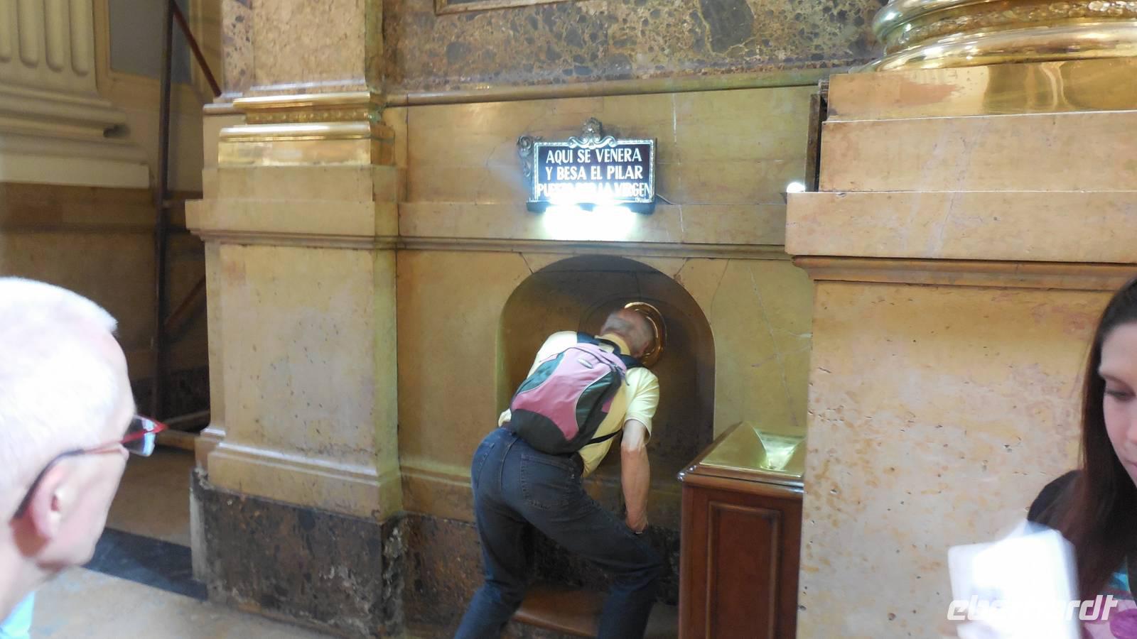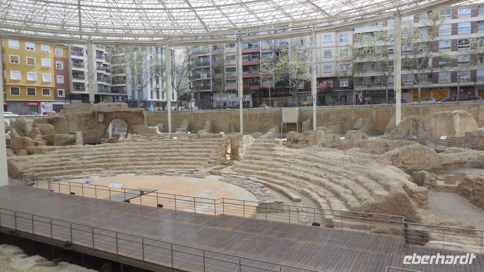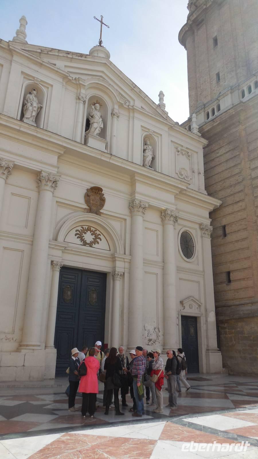 Entlang der El Coso-Straße laufen wir bis zum ältesten Gebaüde der Stadt, dem Römischen Theater. Dieser wurde zufällig neben den Neuen Theater gefunden, als man mit den Bauarbeiten begann. Eine weitere Besonderheit von Zaragoza ist die La Seo-Kirche, die eine Mischung aus verschiedensten Kunstrichtungen vereint. Auf diesem Platz liegt auch ein Monument von Goya und zwei Majas mit zwei Majos. Ebenfalls zu finden sind das Rathaus und die bekannte El Pilar-Basilika, die Patronin der Hispanischen. Interessant ist auch die Geschichte über die Bombardierung im Bürgerkrieg. Die drei abgeworfenen Fliegerbomben sind nicht explodiert. Eine davon schlug ein paar Meter vor der Wallfahrtskirche ein, eine andere durch das Dach und die dritte in der Nähe des Wandgemäldes von Goya ein. Das Volk glaubt, die Heilige Madonna hätte diese Kirche beschützt.
