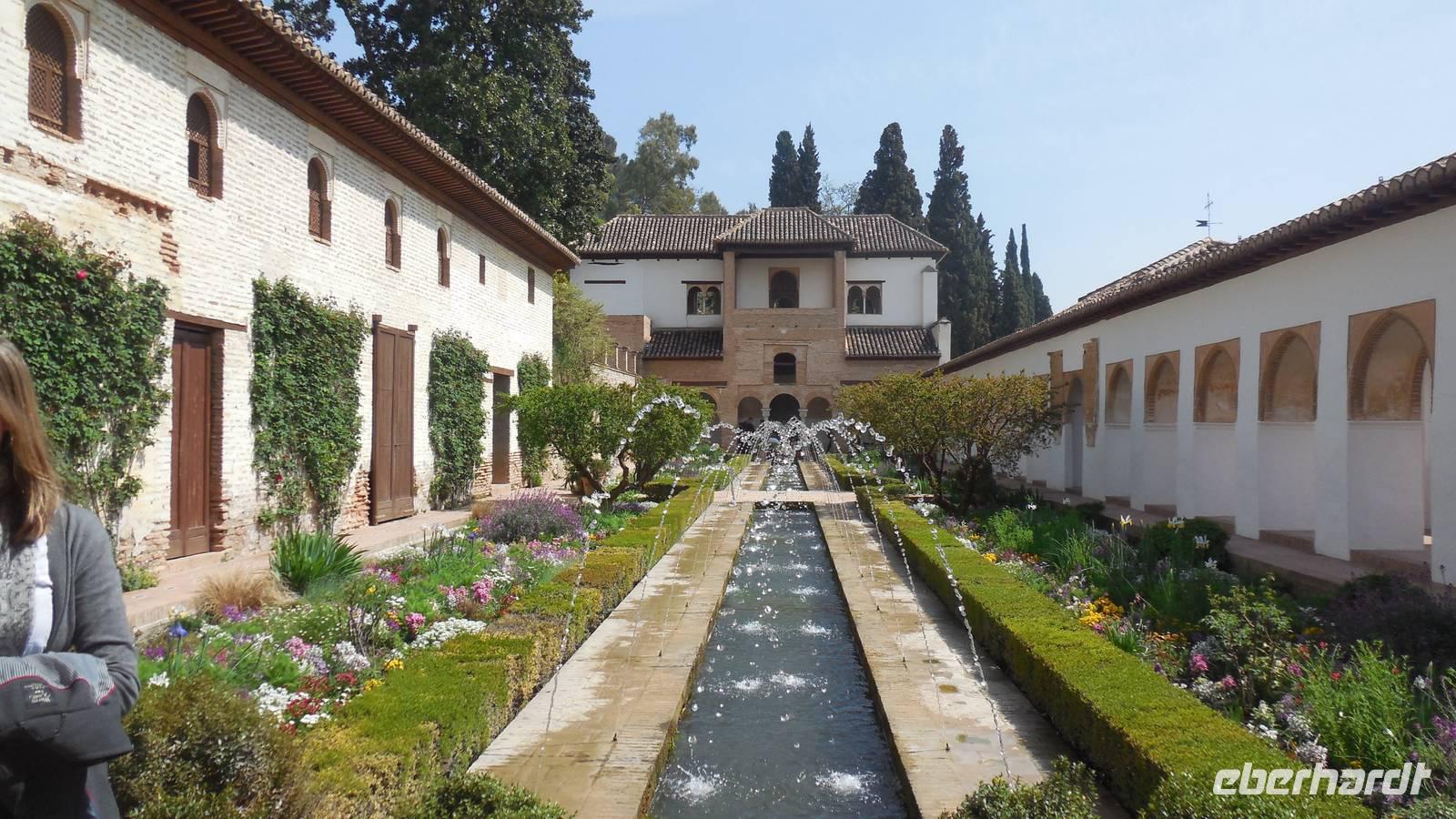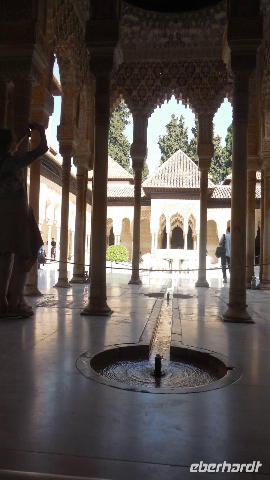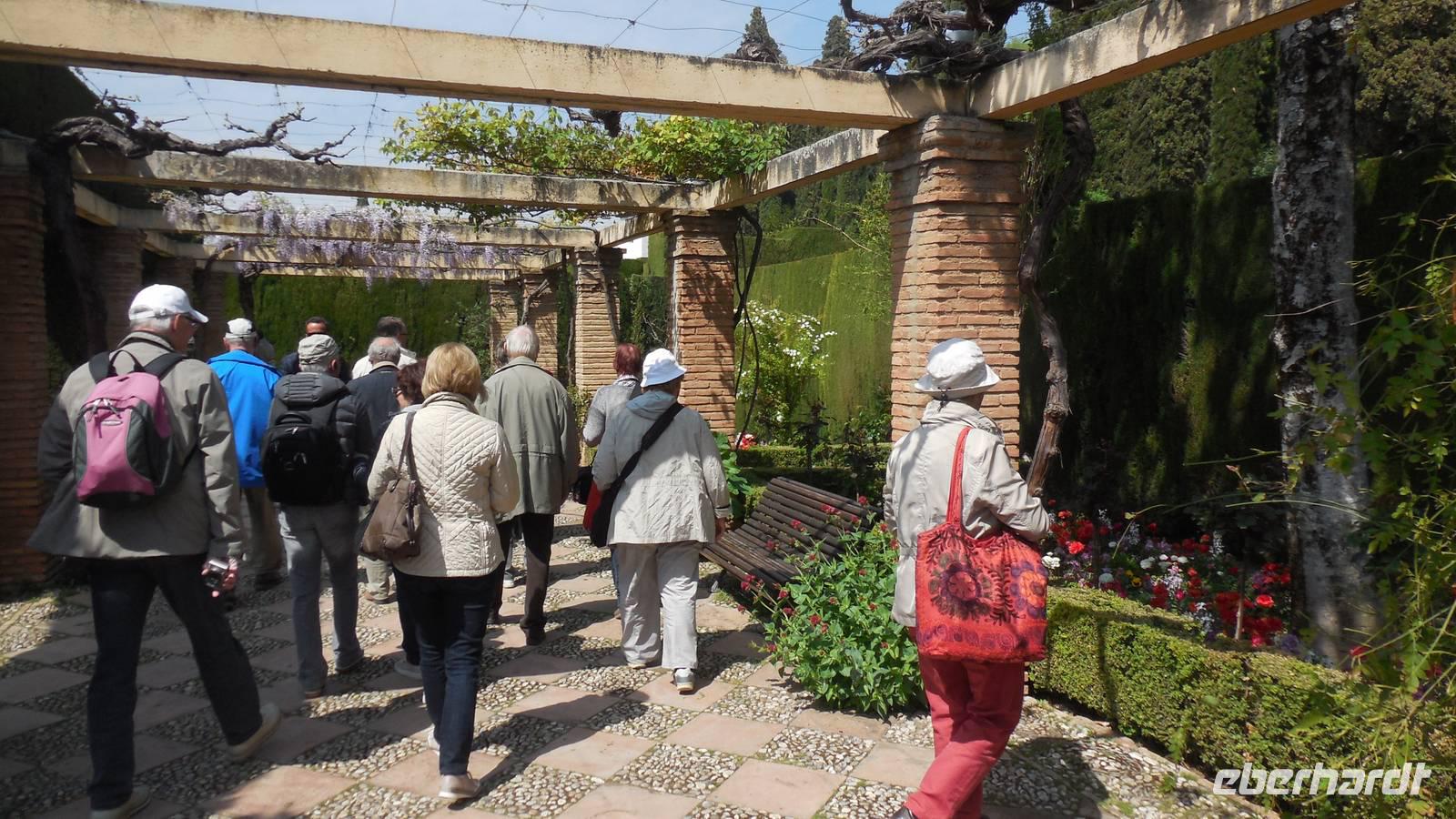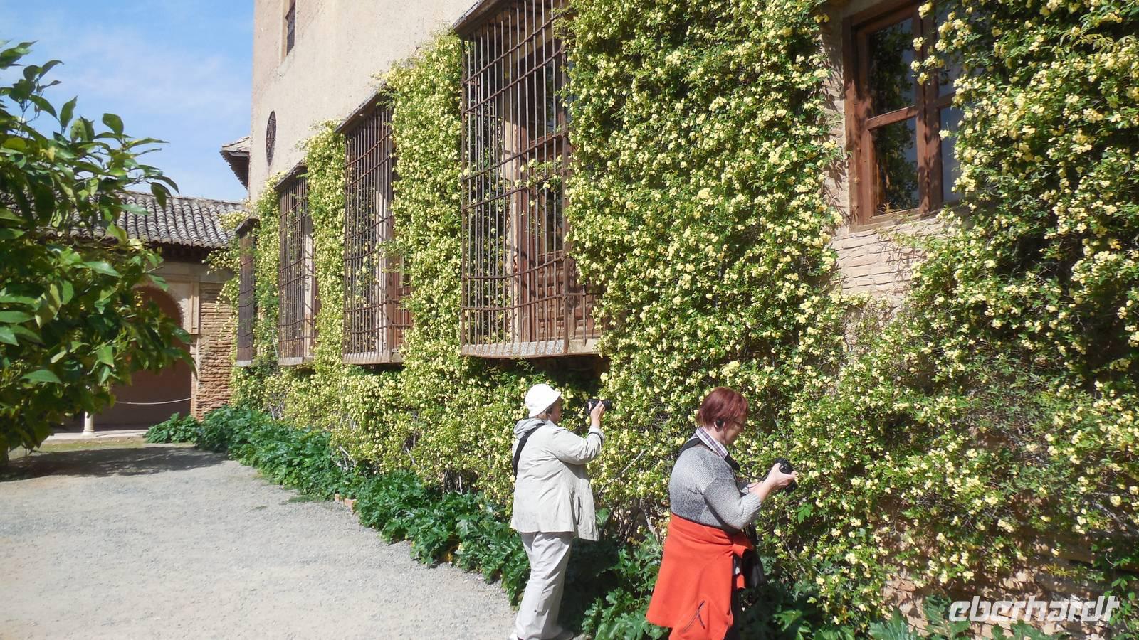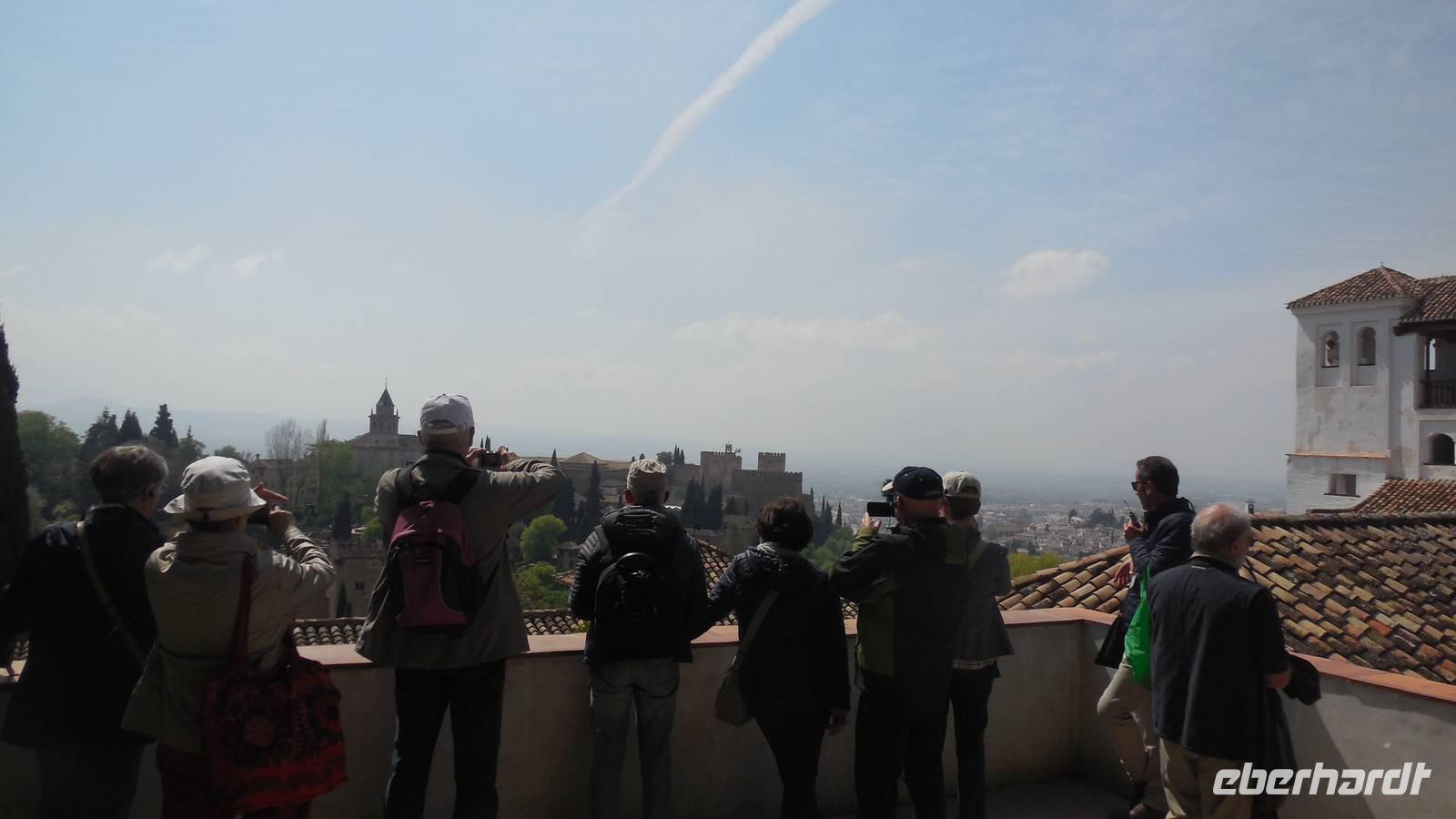 Endlich beginnt unser Besuch der Alhambra und der Generalifen. Durch die wundervollen Gärten spazieren wir zum Sommerpalast, um einen herrlichen Blick über Granada zu genießen. Wir sehen die Mauern der Alhambra, die Sedimente der ältesten Gebäude sowie ihr Abwehrsystem. In diesem Teil liegt auch der Parador San Francisco. Weiter bergab finden wir die die Santa María Kirche, ein altes arabisches Bad und den Palast von Karl V mit einer fantasischen Akkustik. Wir gehen weiter in den Nazarien-Palast. Dieser Palast zeigt die ganze Pracht und die Schönheit von diesem alten Königsreich. Jeder Raum ist besonders und unterschiedlich gestaltet. Wie sagt unser lokaler Reiseleiter Pedro gern: “in Crescendo!”, was bedeutet, dass wir jeden Tag einen schöneren Palast als der zuvor erleben werden. Lange in Erinnerung wird uns der Innenhof mit dem fantasitschen Löwenbrunnen bleiben. Dieser sehr aufwändig geschmückter Mamorbrunnen wurde im 11. Jahrhundert nach Christus gebaut. Die zwölf Löwen repräsentieren die Zwölf Stämme Israels. Man sagt, aus dem Löwenbrunnen entspringt die Quelle des Lebens, die schöpferische Kraft des Wassers. Der gesamte Hof wird von 124 Säulen umschlossen. Das arithmetische Mittel aus 124 ist die Sieben und am siebenten Tag vollendete Gott die Schöpfung der Welt - das ist die Symbolik.