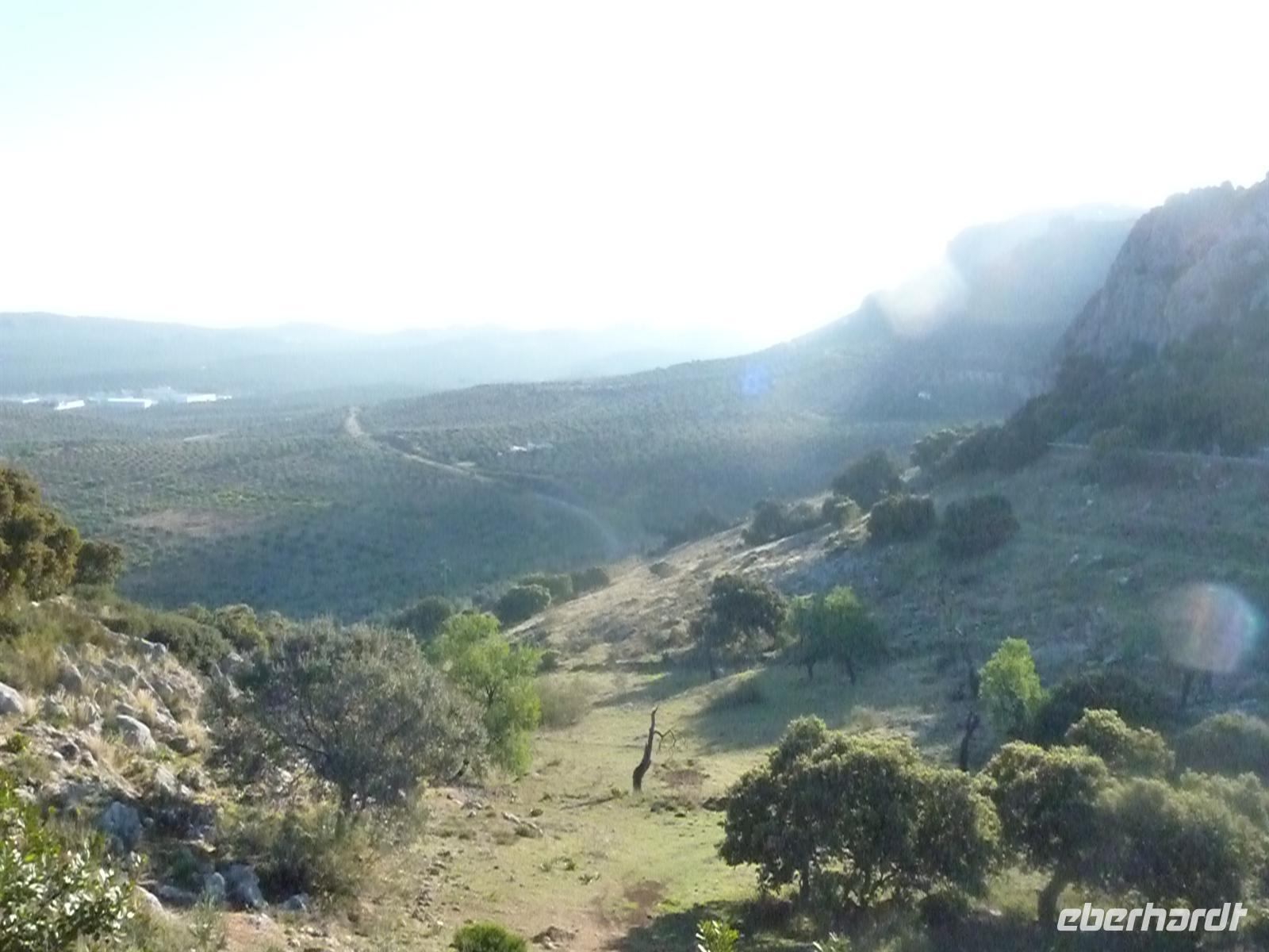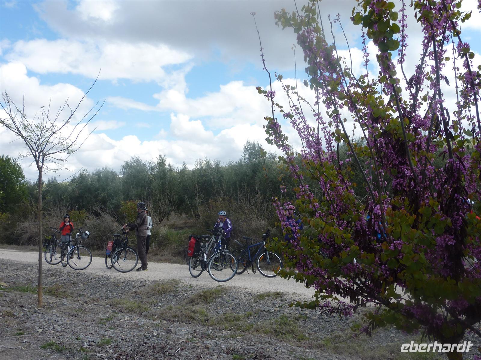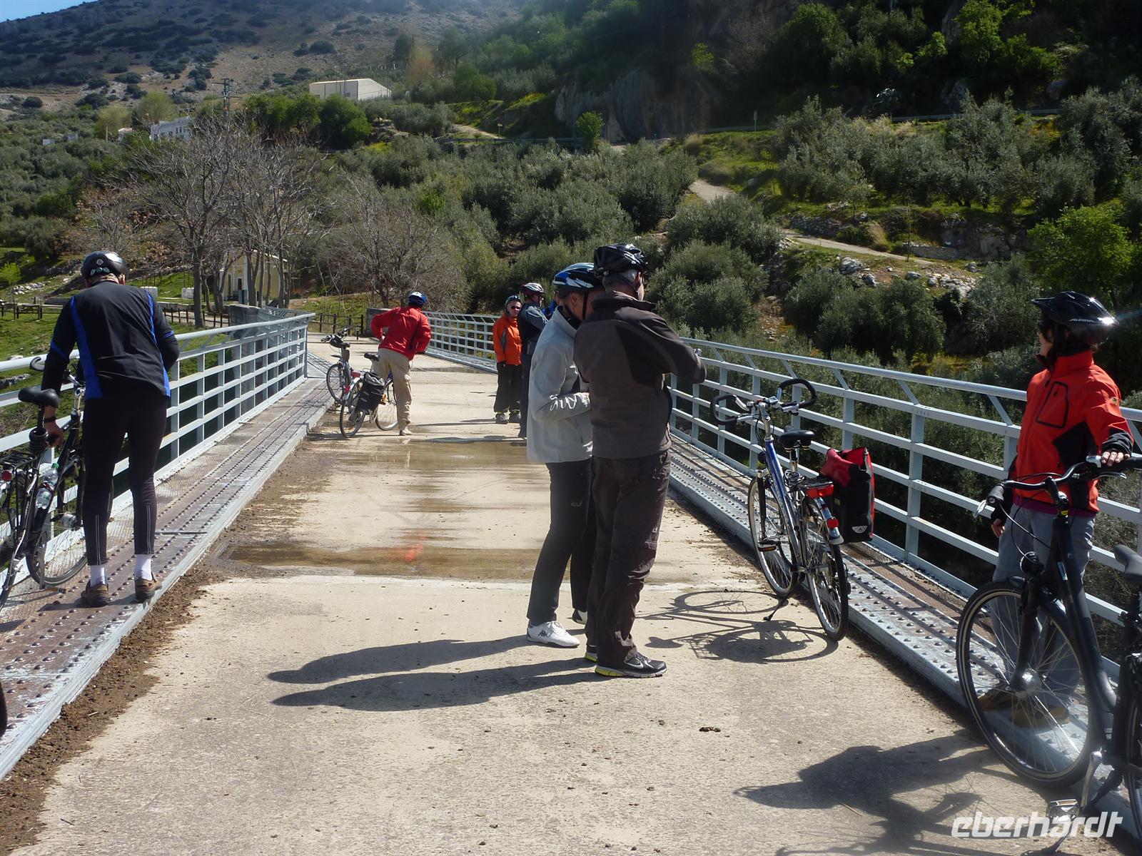 Zur spanisch typischen Zeit um 08:30 Uhr frühstückten wir im Salon mit herrlichem Blick auf die Landschaft der weitflächigen Olivenhaine. Anschließend fuhren wir zum Startpunkt der heutigen Radtour in Lucena. Wir luden in Ruhe die Räder aus, nahmen noch notwendige Einstellarbeiten vor und los ging es. Die Strecke führte uns entlang der Via Verde de la Subbetica immer wieder vorbei an malerisch gelegenen Ortschaften und mit ständig wechselnden und beeindruckenden Landschaftssichten. Der Radweg aus festem Untergrund ließ sich sehr angenehm befahren. In Cabra legten wir eine erste kleine Rast ein. Die Temperaturen waren noch etwas frisch, aber trocken und das war entscheidend. Später ließ sich die Sonne immer öfter blicken, so dass die Temperaturen in einem für das Rad fahren angenehmen Bereich lagen. Und wir hatten Rückenwind! Unsere Mittagsrast hatte unser Buschauffeur an einem landschaftlich malerischen Punkt eingerichtet. Es gab mit spanischem Serrano Schinken und spanischem Käse belegte Brötchen, dazu frisches Gemüse